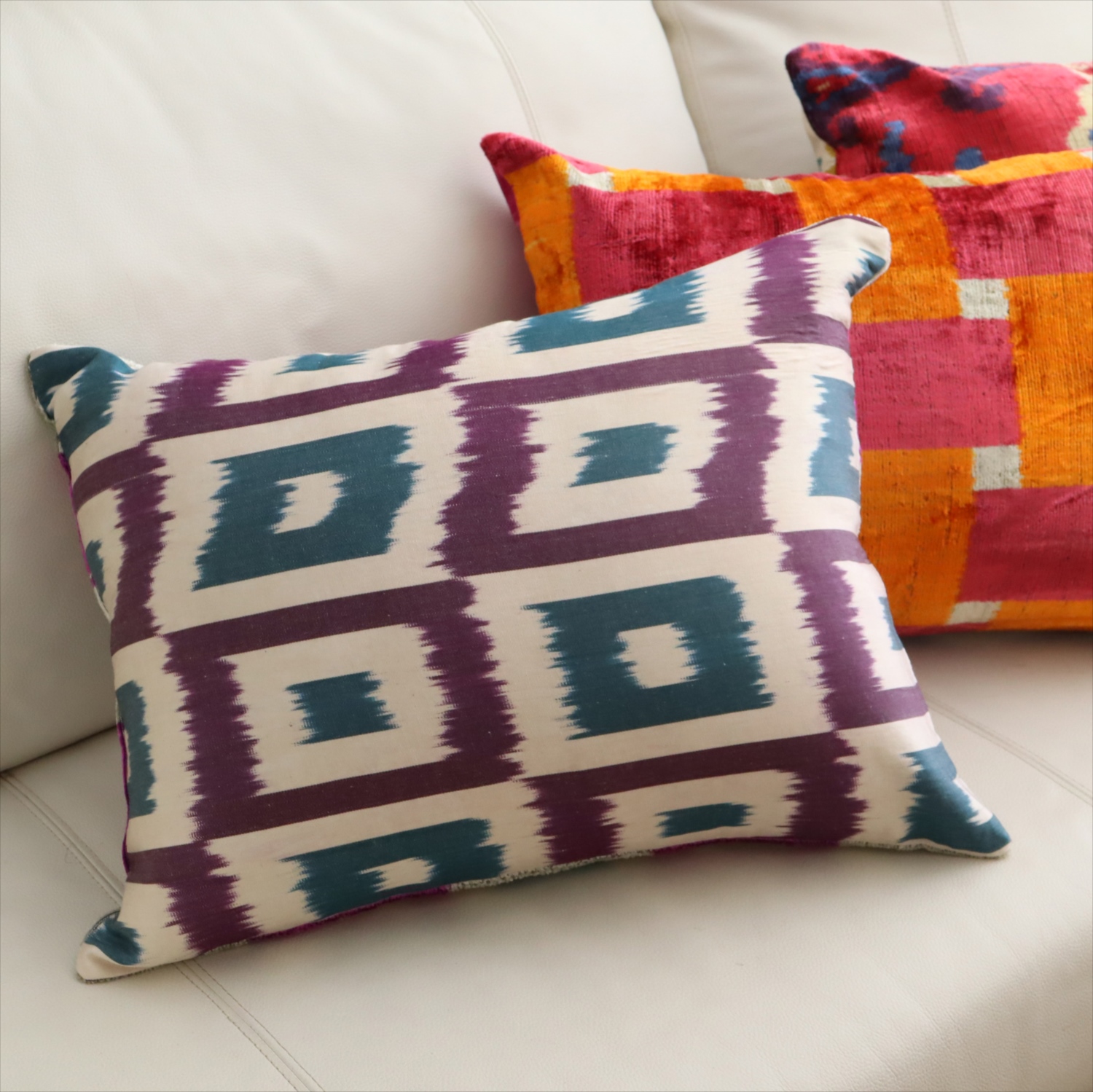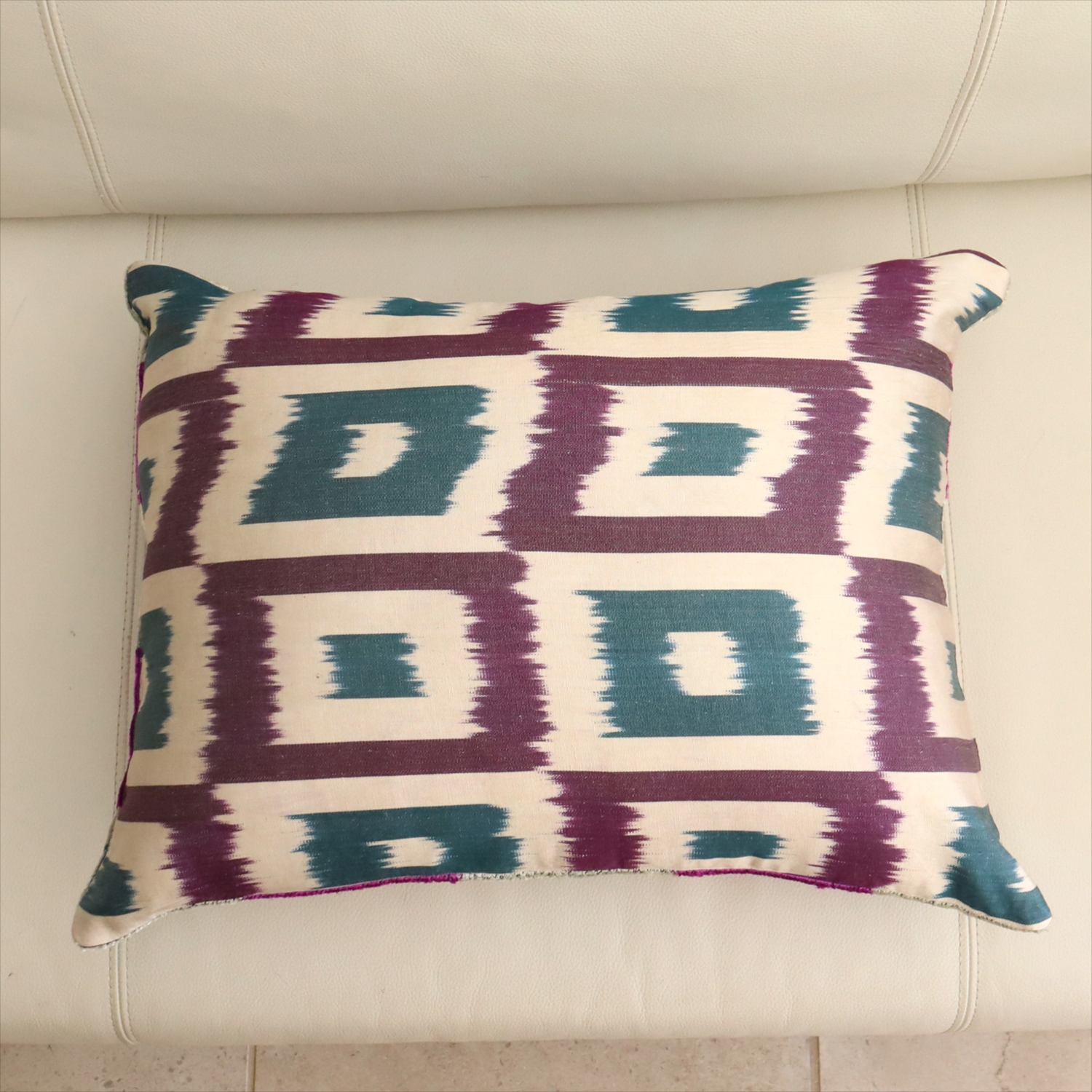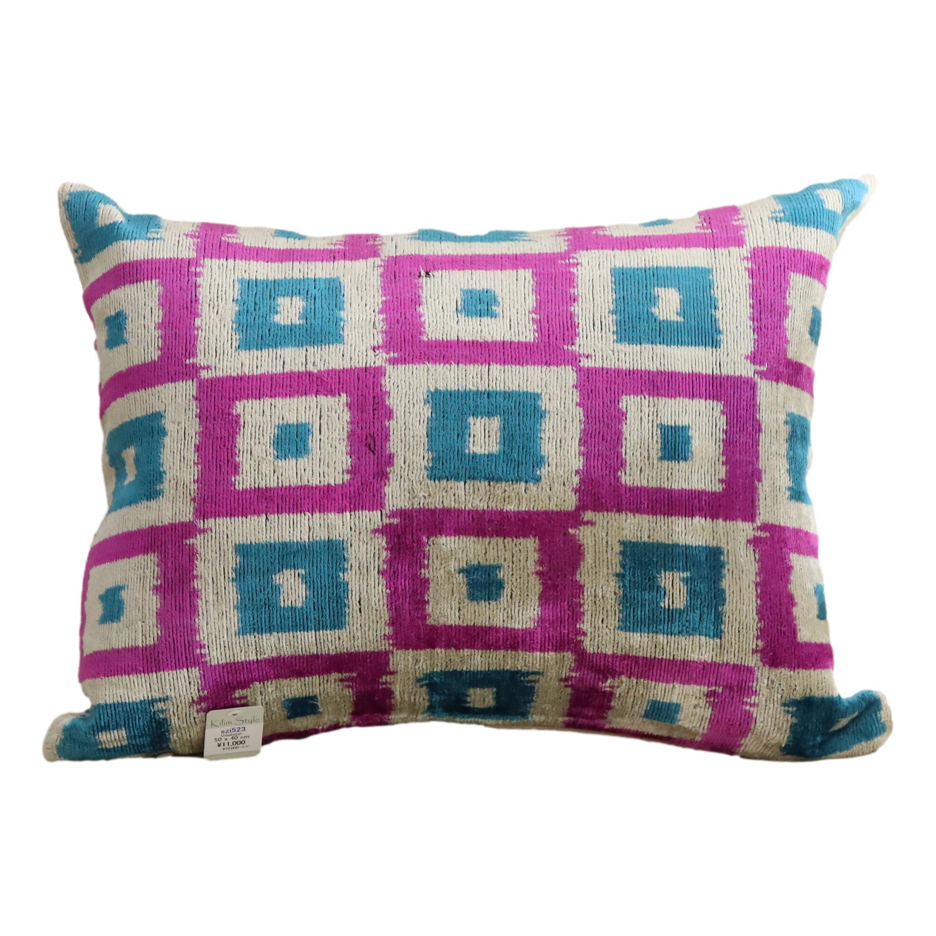 ウズベキスタンで「アトラス」と呼ばれる、中央アジアの女性たちの衣装用に織られた、手機織りの絣布(かすり・イカット)を使ったクッションカバー。