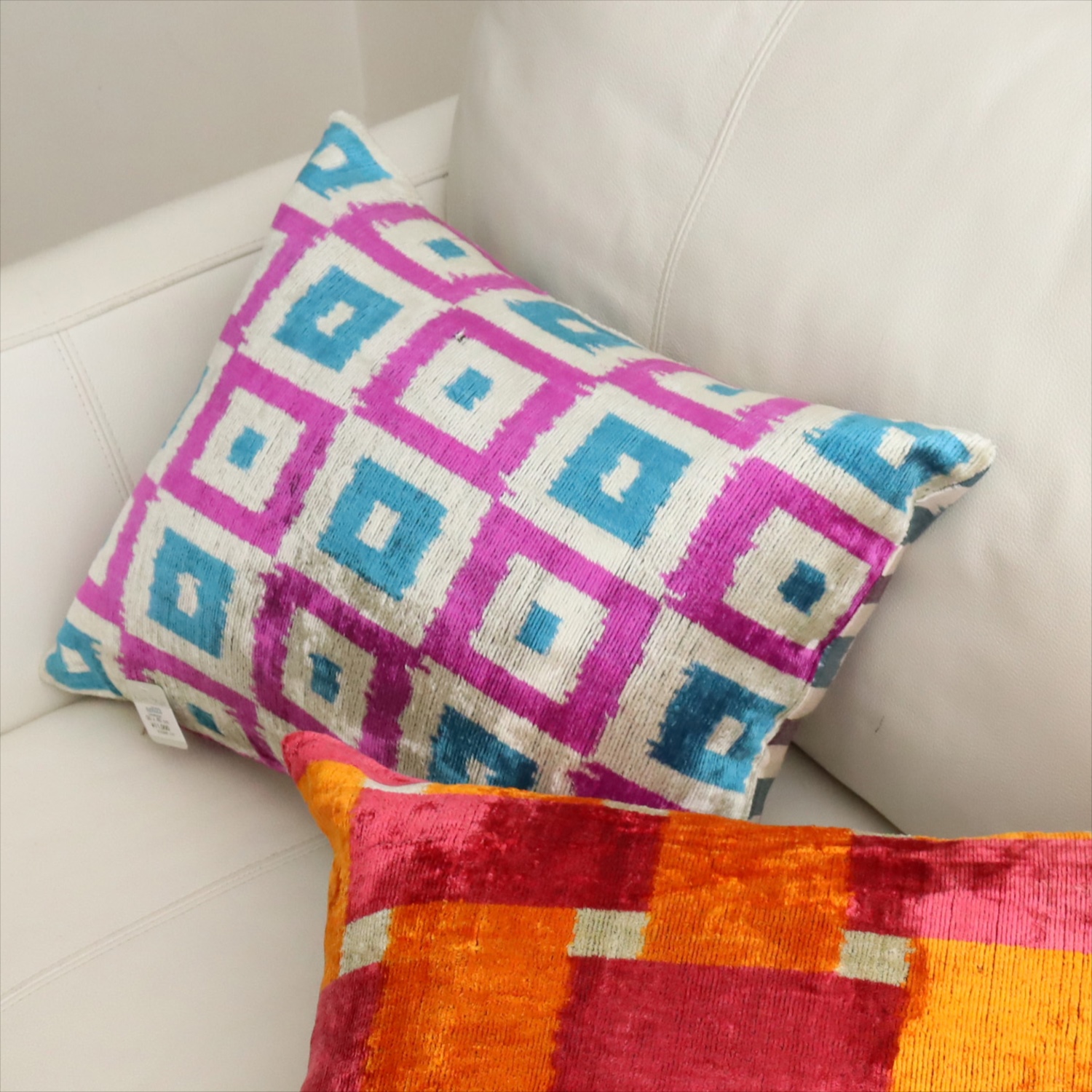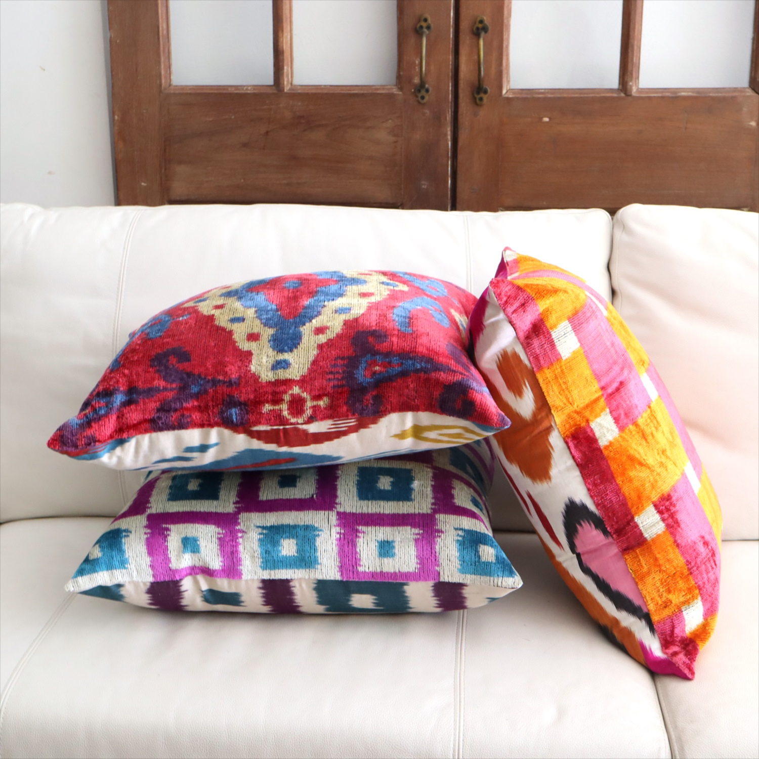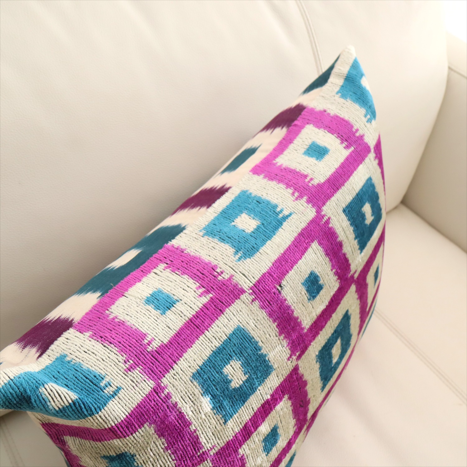 ウズベキスタンで「アトラス」と呼ばれる、中央アジアの女性たちの衣装用に織られた、手機織りの絣布(かすり・イカット)を使ったクッションカバー。