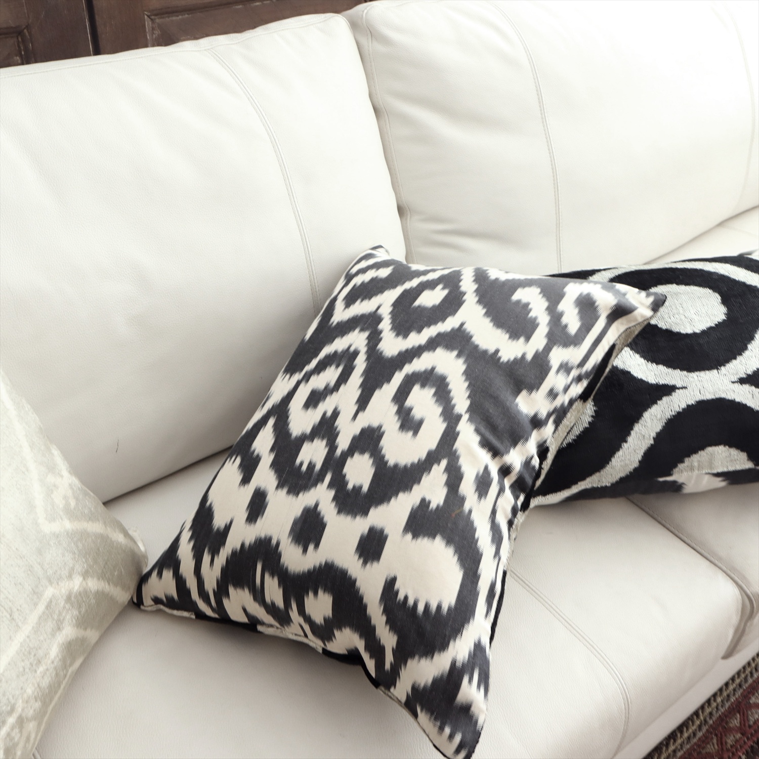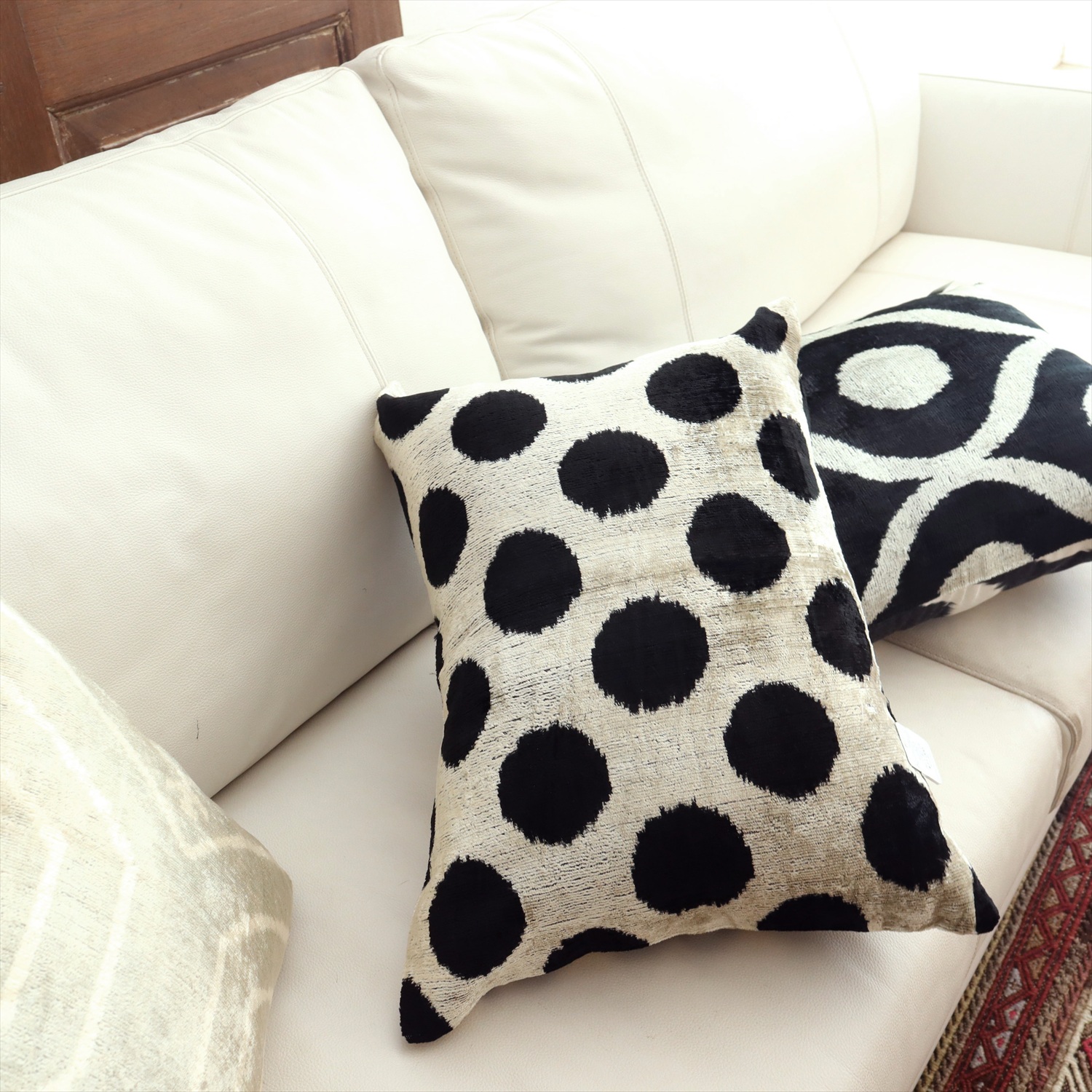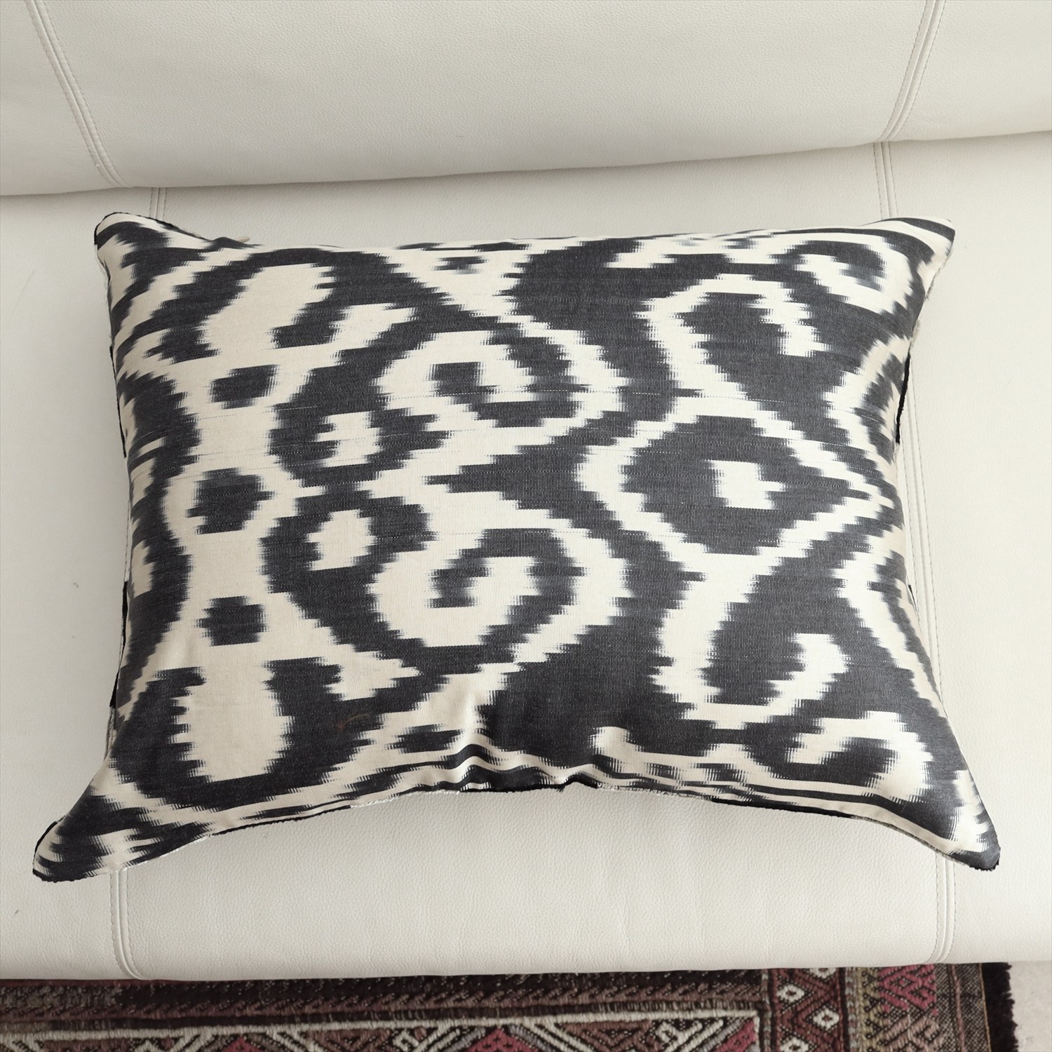 ウズベキスタンで「アトラス」と呼ばれる、中央アジアの女性たちの衣装用に織られた、手機織りの絣布(かすり・イカット)を使ったクッションカバー。
