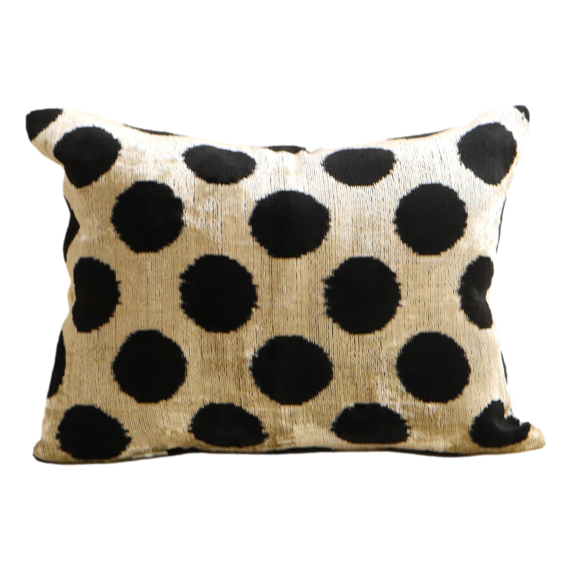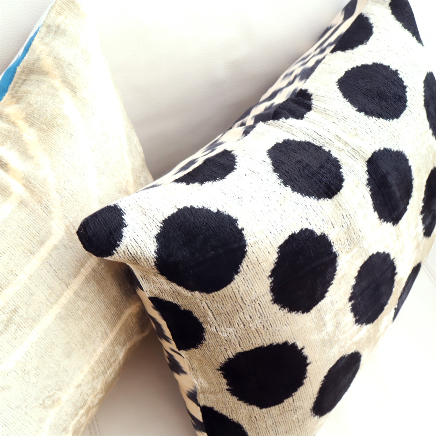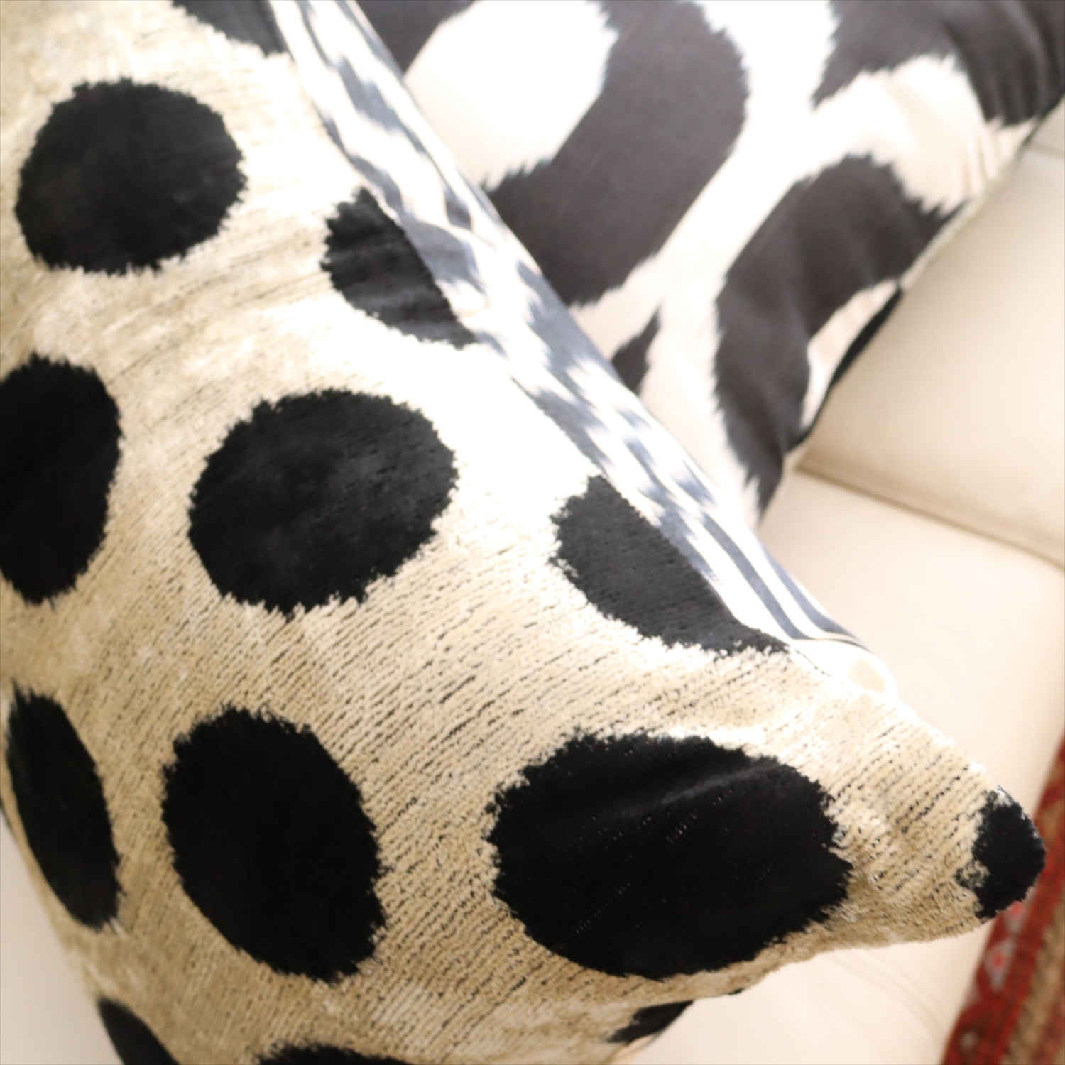 ウズベキスタンで「アトラス」と呼ばれる、中央アジアの女性たちの衣装用に織られた、手機織りの絣布(かすり・イカット)を使ったクッションカバー。