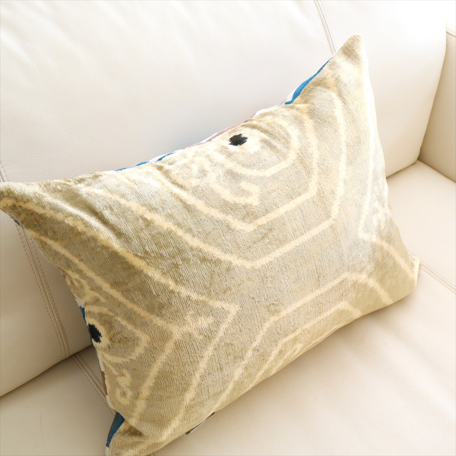 表面は起毛(ベルベット)していて柔らかな手触り。裏面はシルク素材のイカット(絣織り)になっています。