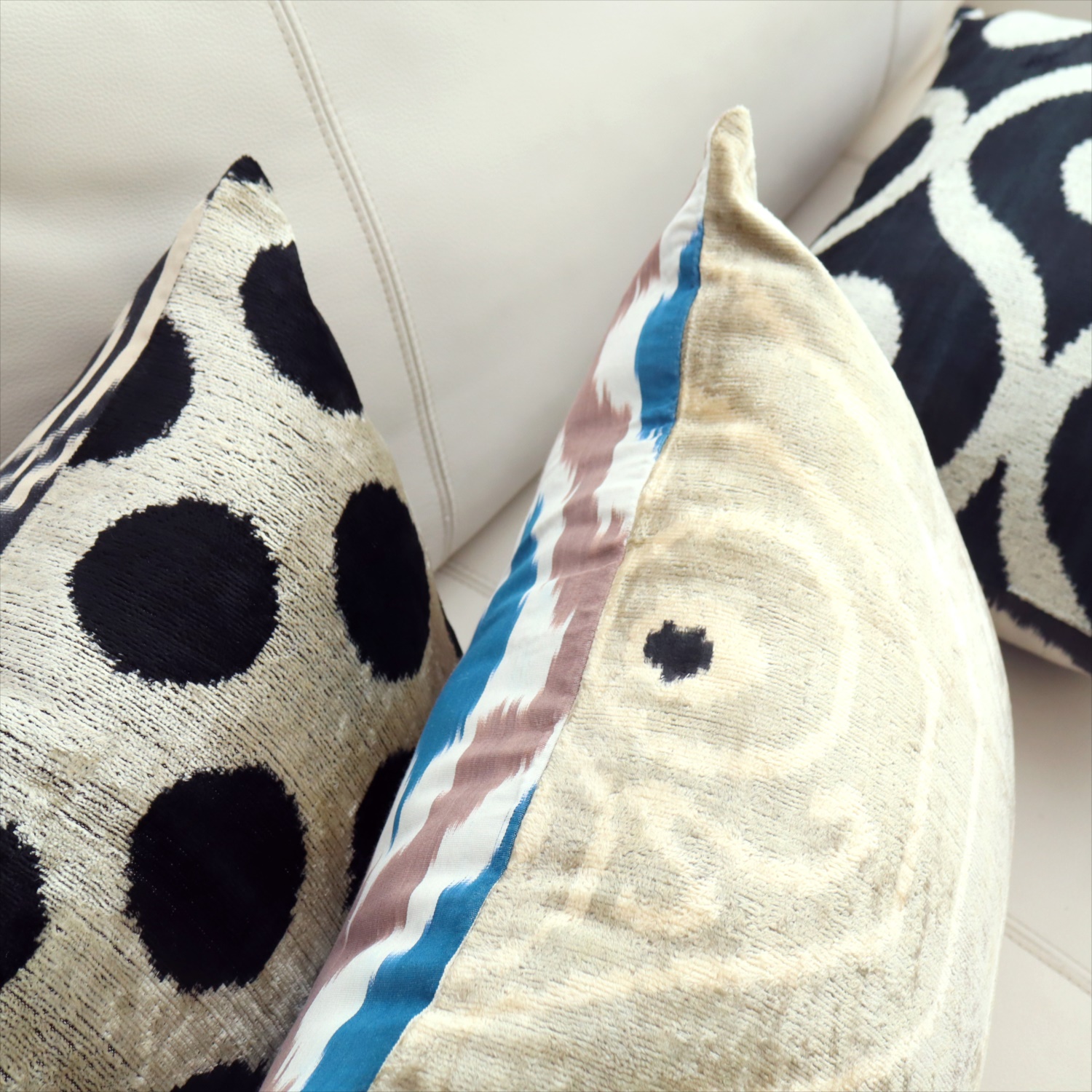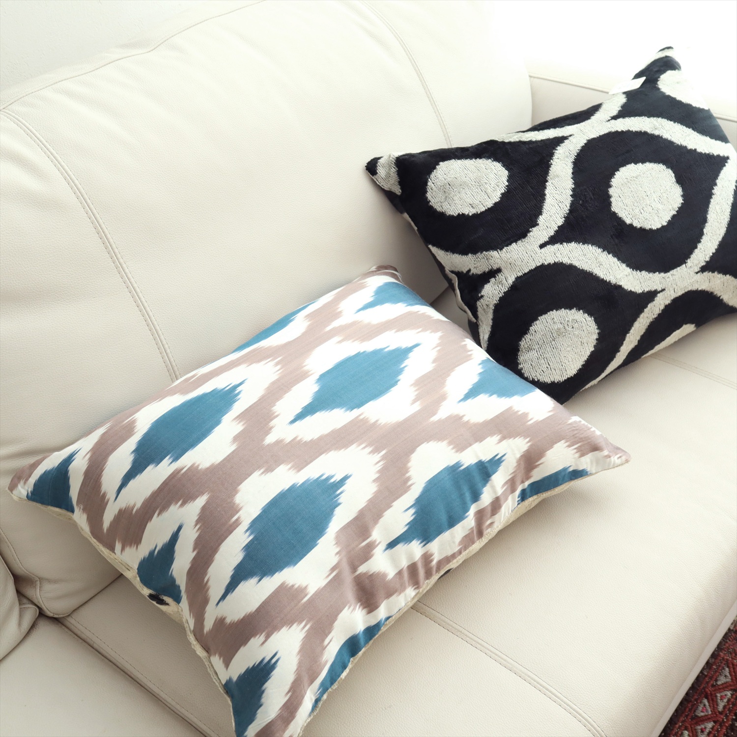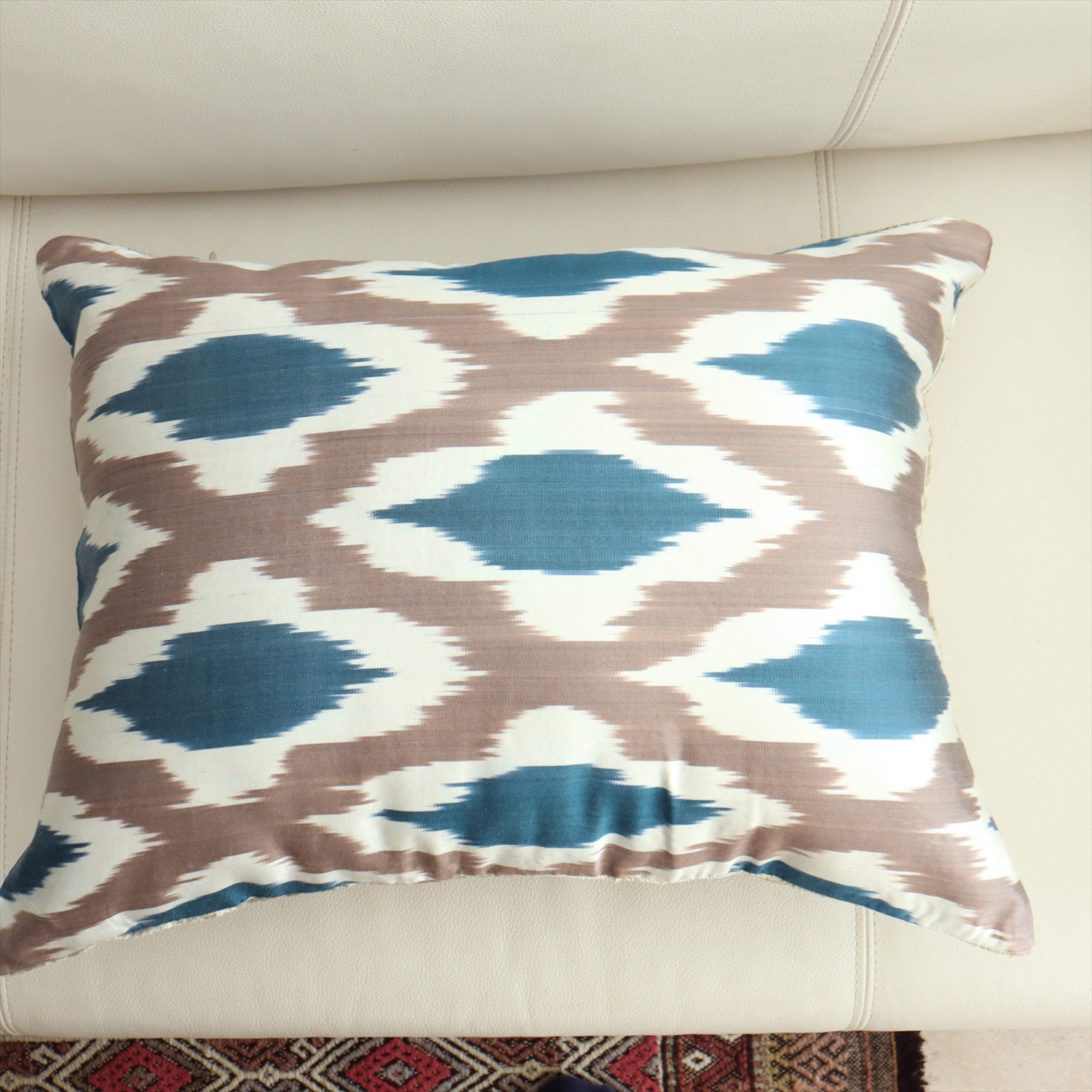 ウズベキスタンで「アトラス」と呼ばれる、中央アジアの女性たちの衣装用に織られた、手機織りの絣布(かすり・イカット)を使ったクッションカバー。