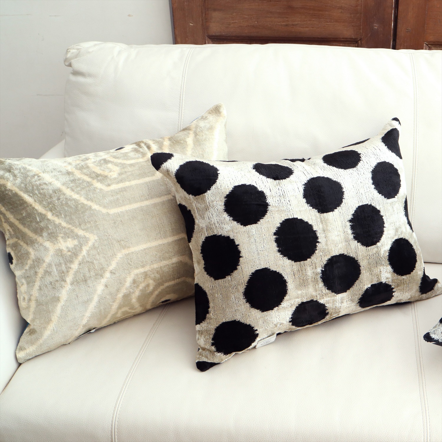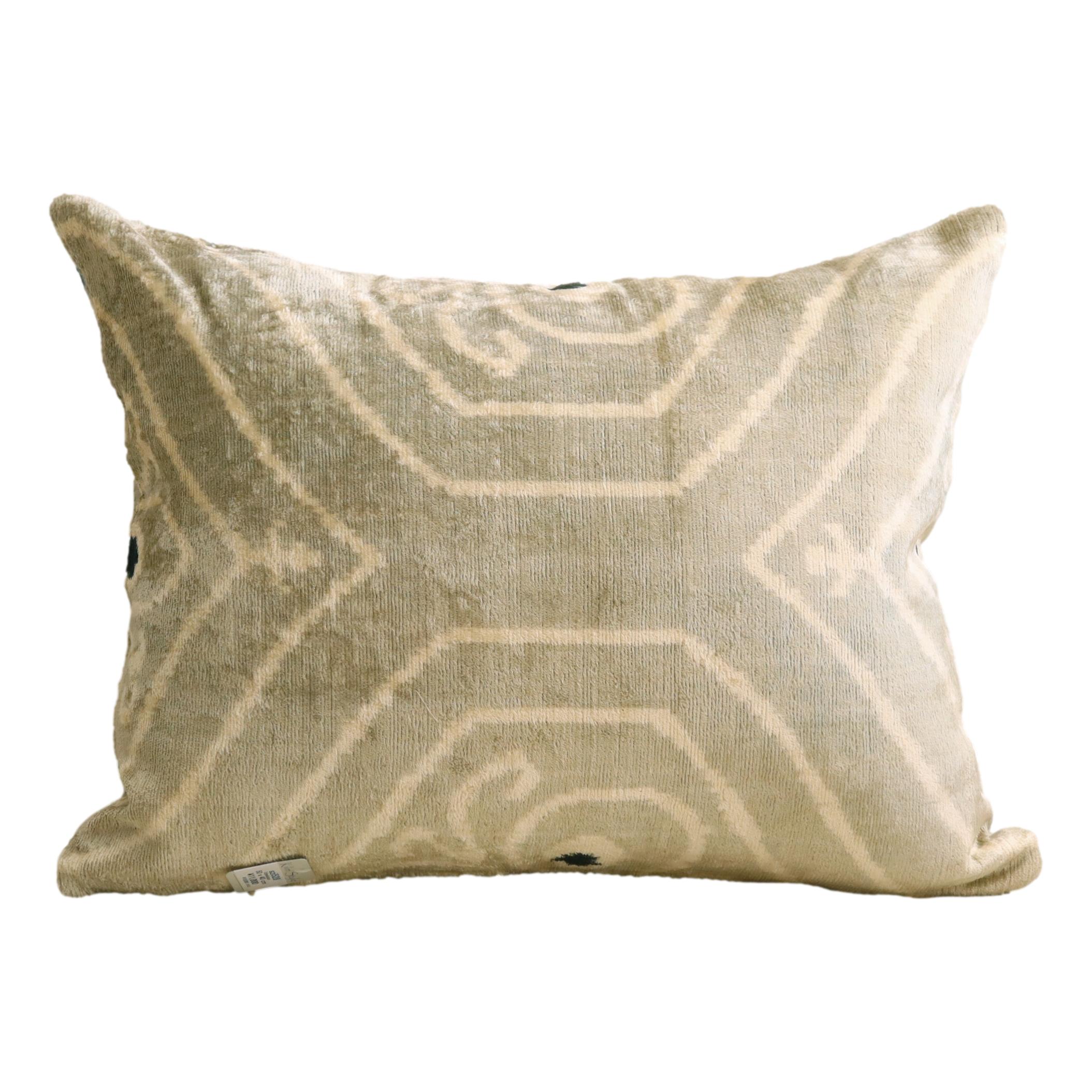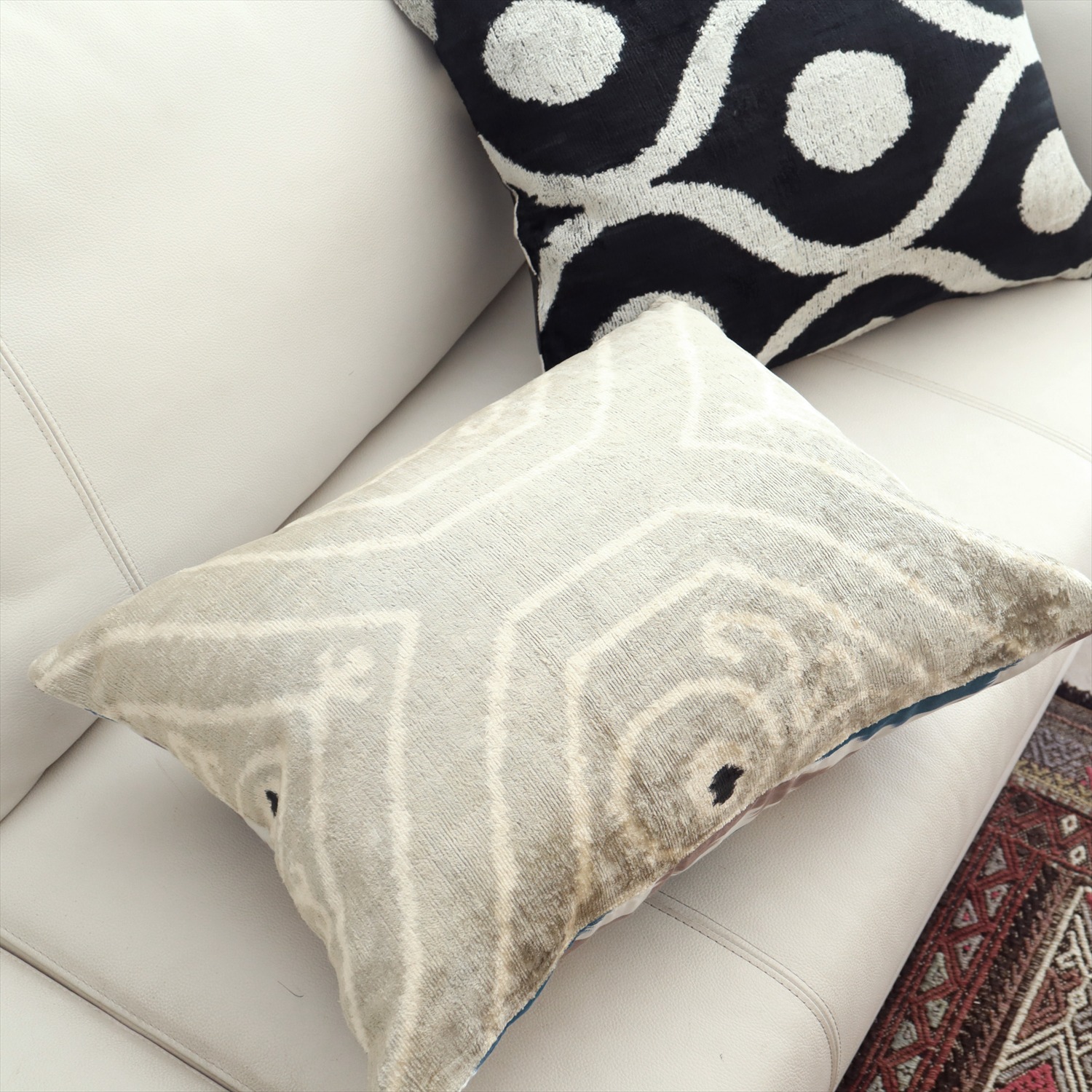 ウズベキスタンで「アトラス」と呼ばれる、中央アジアの女性たちの衣装用に織られた、手機織りの絣布(かすり・イカット)を使ったクッションカバー。