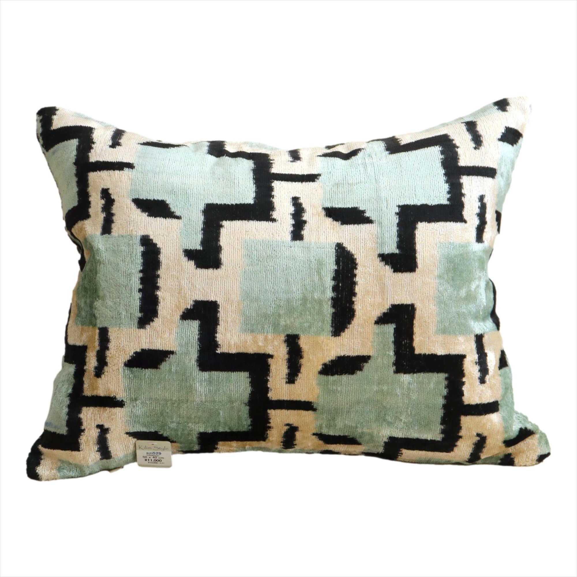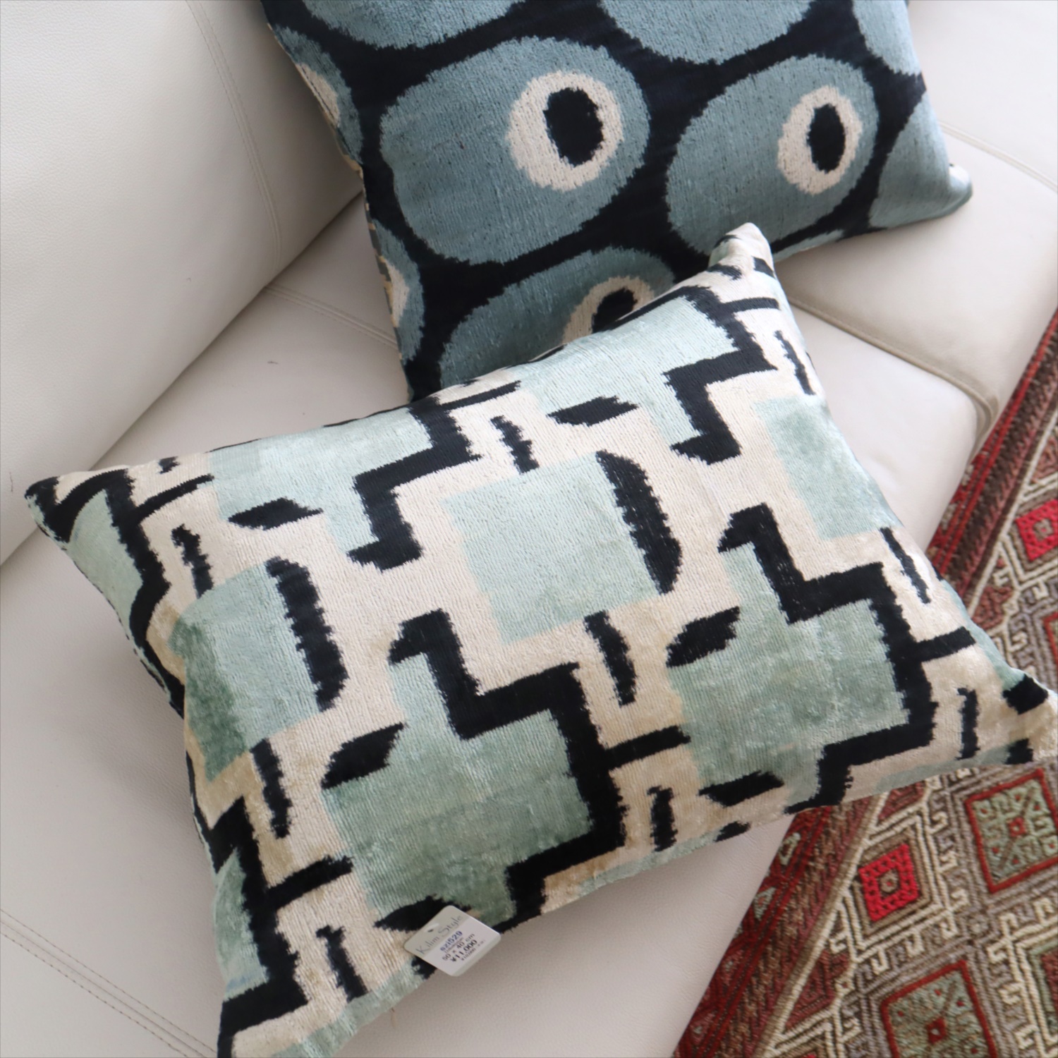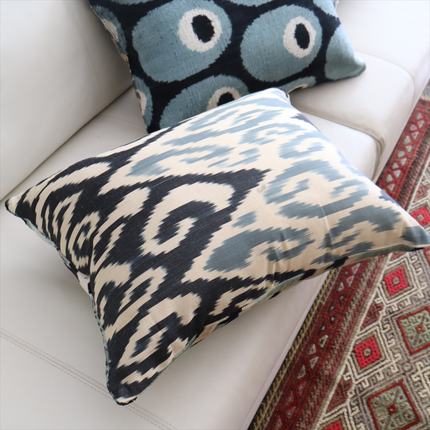 ウズベキスタンで「アトラス」と呼ばれる、中央アジアの女性たちの衣装用に織られた、手機織りの絣布(かすり・イカット)を使ったクッションカバー。