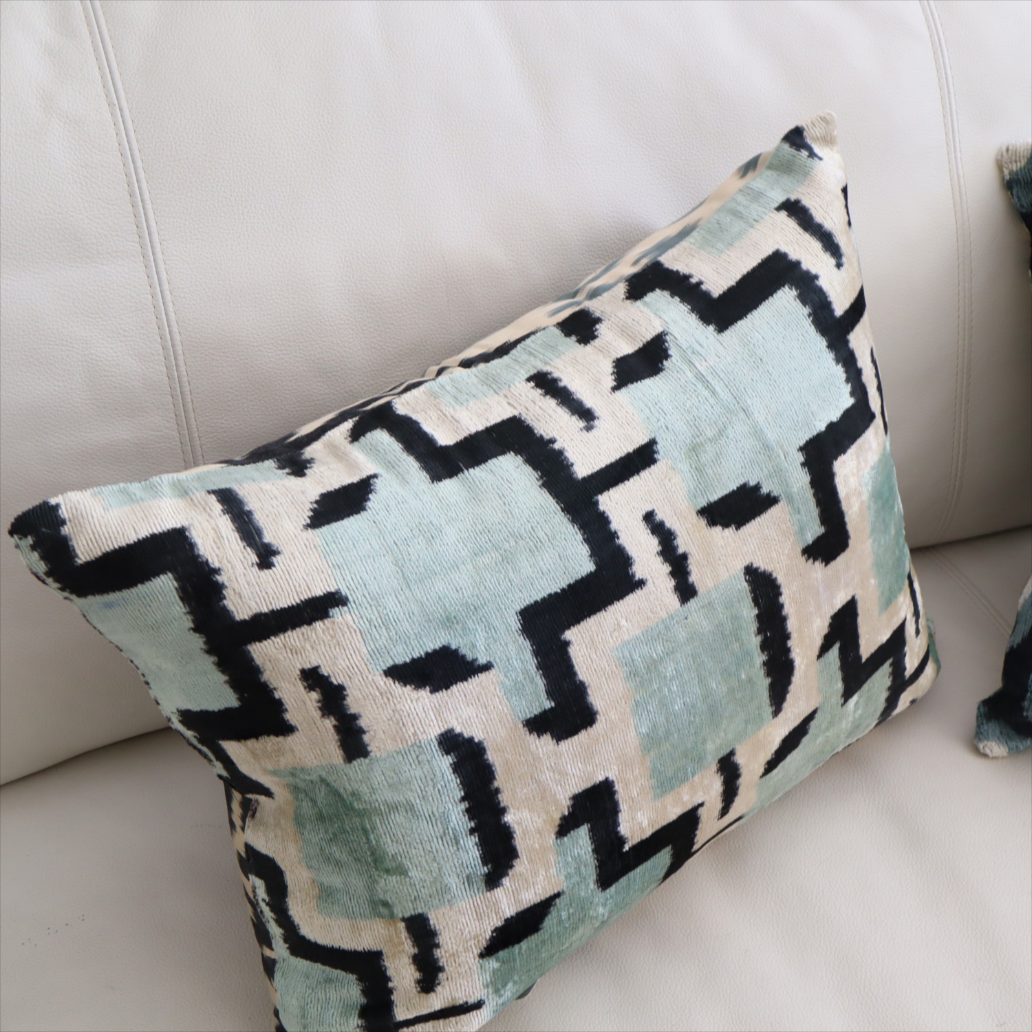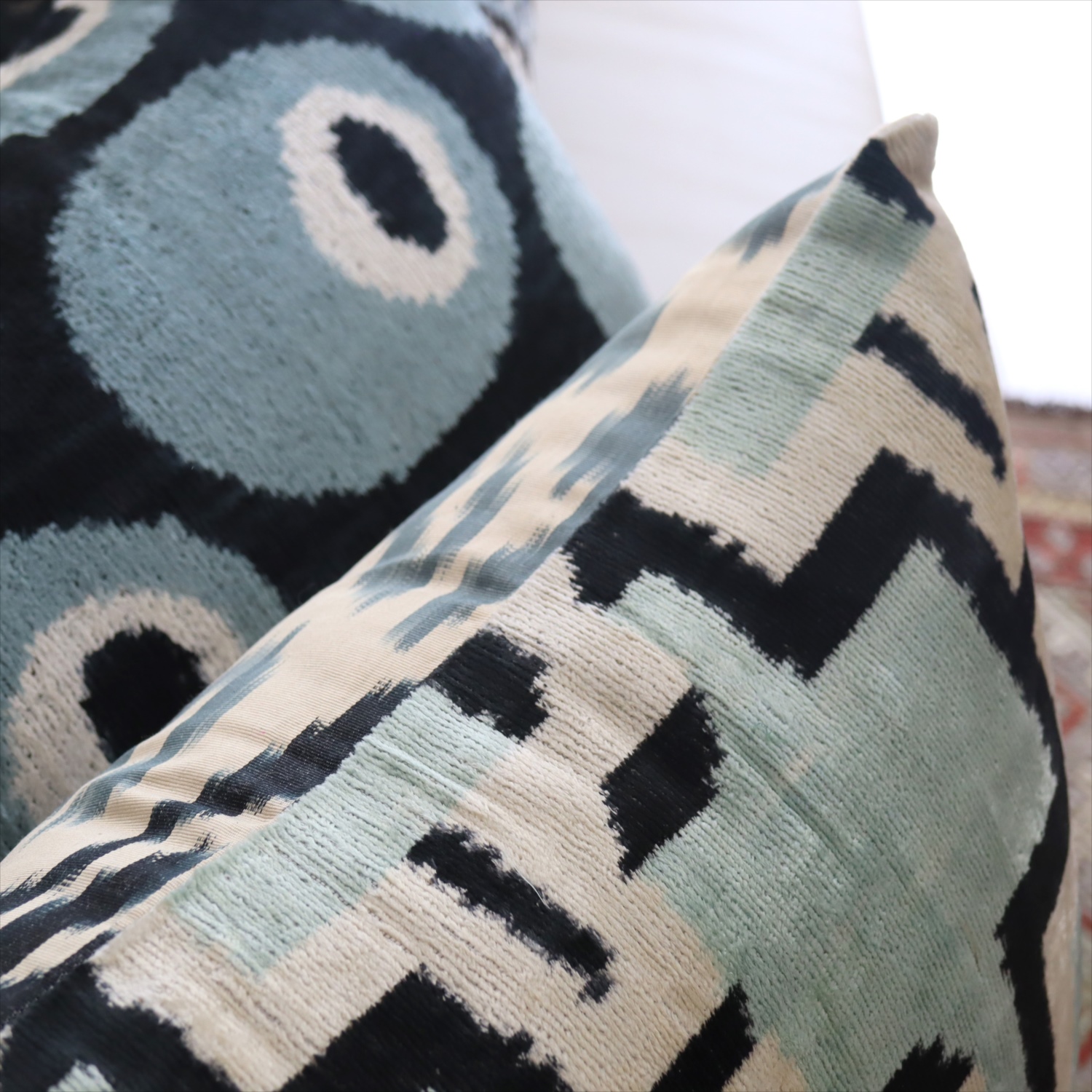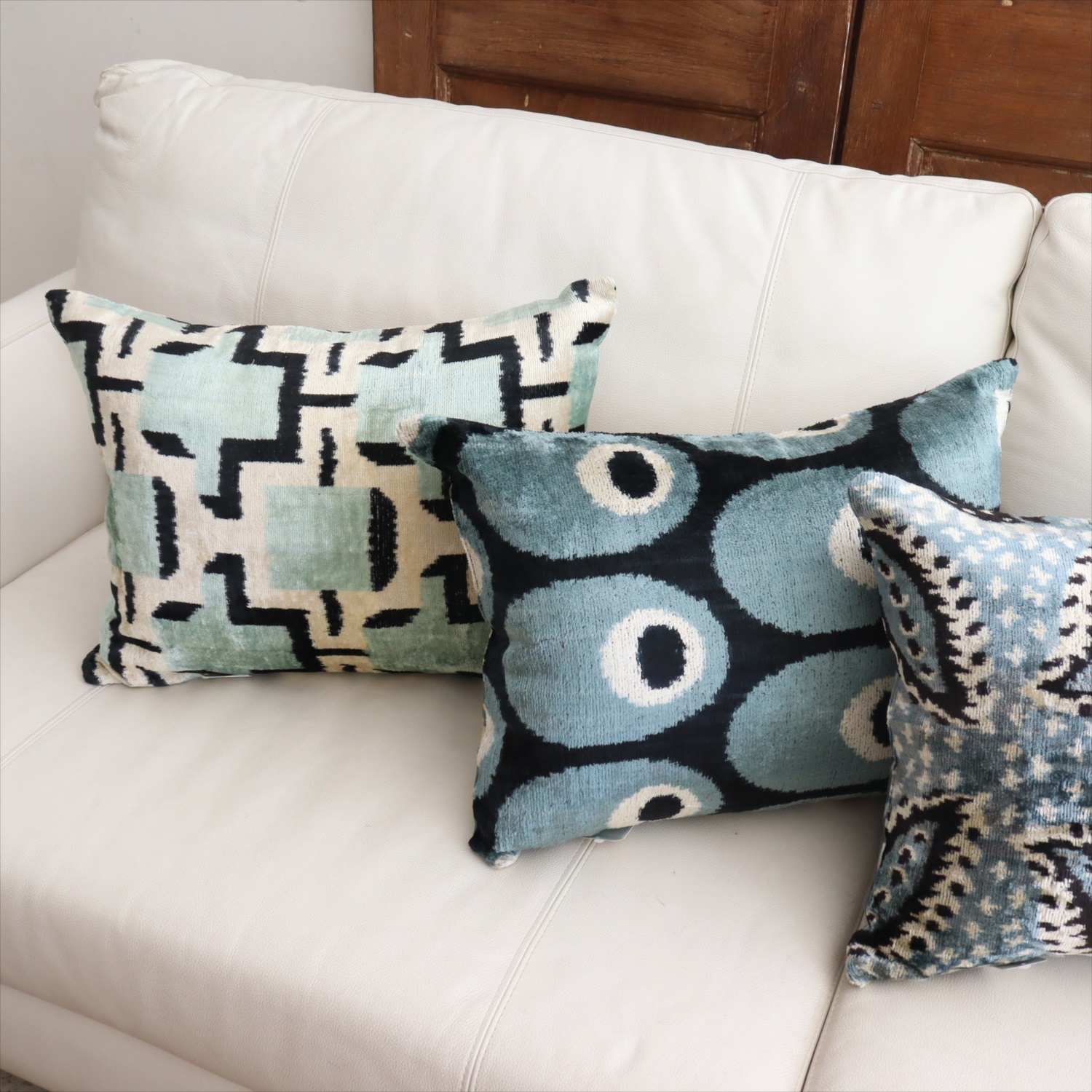 ウズベキスタンで「アトラス」と呼ばれる、中央アジアの女性たちの衣装用に織られた、手機織りの絣布(かすり・イカット)を使ったクッションカバー。