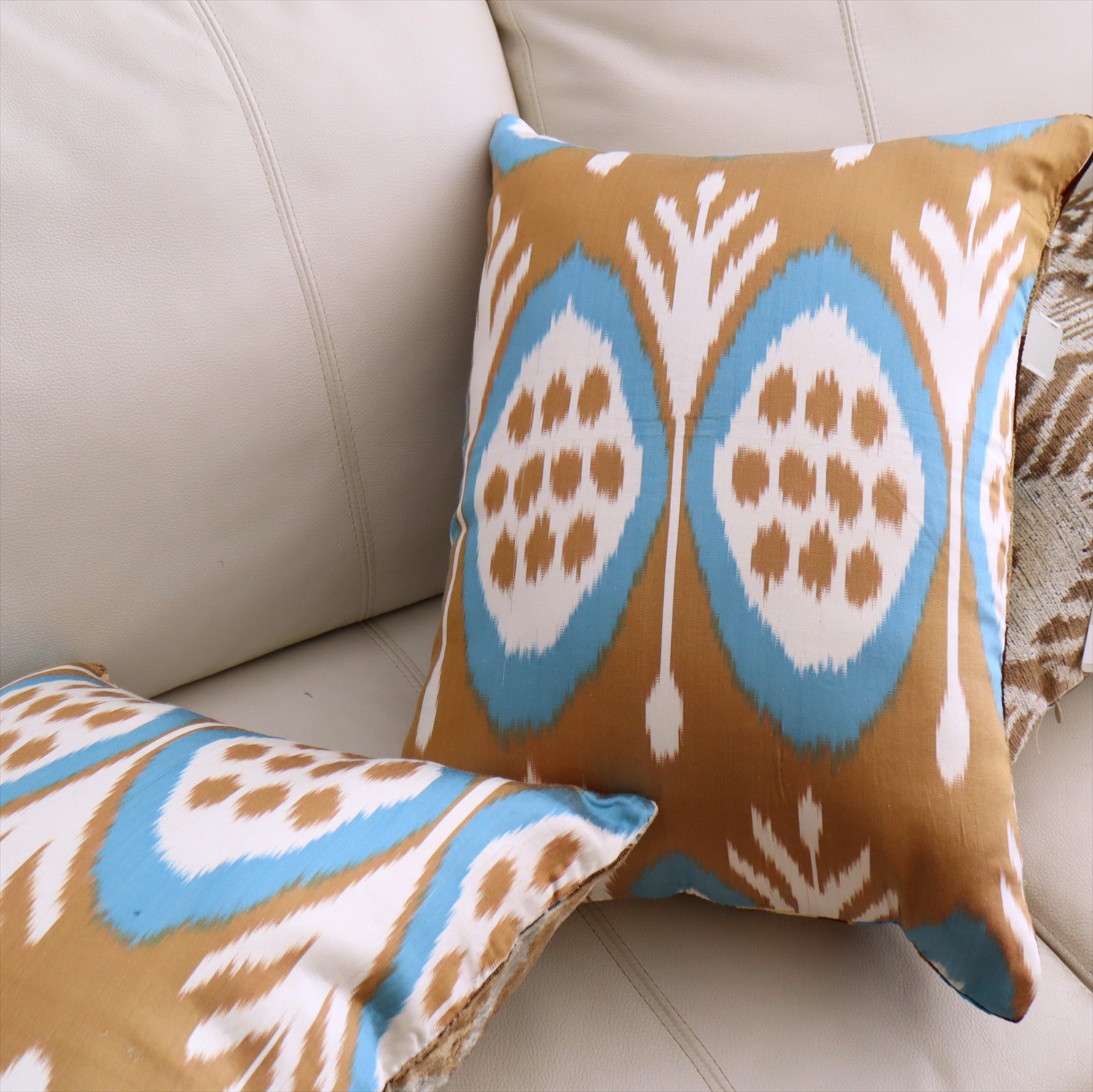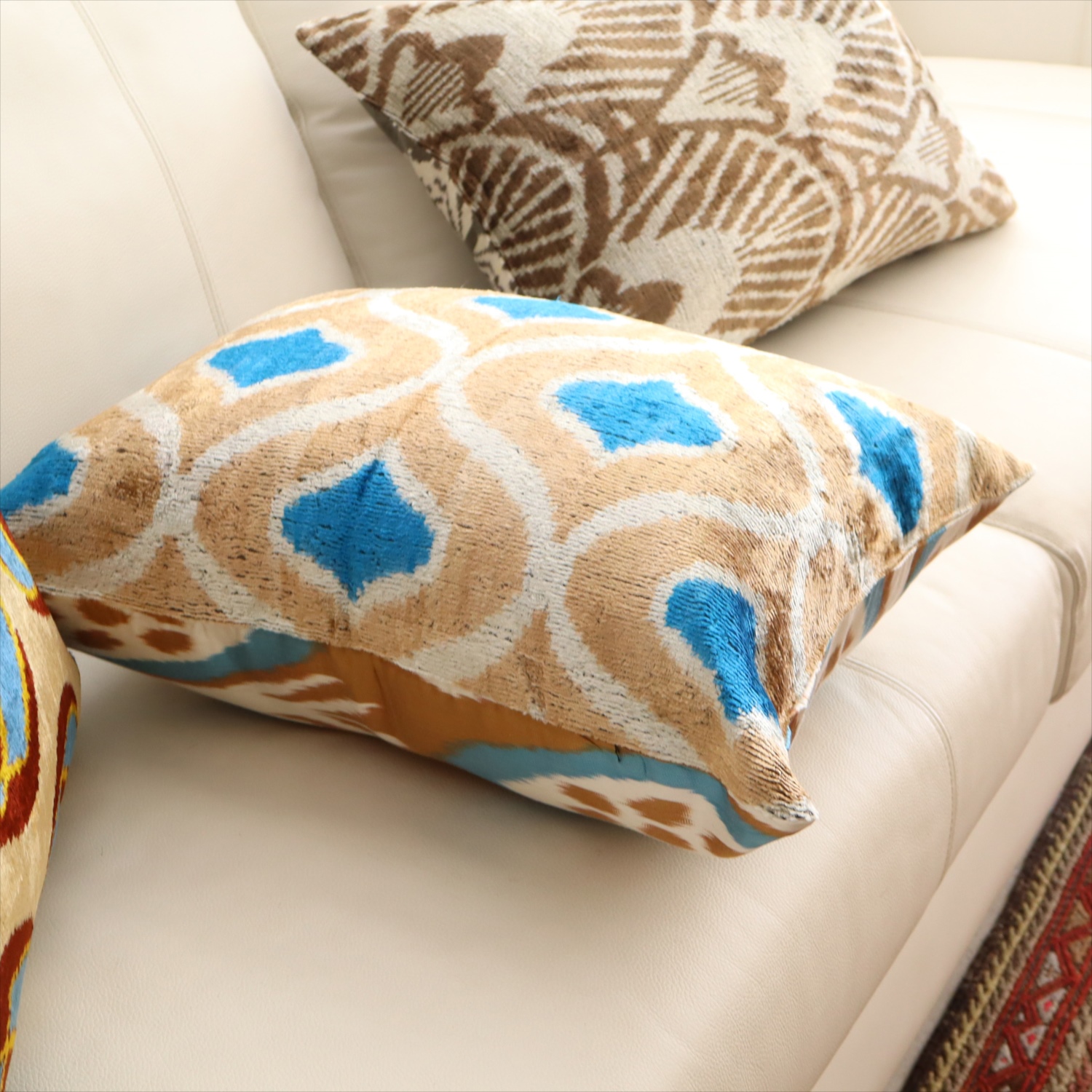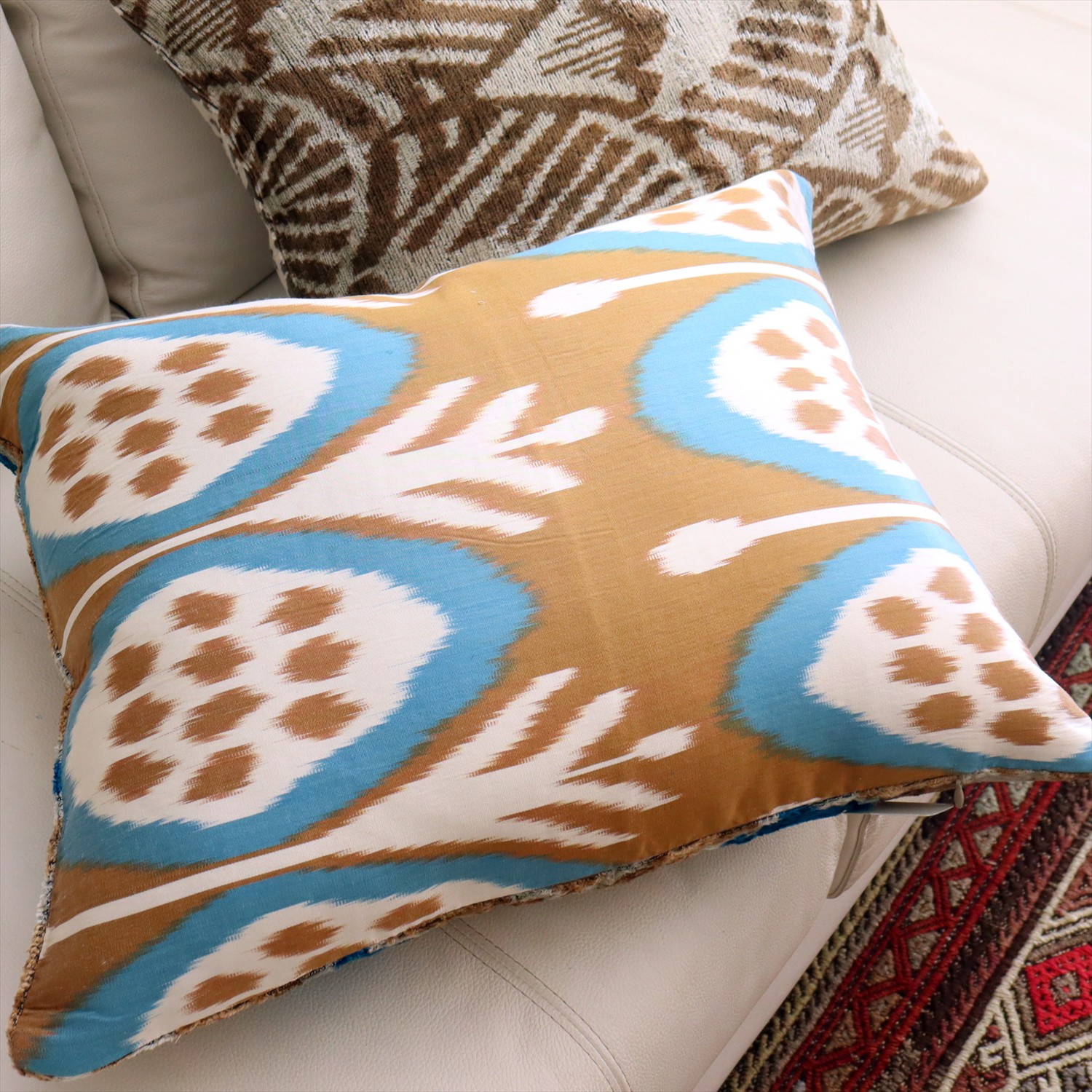 ウズベキスタンで「アトラス」と呼ばれる、中央アジアの女性たちの衣装用に織られた、手機織りの絣布(かすり・イカット)を使ったクッションカバー。