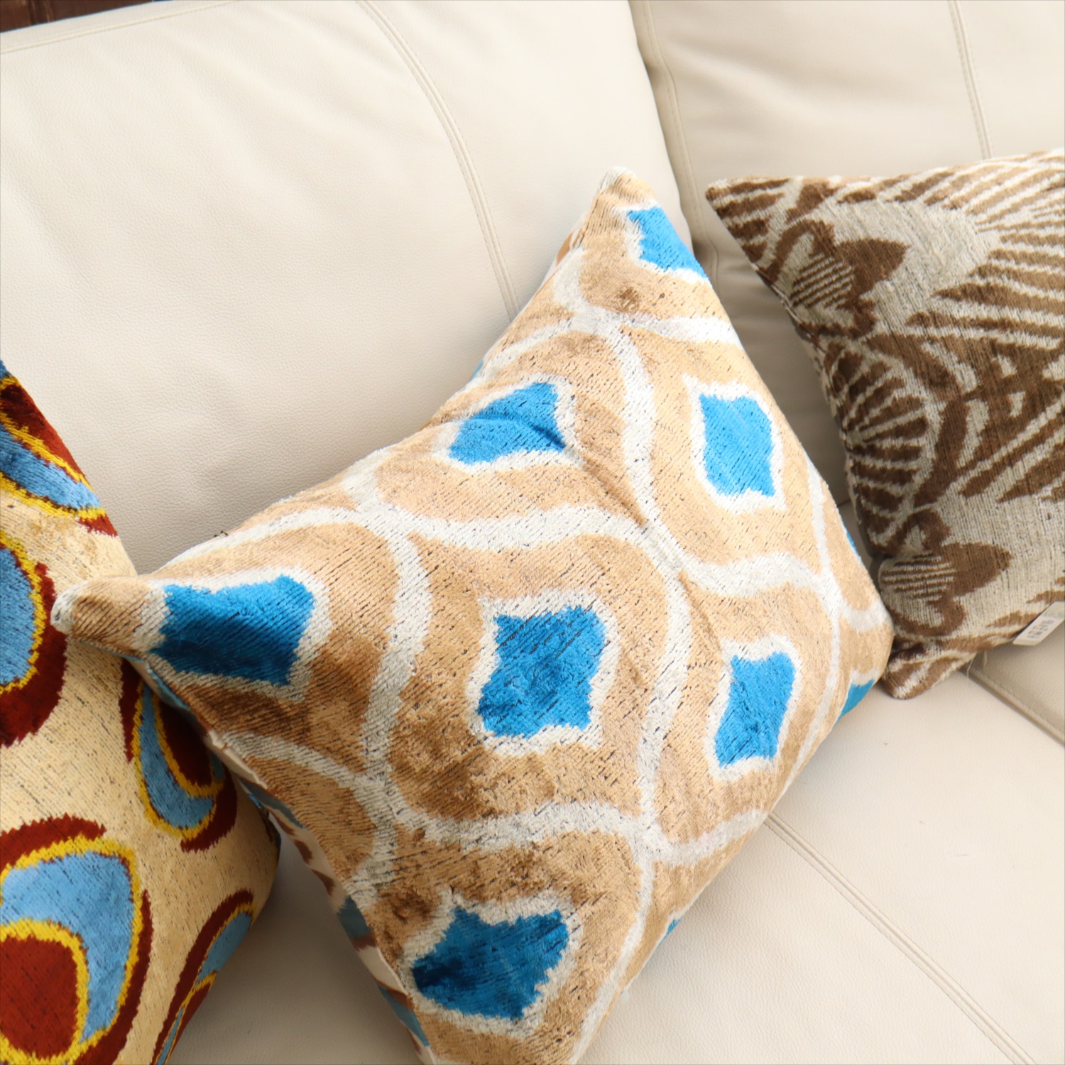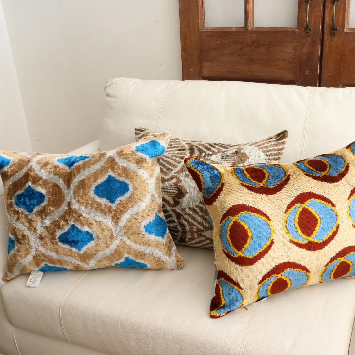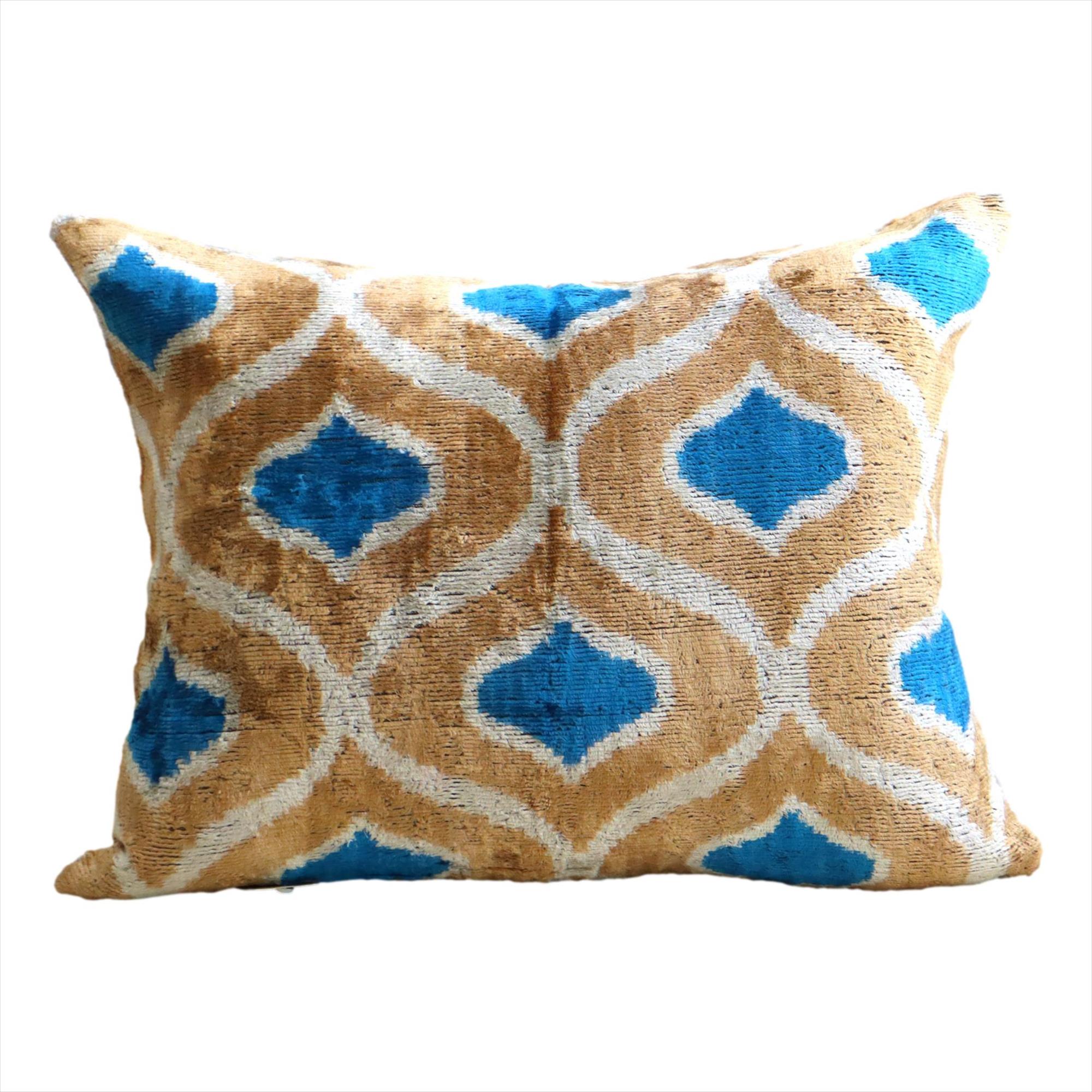 ウズベキスタンで「アトラス」と呼ばれる、中央アジアの女性たちの衣装用に織られた、手機織りの絣布(かすり・イカット)を使ったクッションカバー。