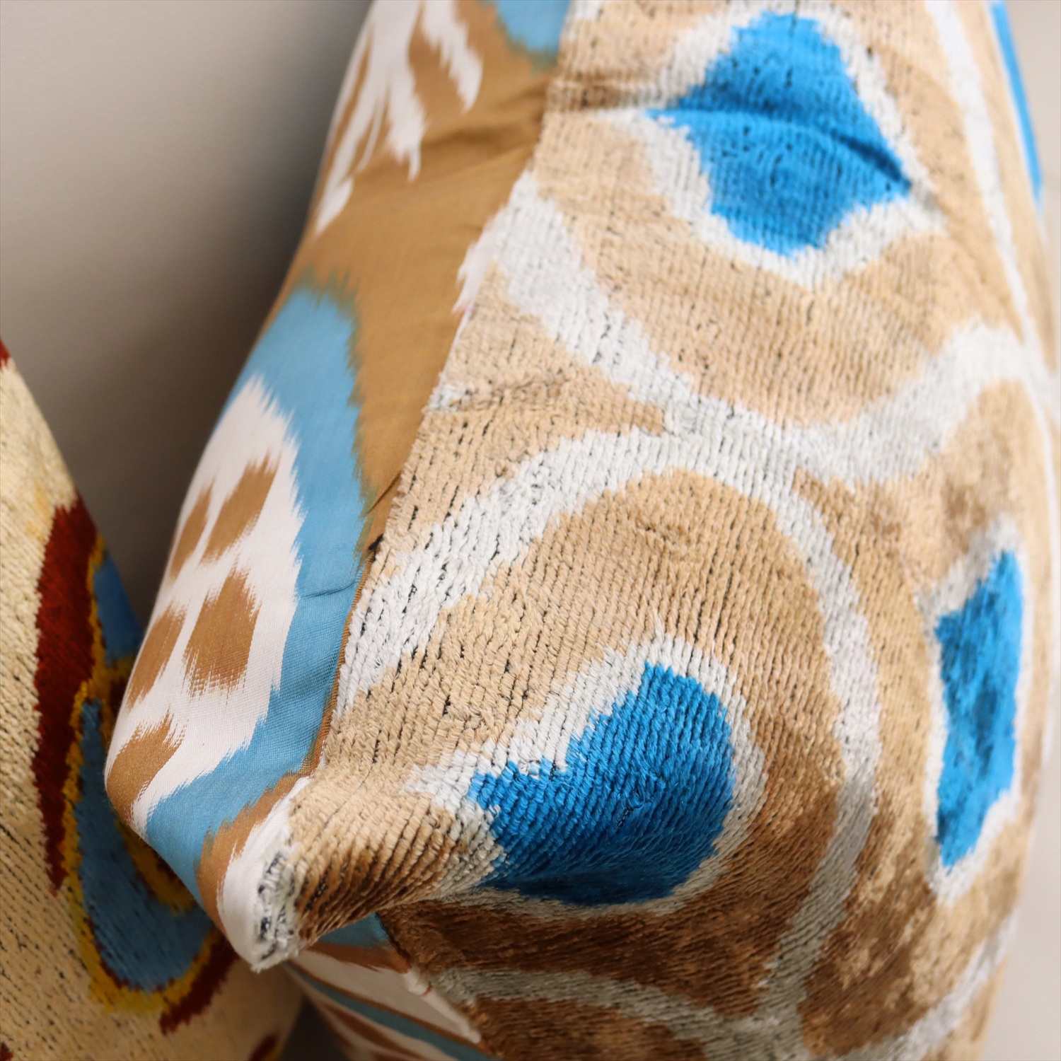 表面は起毛(ベルベット)していて柔らかな手触り。裏面はシルク素材のイカット(絣織り)になっています。