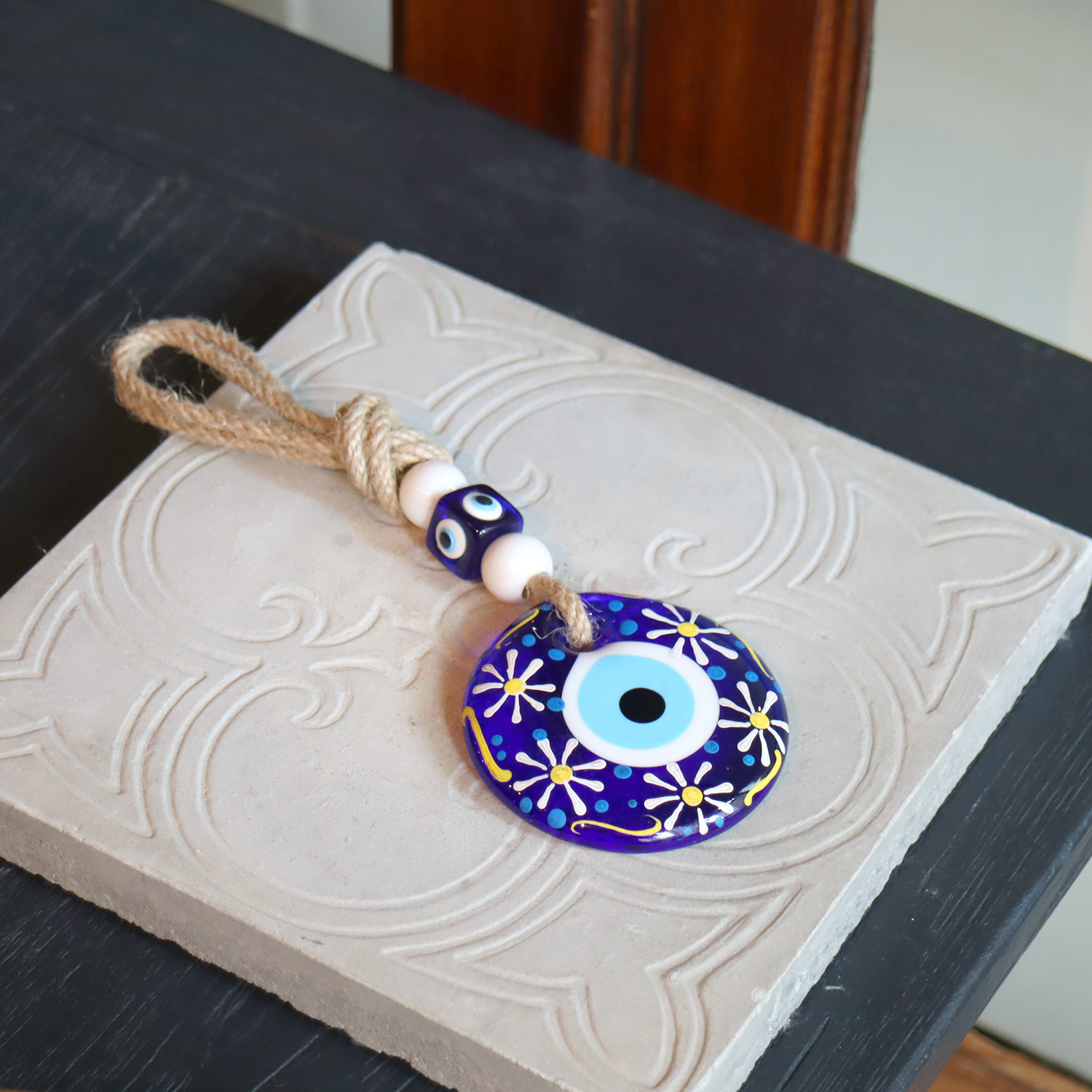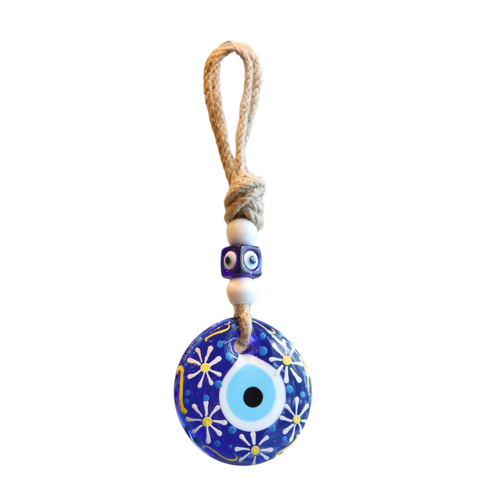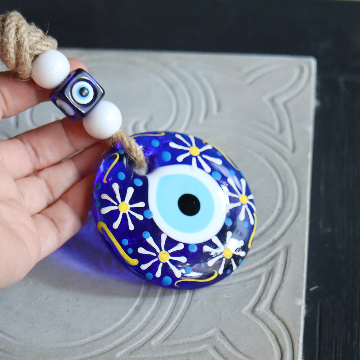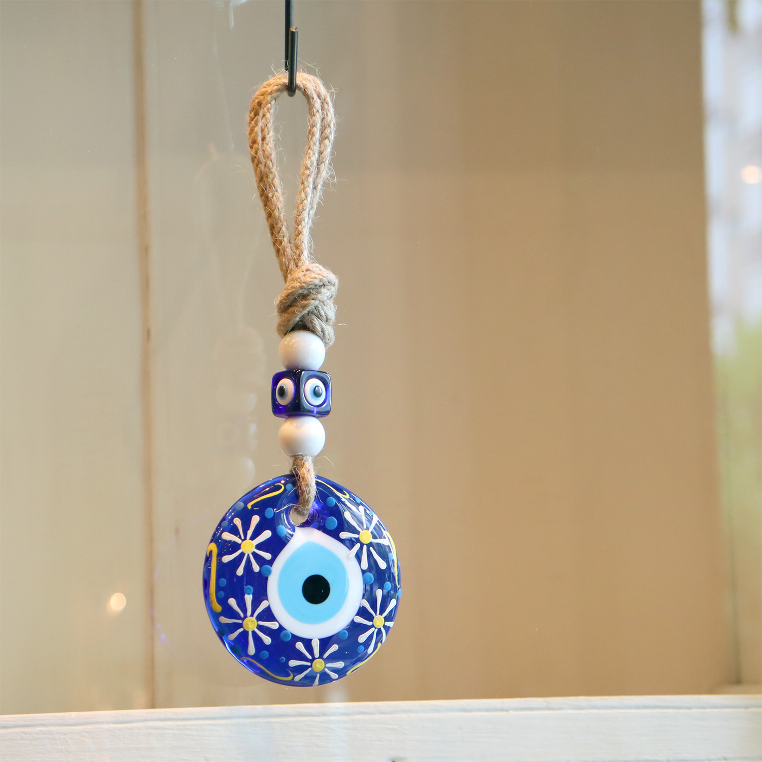 青いガラスがきれいなナザルボンジュウに、ハンドペイントで白いお花の絵付けをしてあります。ドアや窓の近くなどに飾って、お楽しみください。