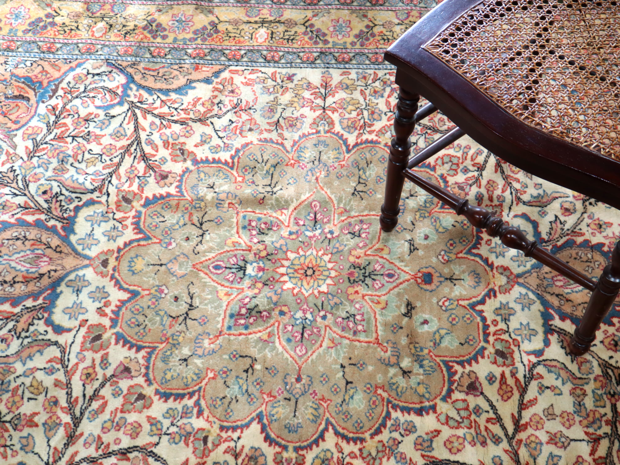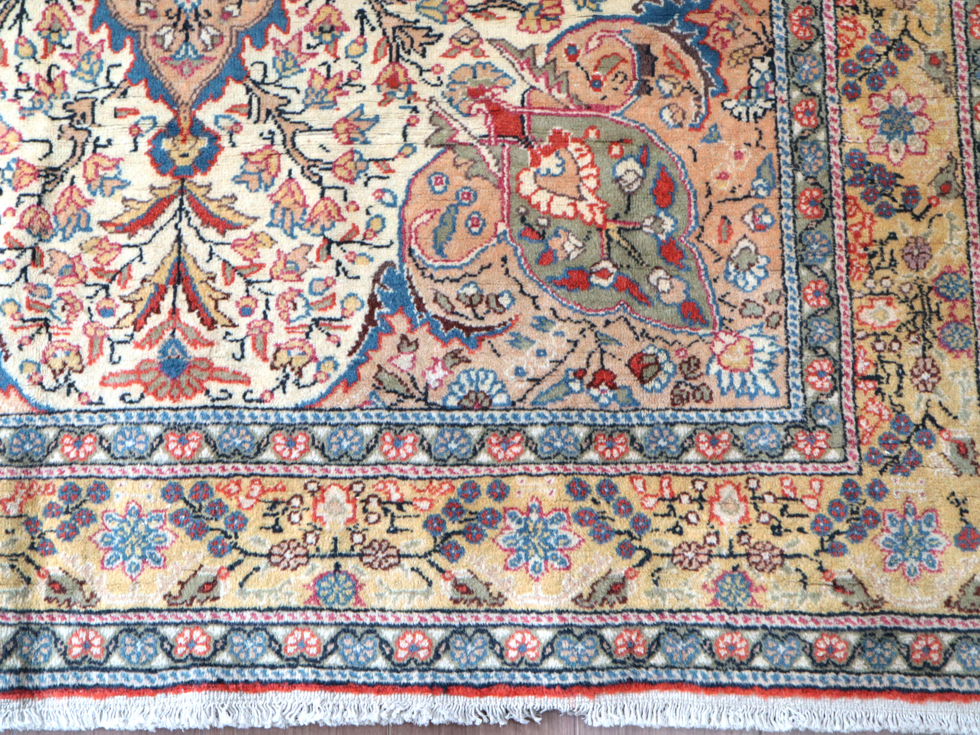 クラシカルなデザインのカイセリ地方で織られた手織り絨毯です。中央はペールグリーンの花形メダリオン、その外側にはアイボリー地にサーモンピンクのプラムツリー、周囲は明るいイエローとペールグリーンのボーダーです。全体に明るいトーンで、合わせやすい色使いです。