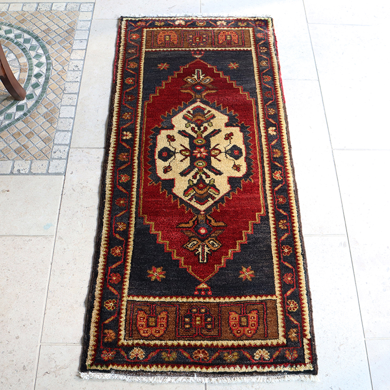 アナトリア地方で、ヤストゥク(枕の意味)と呼ばれる細長いクッションとして使われていた袋状のじゅうたんのピース。現状では裏面はとってしまって、一枚のカーペットになっています。