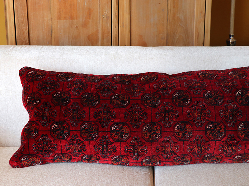 ベッドヘッドに、枕と並べて置くのに調度よいサイズのクッションとしてつくられました。細長なので2人掛けのソファに腰あてとして置いてもよさそうです。