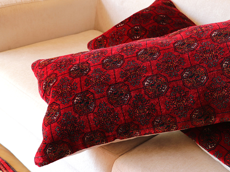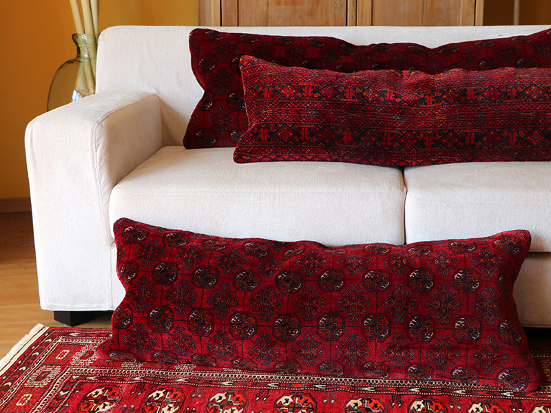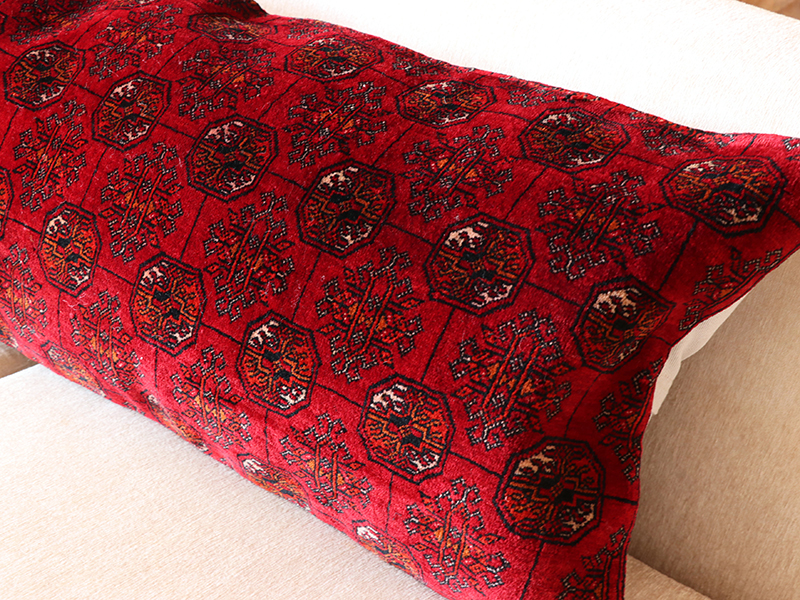 アフガニスタン北部で織られている、とても細かな織りの手織りじゅうたんからのカット。パイルはビロードのよう光沢があってなめらかな肌触りです。とても目のつまった織り地で、濃い深みのある色合いが魅力的です。