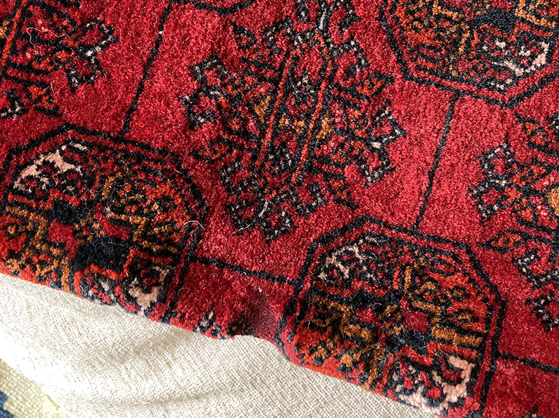 目のつまった織り地です。表面はとてもなめらかで、やさしい肌ざわり。一部パイルがなくなっている部分があり、家庭の修理が入っています。