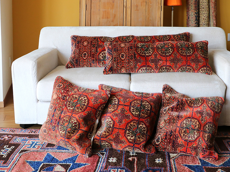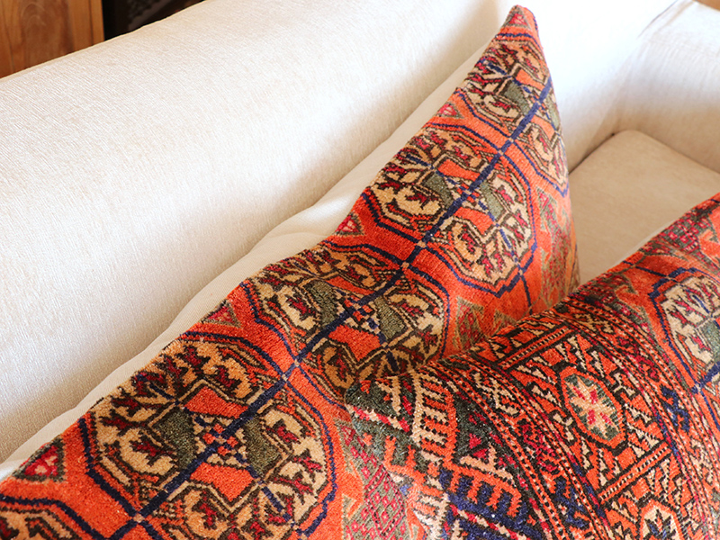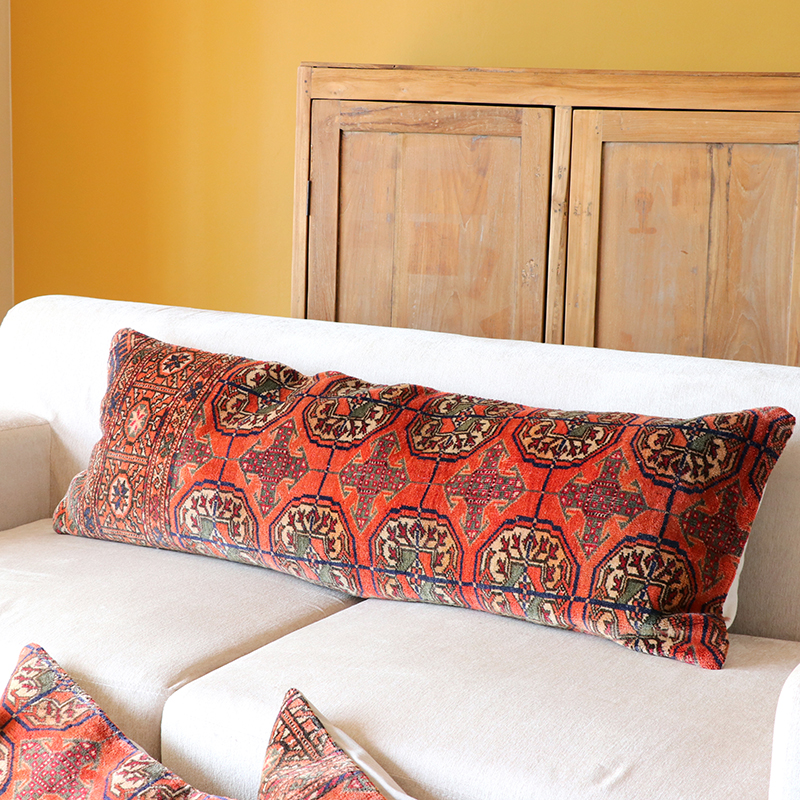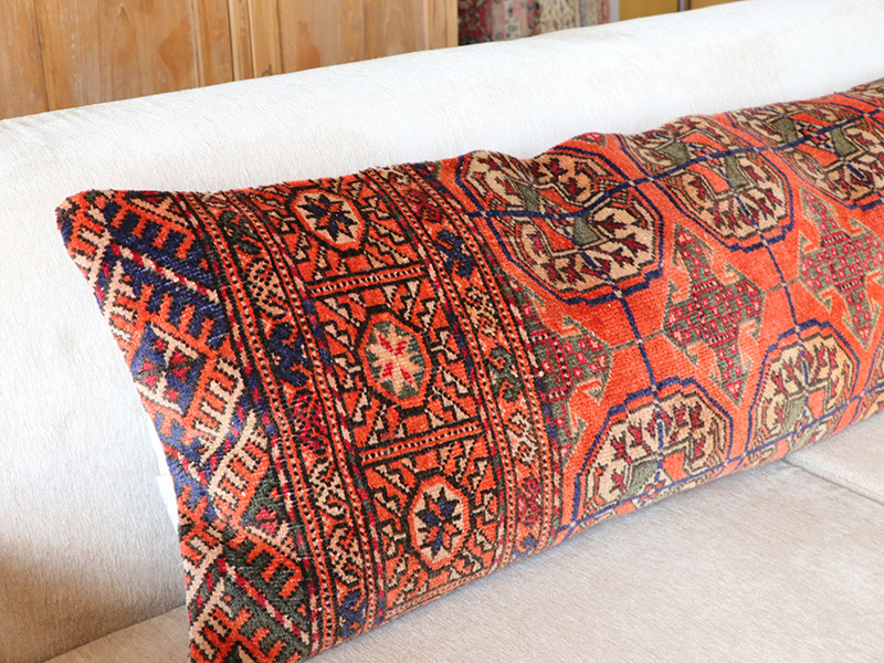 ベッドヘッドに、枕と並べて置くのに調度よいサイズのクッションとしてつくられました。細長なので2人掛けのソファに腰あてとして置いてもよさそうです。