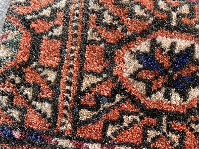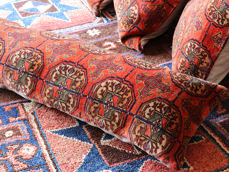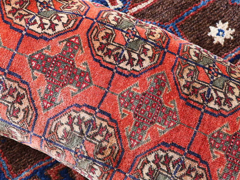ギュルのモチーフが並んだトルクメンのオールドカーペットからのカット。オレンジとグリーン、ネイビーのきれいな色合いです。
