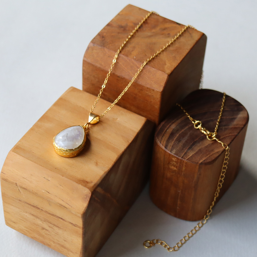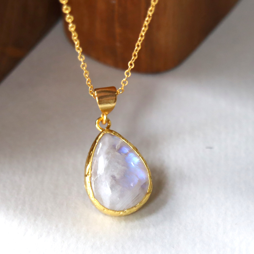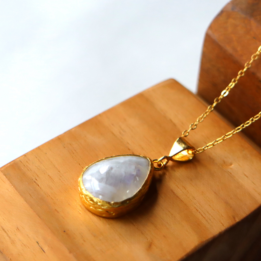 乳白色の大粒の石に幻想的なシラー(虹色の輝き)が美しい存在感のあるレインボームーンストーンのペンダントです。マットなゴールド色の台座は石の形にぴったり合わせて手作りされています。1mmの細身のチェーンは、45cmから55cmまで長さが調節できて、その日の装いに合わせてお楽しみいただけます。