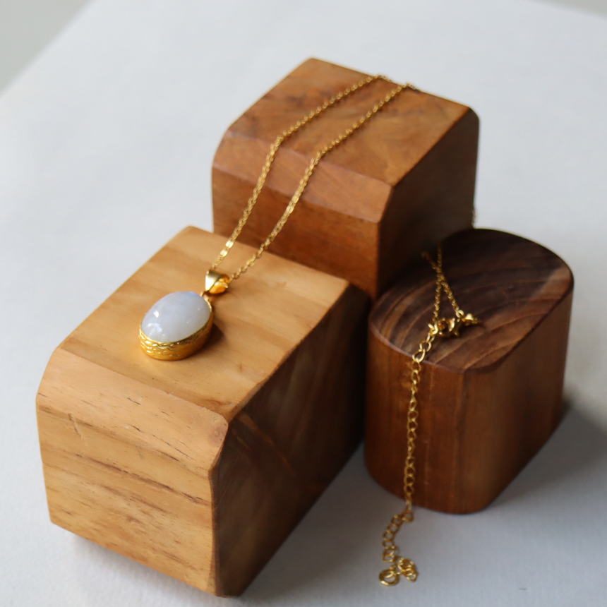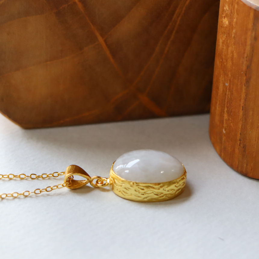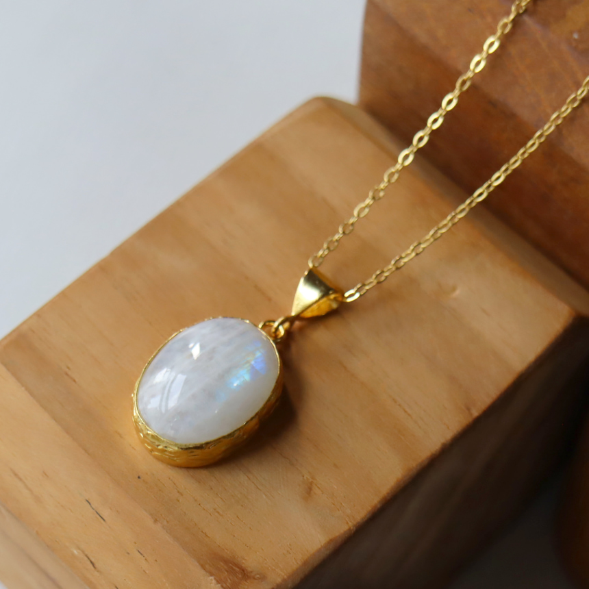 乳白色の大粒の石に幻想的なシラー(虹色の輝き)が美しい存在感のあるレインボームーンストーンのペンダントです。マットなゴールド色の台座は石の形にぴったり合わせて手作りされています。1mmの細身のチェーンは、45cmから55cmまで長さが調節できて、その日の装いに合わせてお楽しみいただけます。