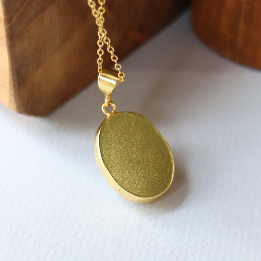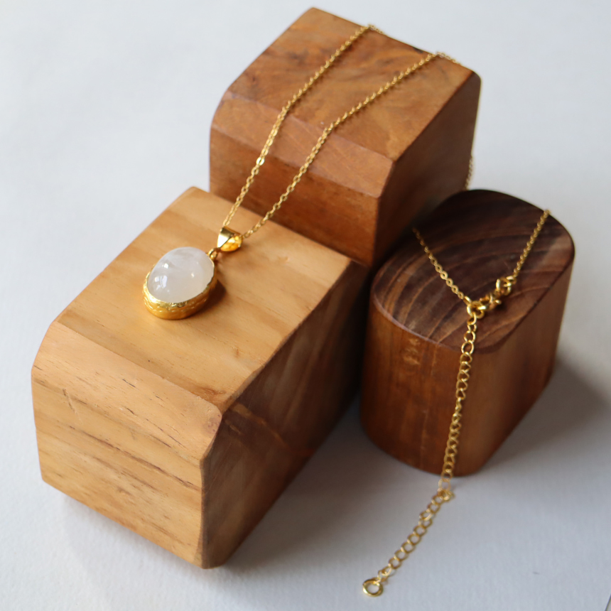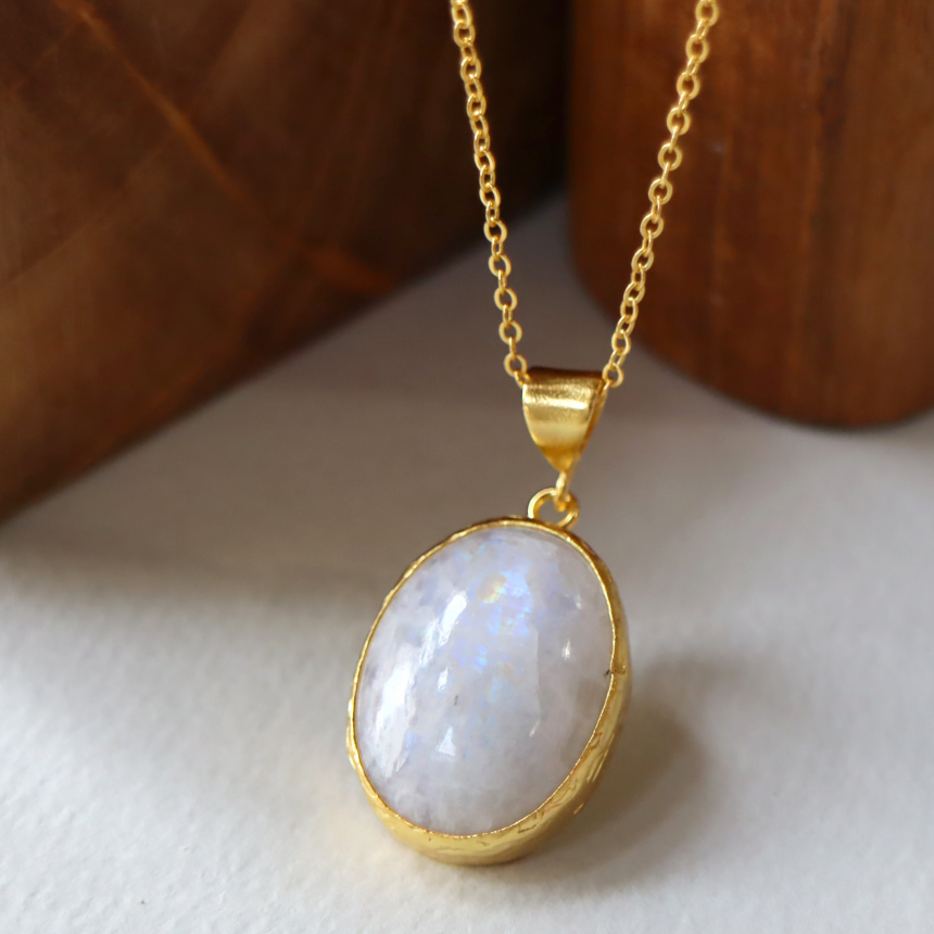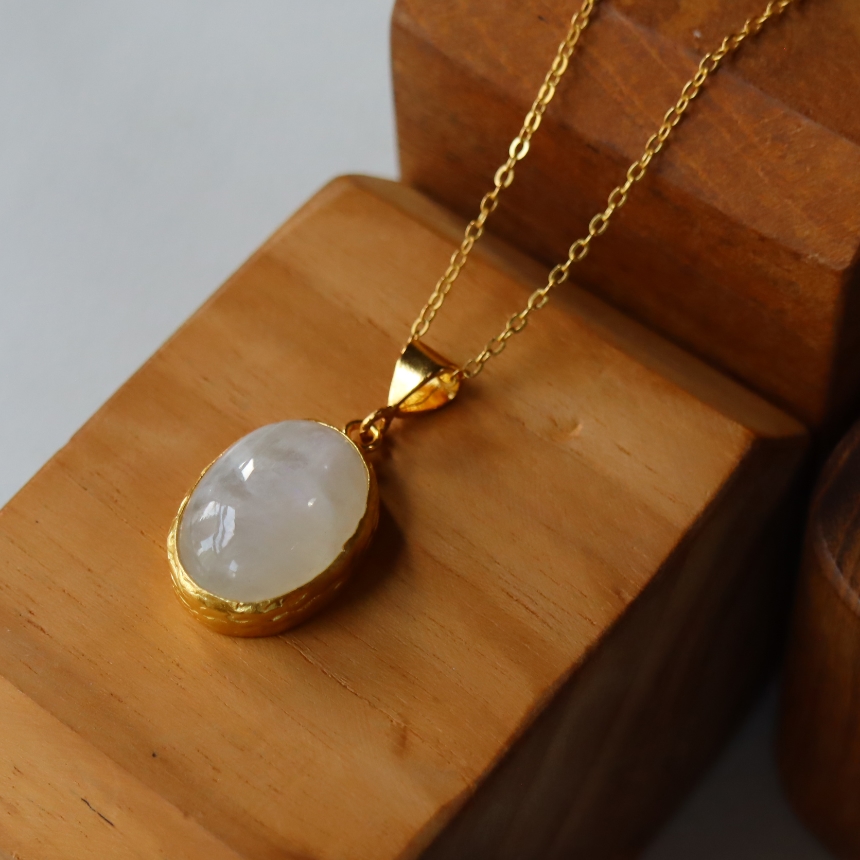 乳白色の大粒の石に幻想的なシラー(虹色の輝き)が美しい存在感のあるレインボームーンストーンのペンダントです。マットなゴールド色の台座は石の形にぴったり合わせて手作りされています。1mmの細身のチェーンは、45cmから55cmまで長さが調節できて、その日の装いに合わせてお楽しみいただけます。