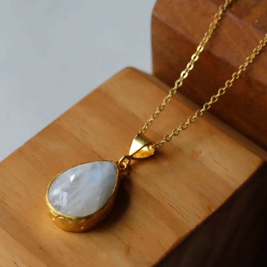 乳白色の大粒の石に幻想的なシラー(虹色の輝き)が美しい存在感のあるレインボームーンストーンのペンダントです。マットなゴールド色の台座は石の形にぴったり合わせて手作りされています。1mmの細身のチェーンは、45cmから55cmまで長さが調節できて、その日の装いに合わせてお楽しみいただけます。
