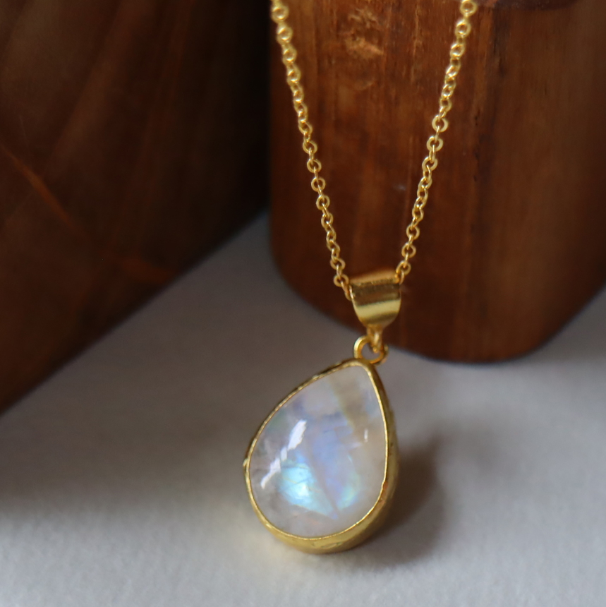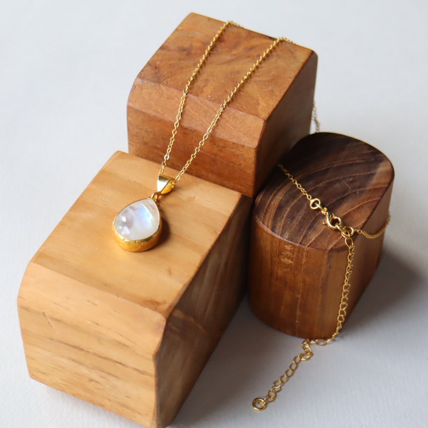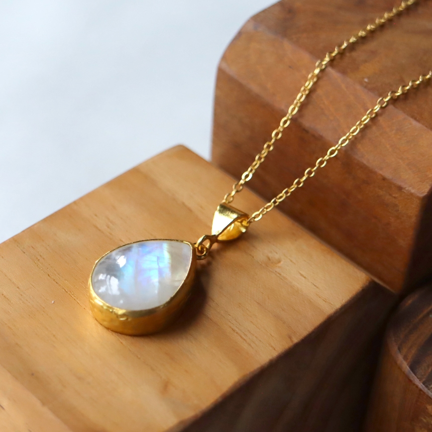 乳白色の大粒の石に幻想的なシラー(虹色の輝き)が美しい存在感のあるレインボームーンストーンのペンダントです。マットなゴールド色の台座は石の形にぴったり合わせて手作りされています。1mmの細身のチェーンは、45cmから55cmまで長さが調節できて、その日の装いに合わせてお楽しみいただけます。
