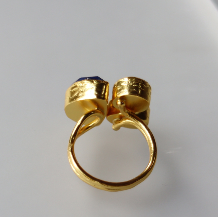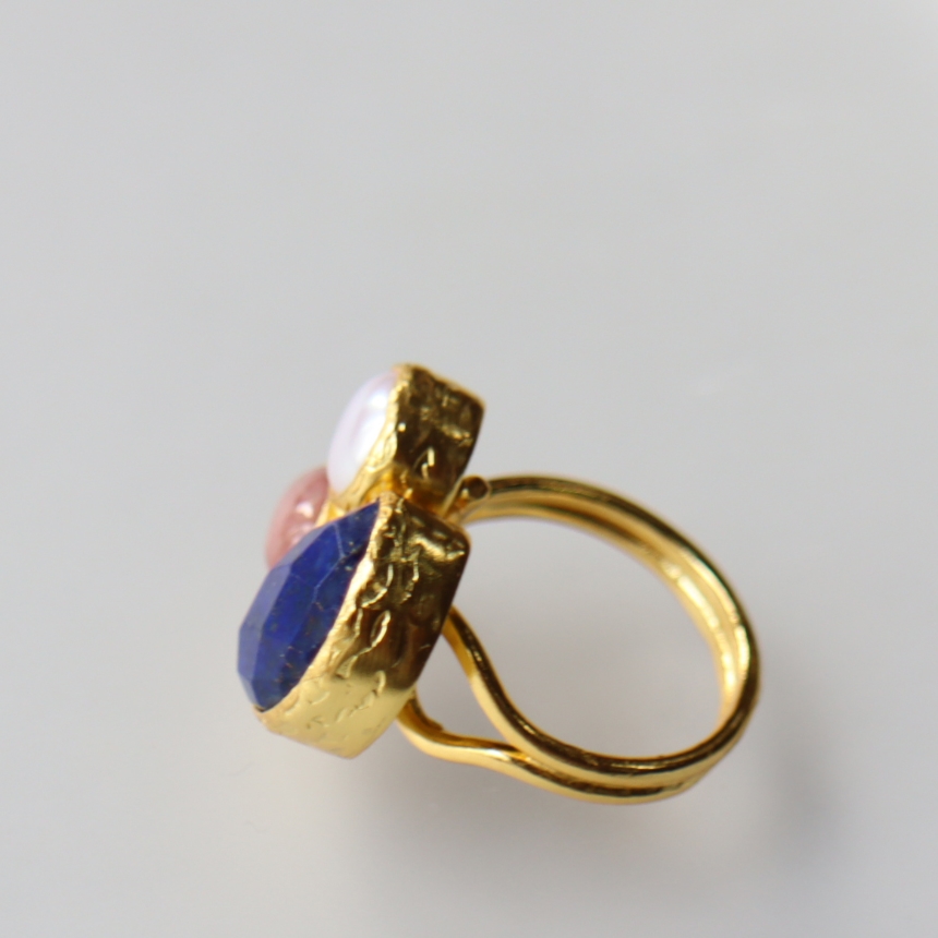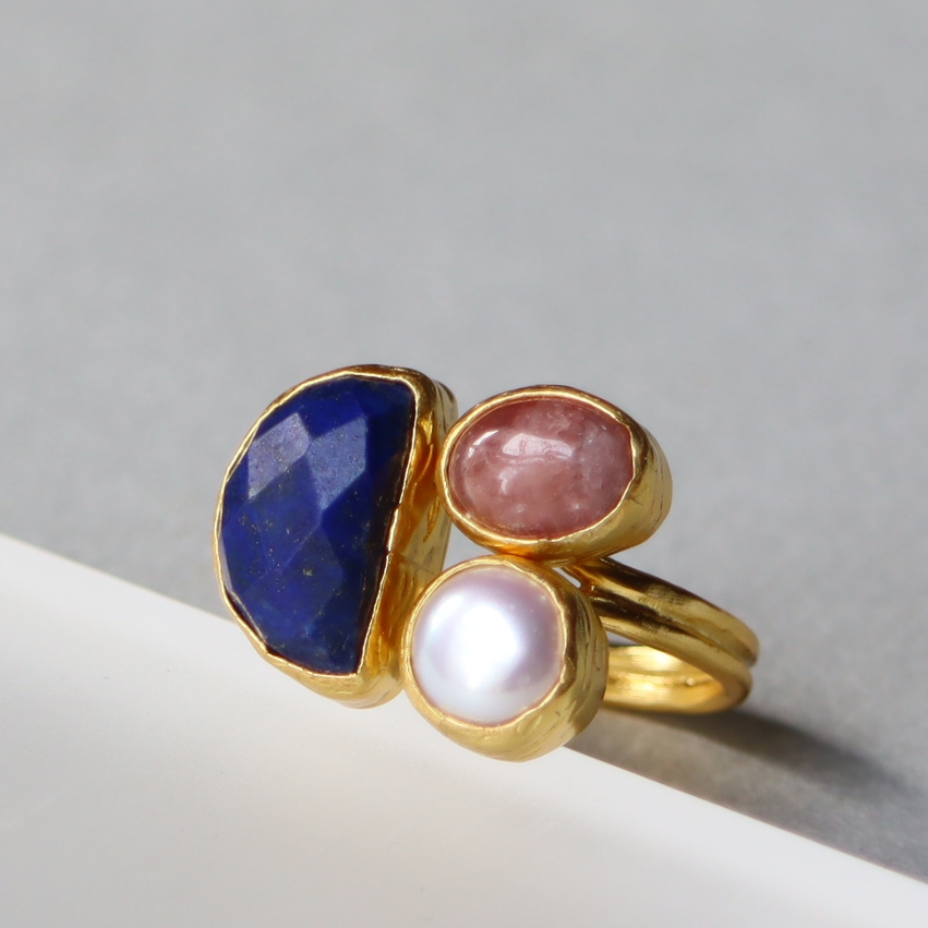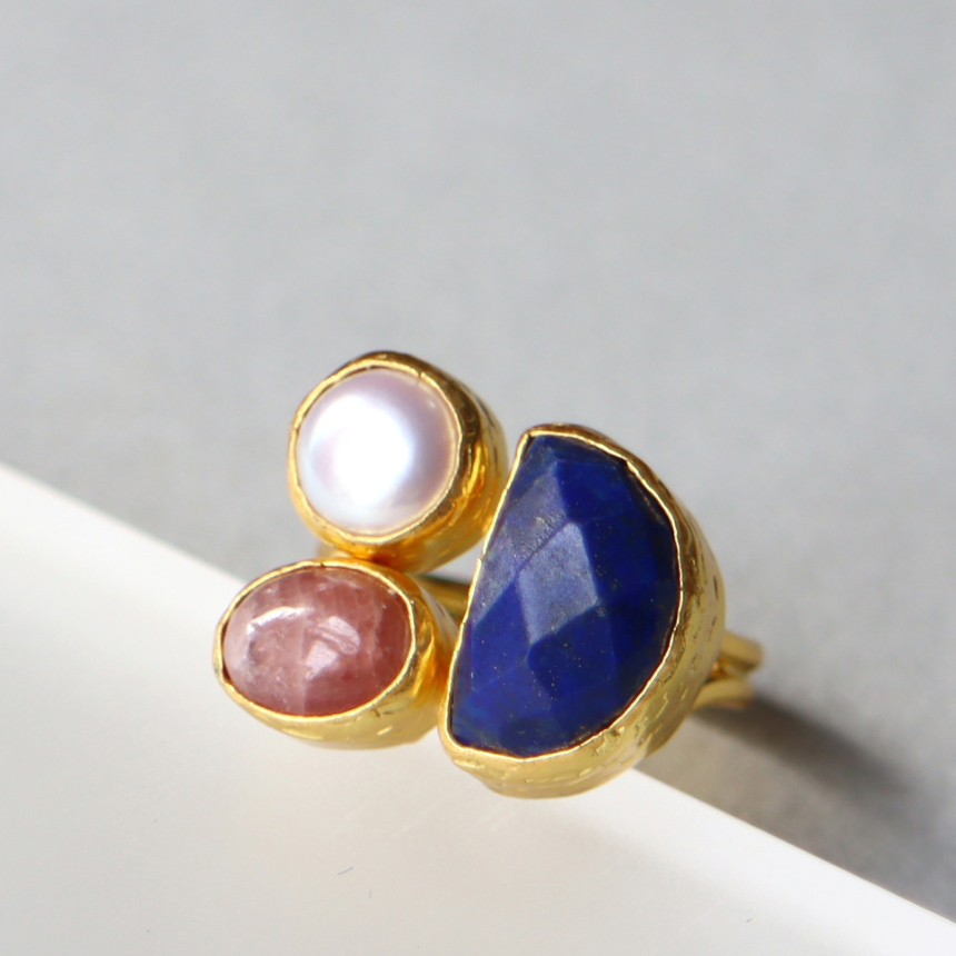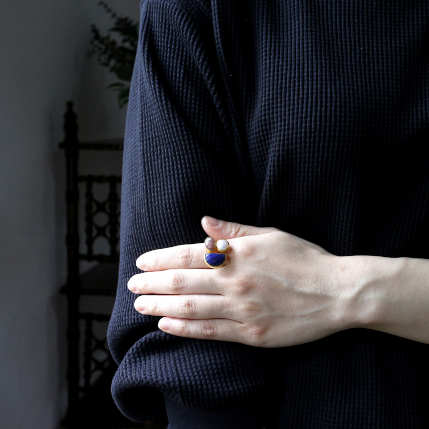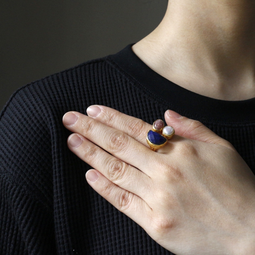 深い青のラピスラズリ、柔らかな輝きを放つパール、マットなローズピンクのロードクロサイト。異なる個性あふれる三つの石が絶妙なバランスで並んだ存在感のあるリングです。遊び心のあるデザインながら、パールの艶やかな輝きが上品な印象のリングは、手元に華やぎを添えてくれます。