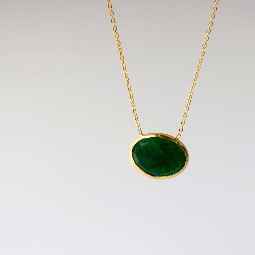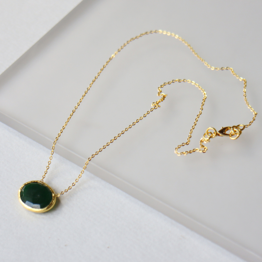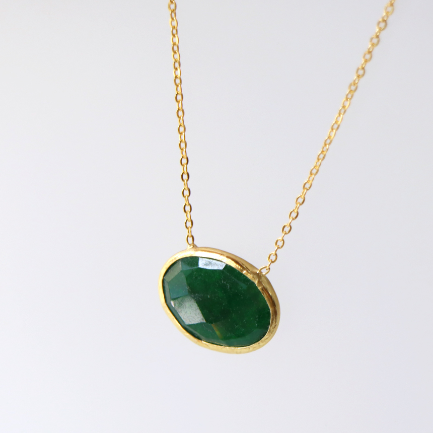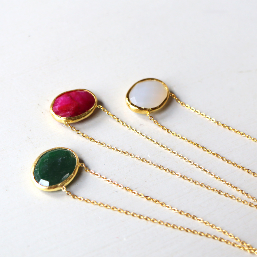 一粒の天然石のシンプルなデザインのネックレス。オーバルのストーンが横型についての新しいデザインです。安定感がよく、肌になじむように着けていただける、ながくつかえるアイテムです。