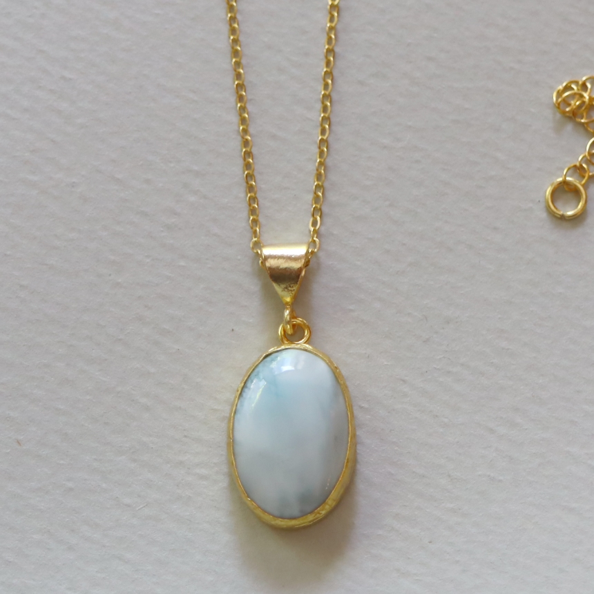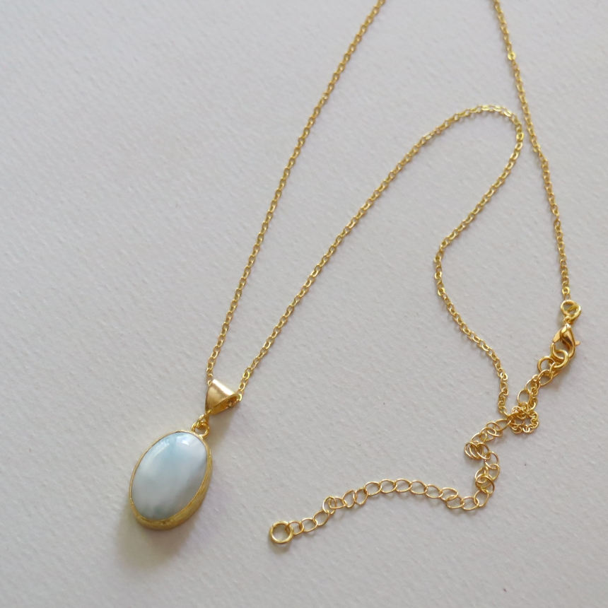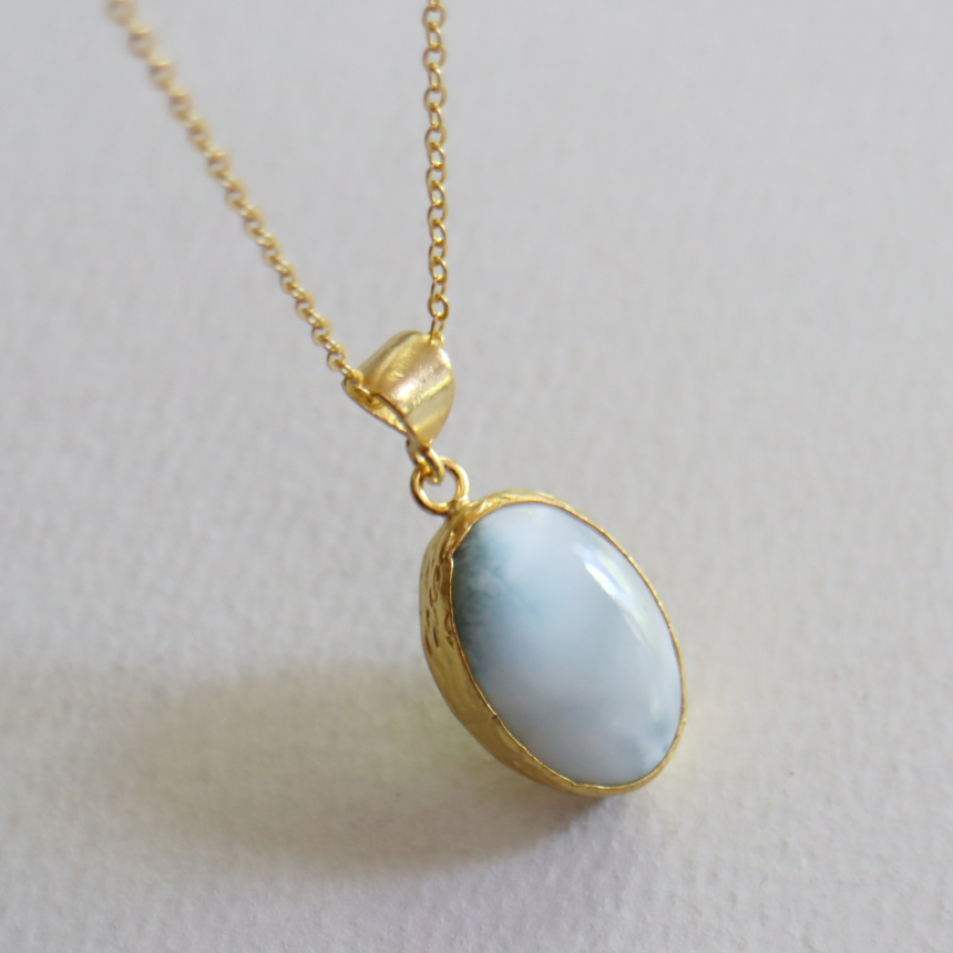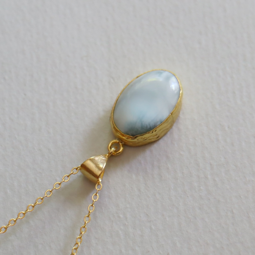 雲が浮かぶ青空のような模様が広がる、清々しいブルーが美しいラリマーのペンダントです。シンプルなデザインは石の本来の美しさを引き立てます。1mmの細身のチェーンは、45cmから55cmまで長さが調節できて、その日の装いに合わせてお楽しみいただけます。