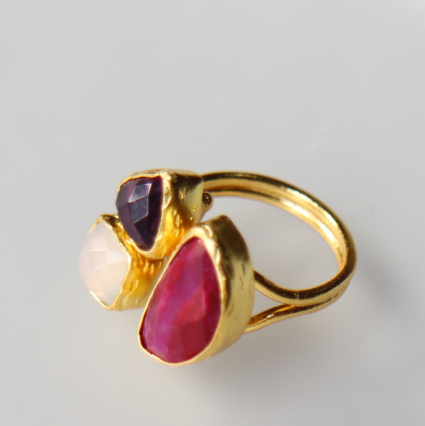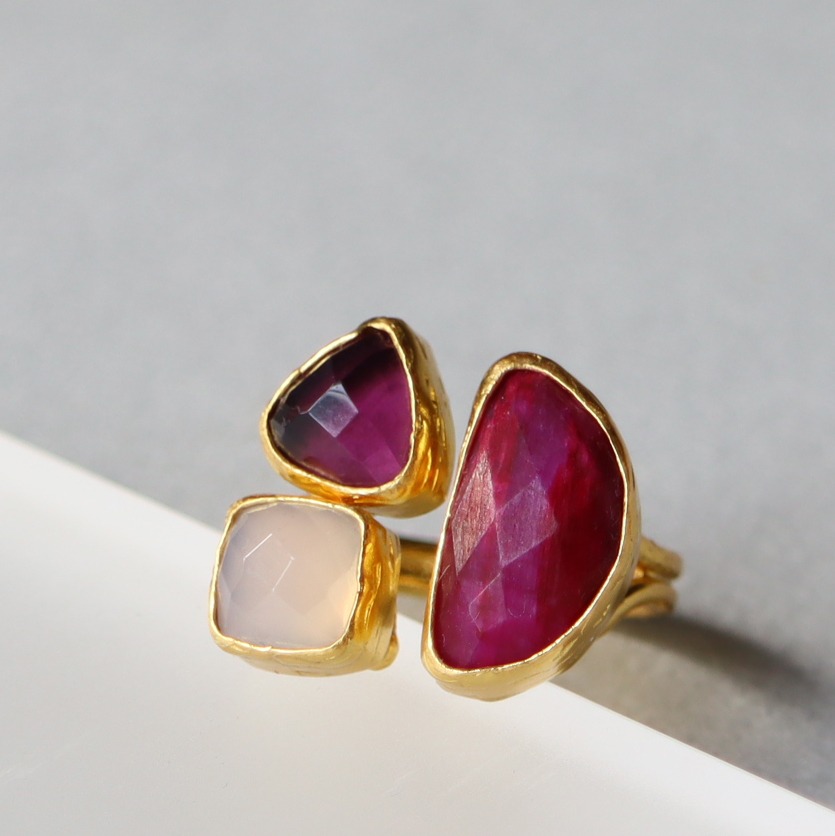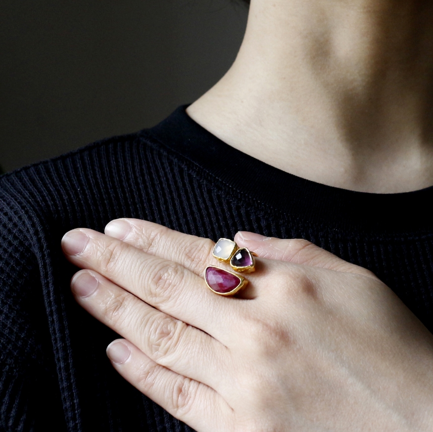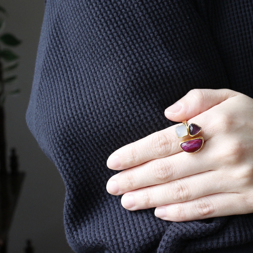 深紅のマットなルビーの輝き、柔らかな乳白色のホワイトカルセドニー、神秘的な気品ある紫のアメシスト。異なる形の個性ある三つの石が絶妙なバランスで並んだ存在感のあるリングです。遊び心のあるデザインながら、パールの艶やかな輝きが上品な印象のリングは、手元に華やぎを添えてくれます。