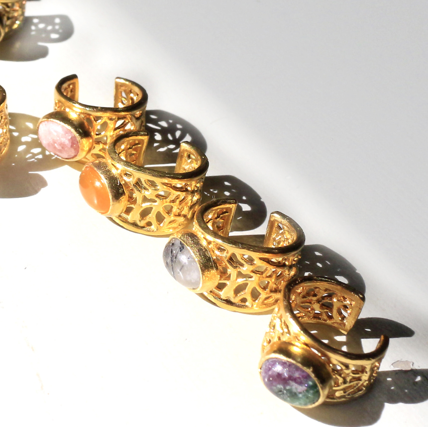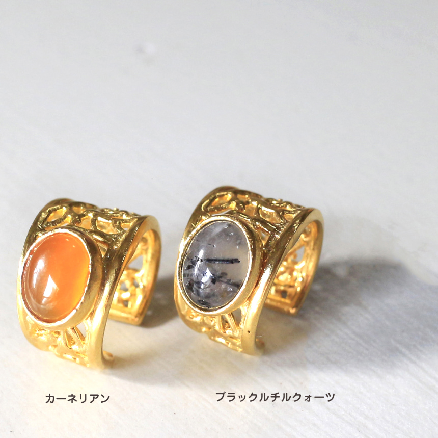 繊細な模様が施されたゴールドに、コロンとしたカボションカットの石が一粒セットされたデザイン。片耳なので、シンプルなスタイルを引き立たせてくれます※石0.8×0.6cm,、幅0.7~1cm