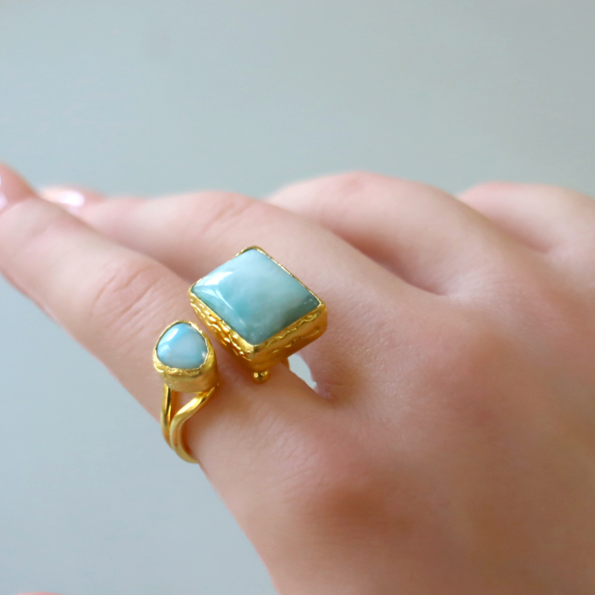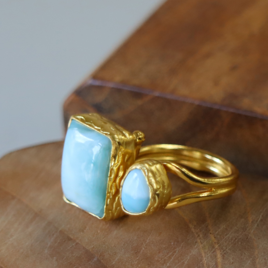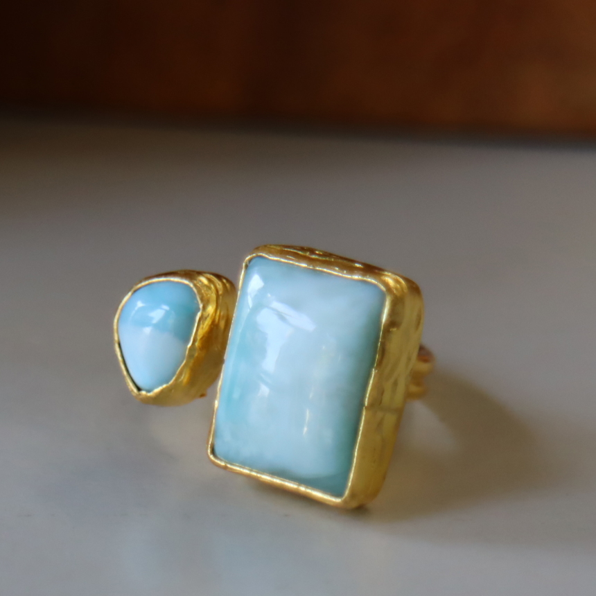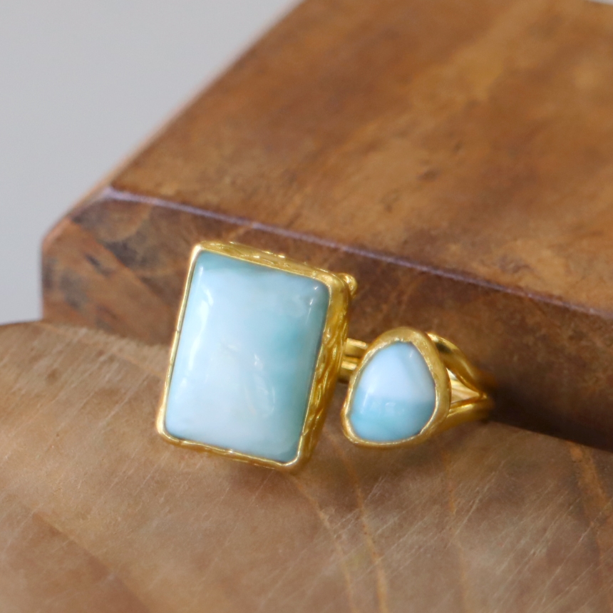 海に映る雲のような模様が広がる、優しいブルーが美しいラリマーダブルリングです。、大粒のラリマーに寄り添うような小さなラリマー。その絶妙なバランスは、シンプルでいて印象的に手元を美しくみせてくれます。