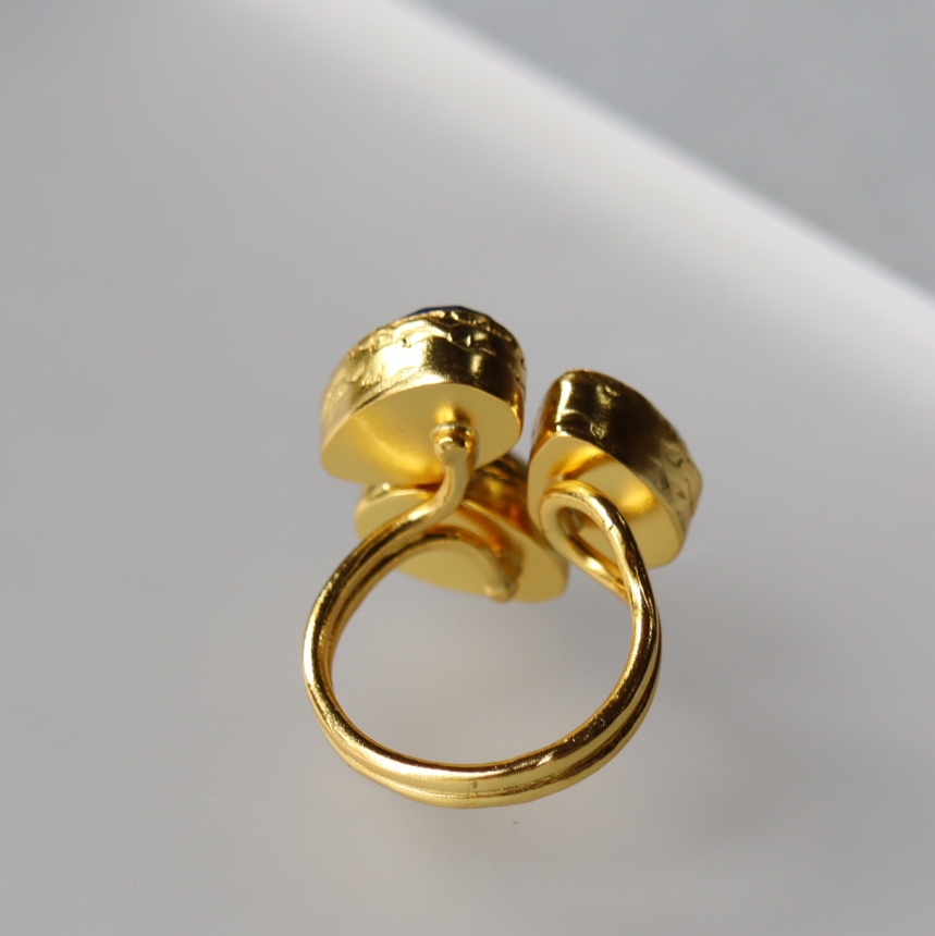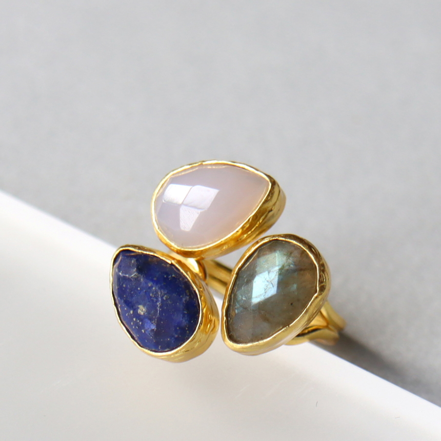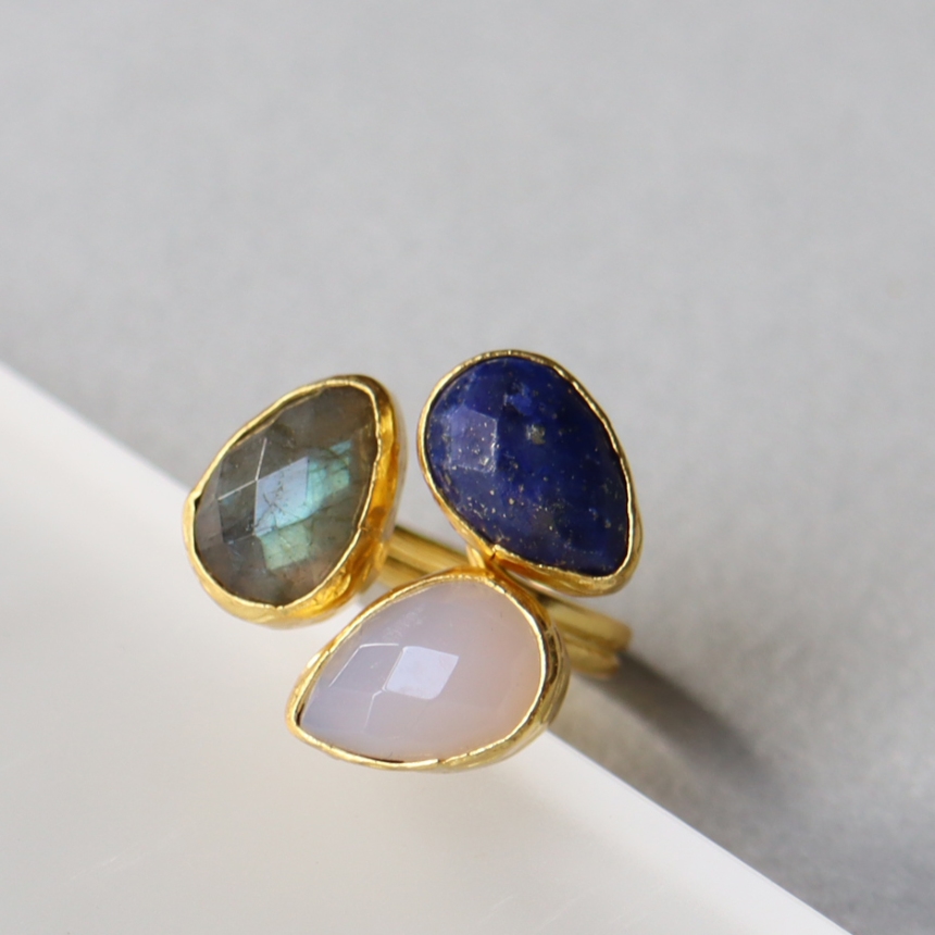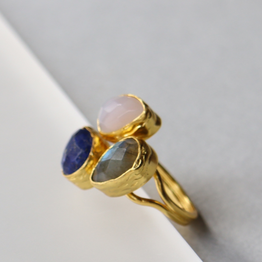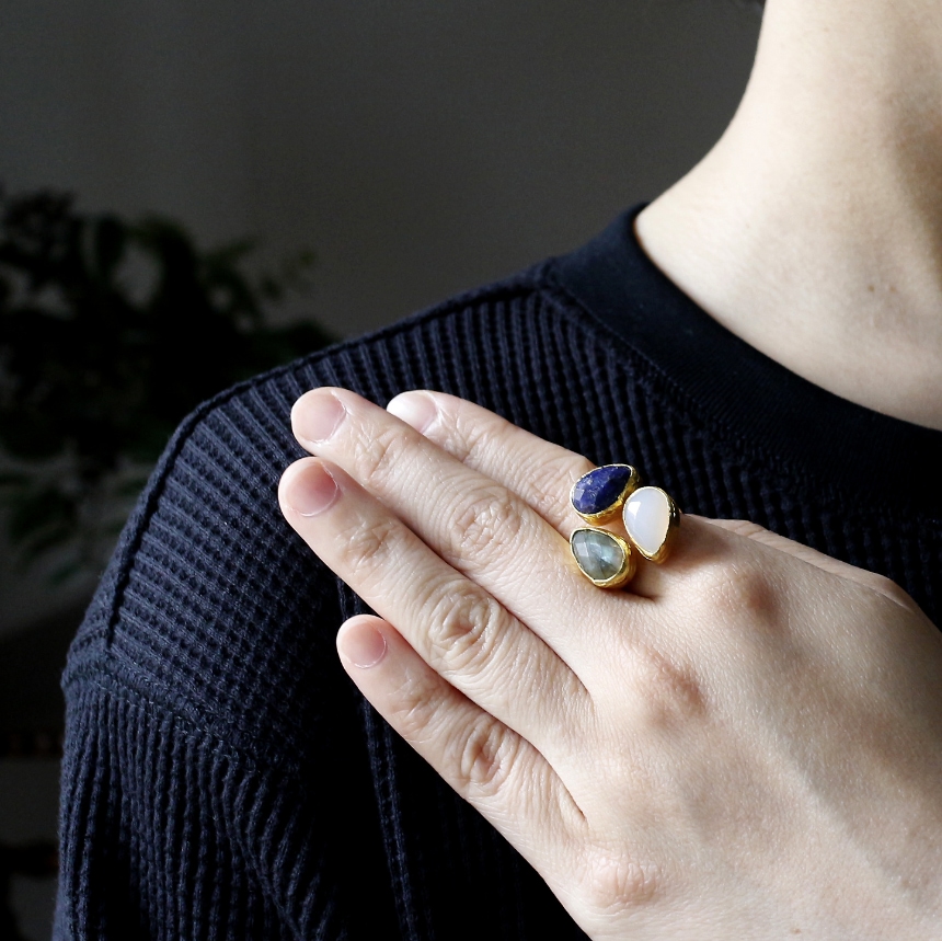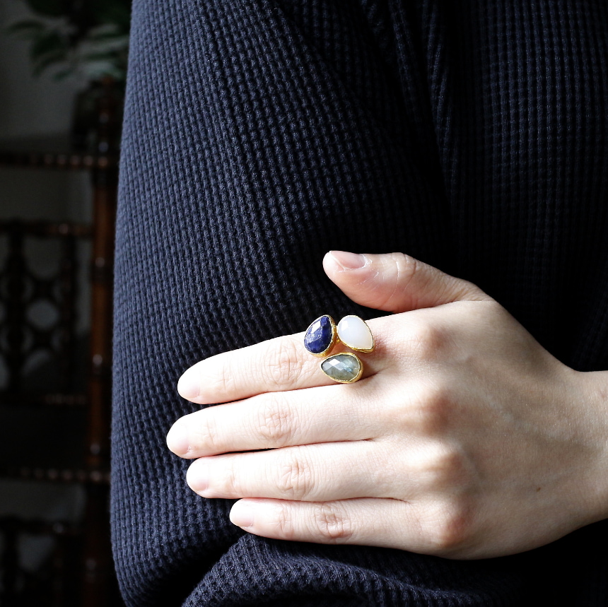 深い青のラピスラズリ、幻想的に輝くラブラドライト、月のようにやさしいホワイトカルセドニー。三枚の葉が輪を描くようなデザインのリングです。遊び心のあるデザインながら、上品な印象のリングは、手元に華やぎを添えてくれます。