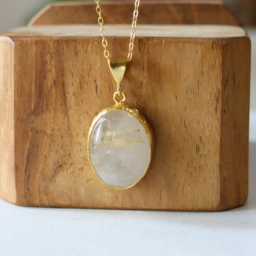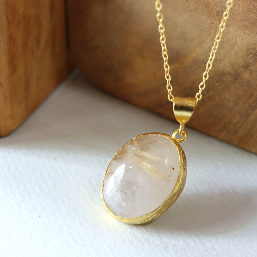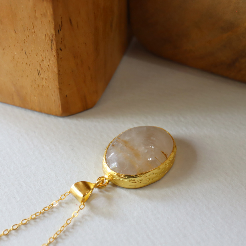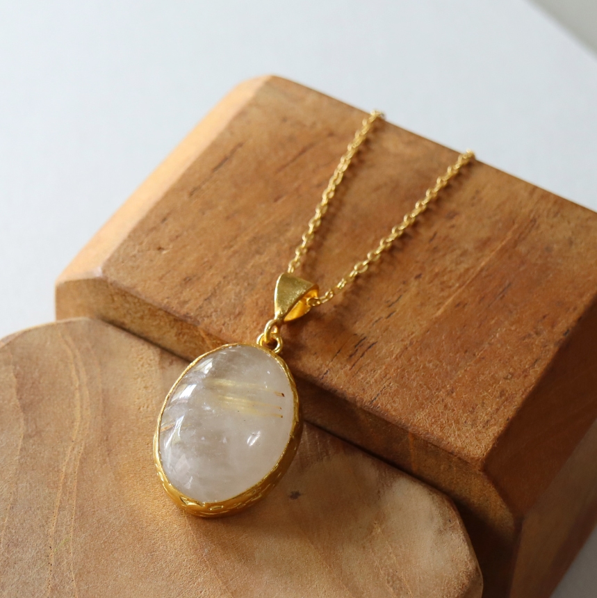 透明感あるオーバルカットのストーンの中に黄金の針が輝く、大粒のルチルクォーツのペンダントです。マットなゴールド色の台座は石の形にぴったり合わせて手作りされています。1mmの細身のチェーンは、45cmから55cmまで長さが調節できて、その日の装いに合わせてお楽しみいただけます。
