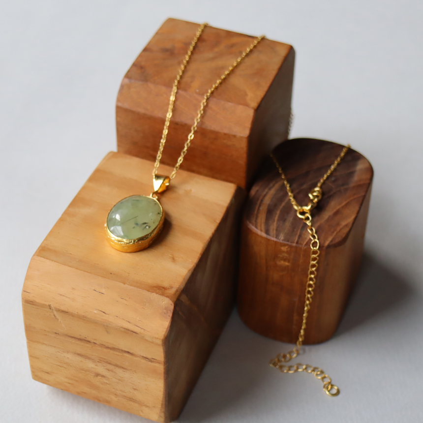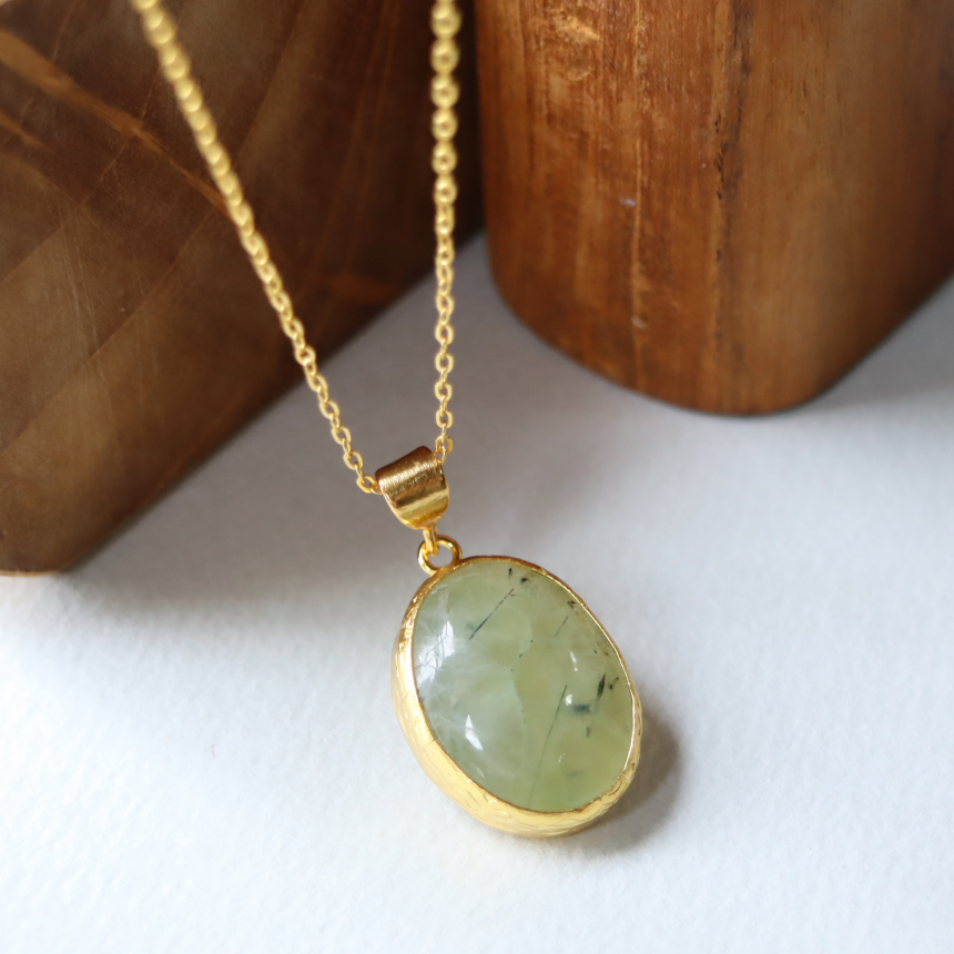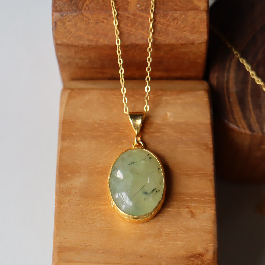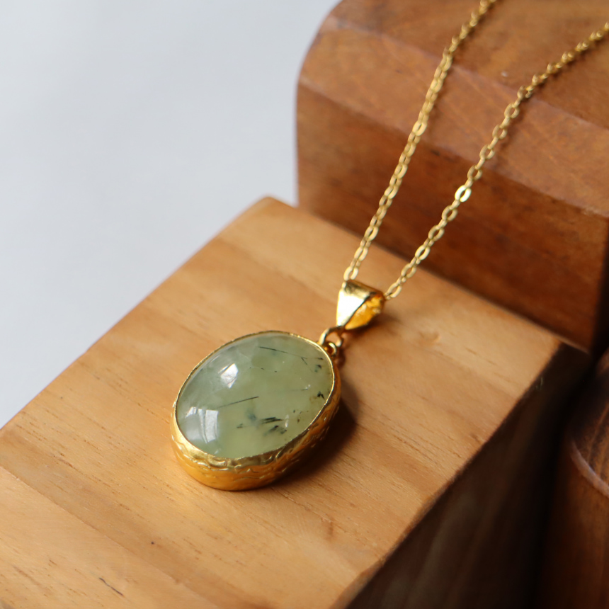 深みあるナチュラルグリーンが特徴のプレナイトのペンダントです。奥深い色彩が幻想的で静かな存在感を放ちます。1mmの細身のチェーンは、45cmから55cmまで長さが調節できて、その日の装いに合わせてお楽しみいただけます。