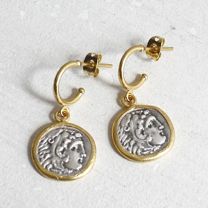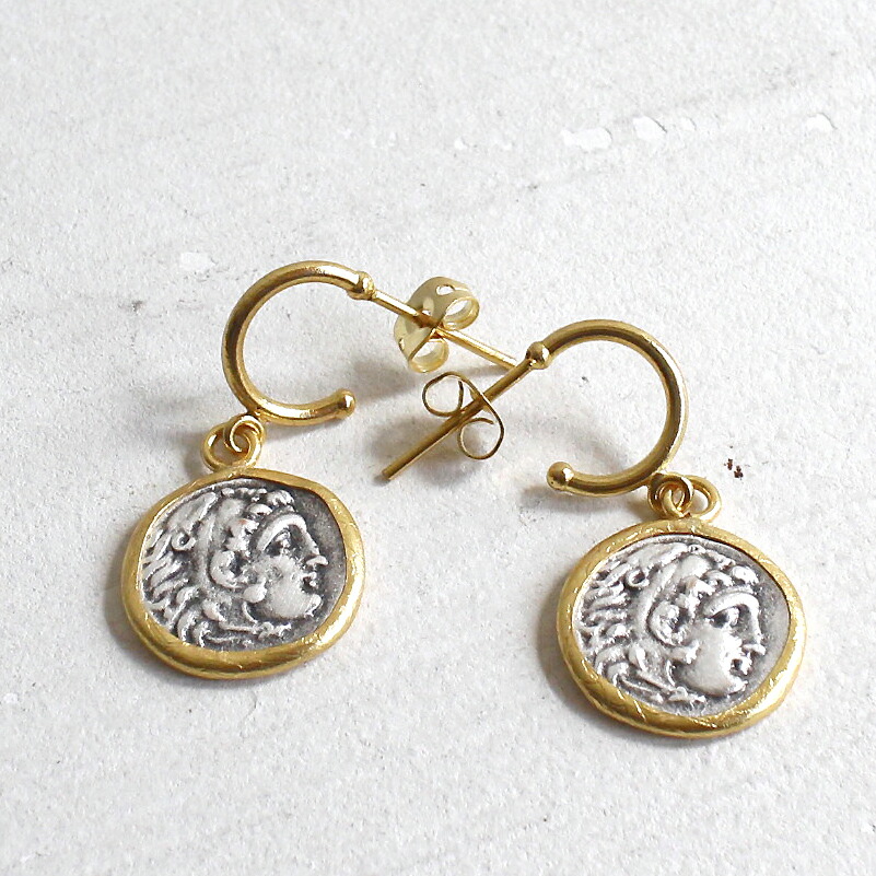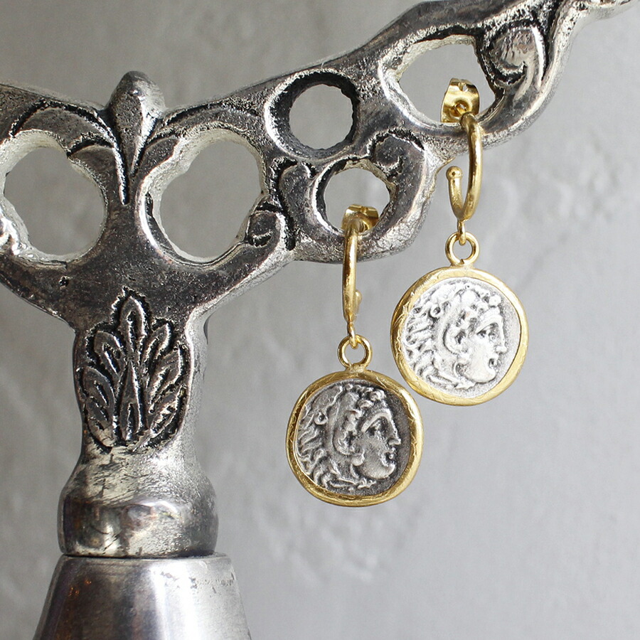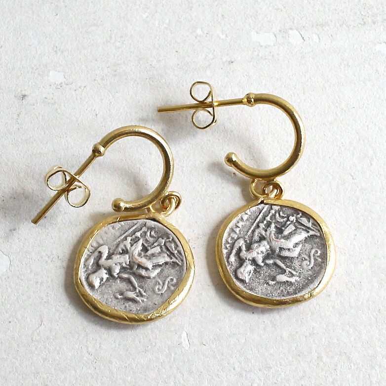 表面にはギリシャ神話のヘラクレス、裏面にはギリシャ神話の最高神ゼウスが右手に聖鳥である大鷲を休ませている姿が彫りこまれています。マケドニア帝国のアレキサンダー大王は自身をヘラクレスの末裔と称し、このコインのモデルにもなっているということです。シルバーとゴールドの二色使いで、手作り感あるリアルな仕上がりのピアスです。*コイン直径1.6cm。(コインは、アンティークコインのレプリカ)程よいサイズ感もおすすめです。