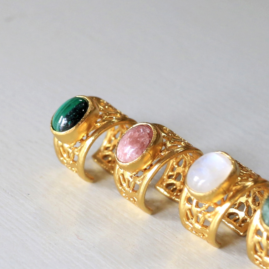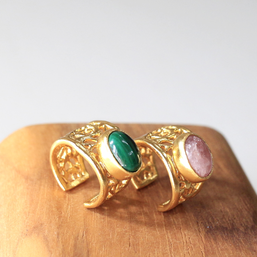 繊細な模様が施されたゴールドに、コロンとしたカボションカットの石が一粒セットされたデザイン。片耳なので、シンプルなスタイルを引き立たせてくれます※石0.8×0.6cm,、幅0.7~1cm