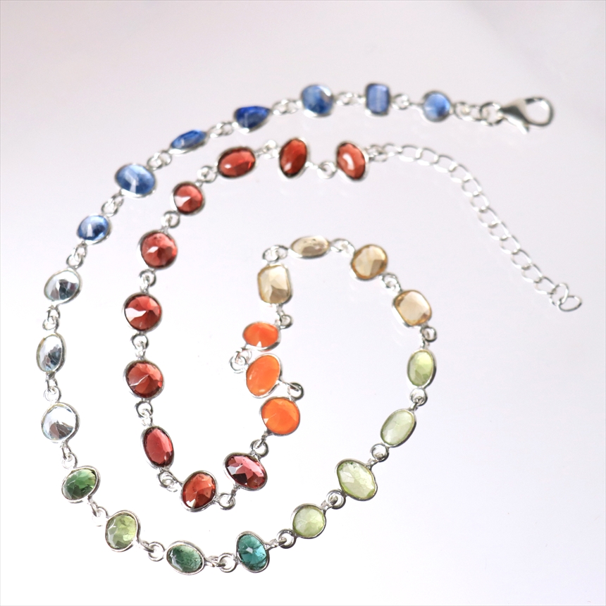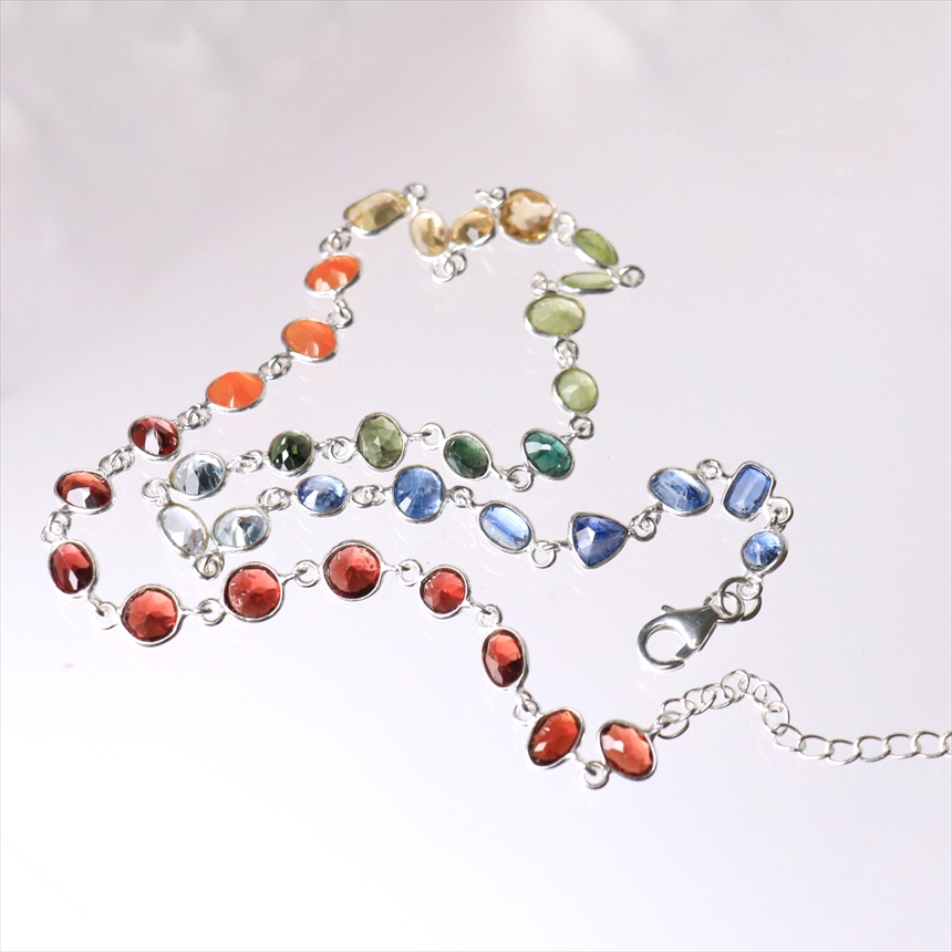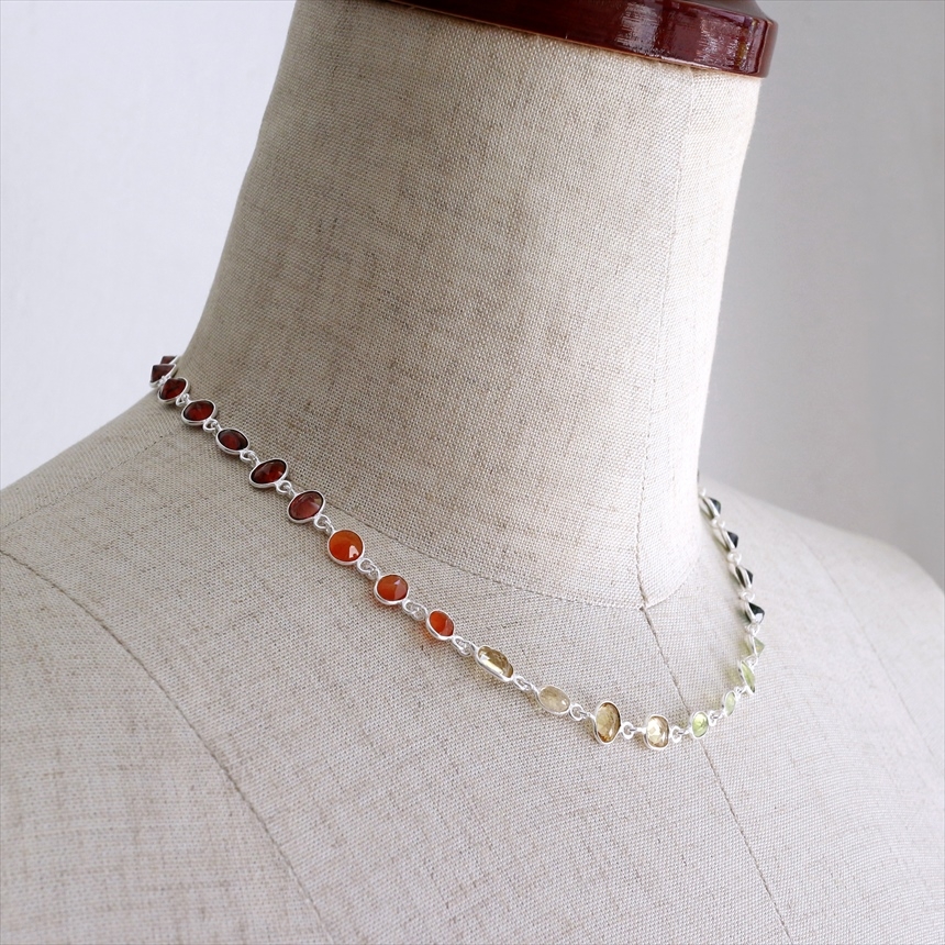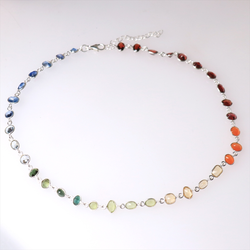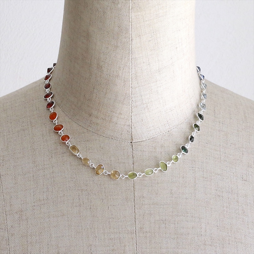 ガーネット10粒(赤)、カーネリアン3粒(オレンジ)、シトリン4粒(薄黄色)、ペリドット4粒(ライムグリーン)、グリーントルマリン4粒(モスグリーン)、ブルートパーズ3粒(クリアブルー)、カイヤナイト7粒(ブルー)の7種類のストーンが贅沢につながれたネックレス。一粒一粒の石の色彩が艶やかで大変美しく、光があたるたびにきらめき華やかで気品を感じます。こちらは首元に沿うようにつけていただけるショートサイズです。※石一粒縦横0.5~0.8cm