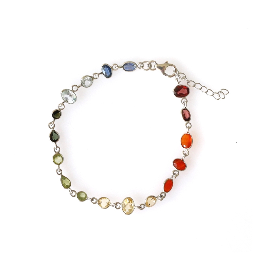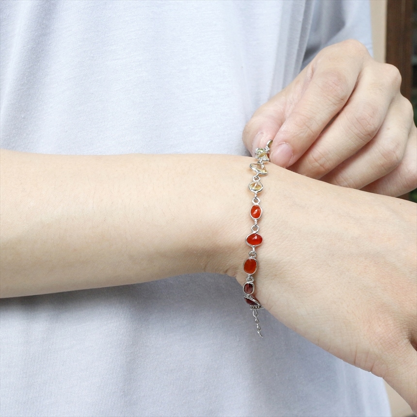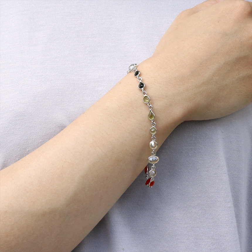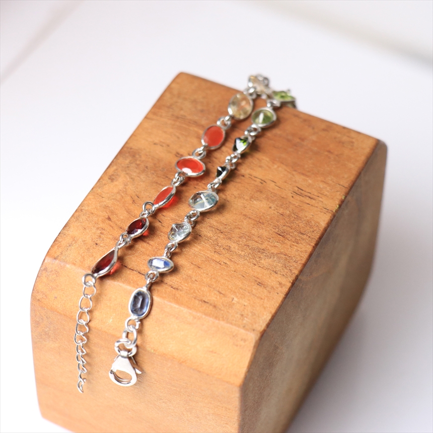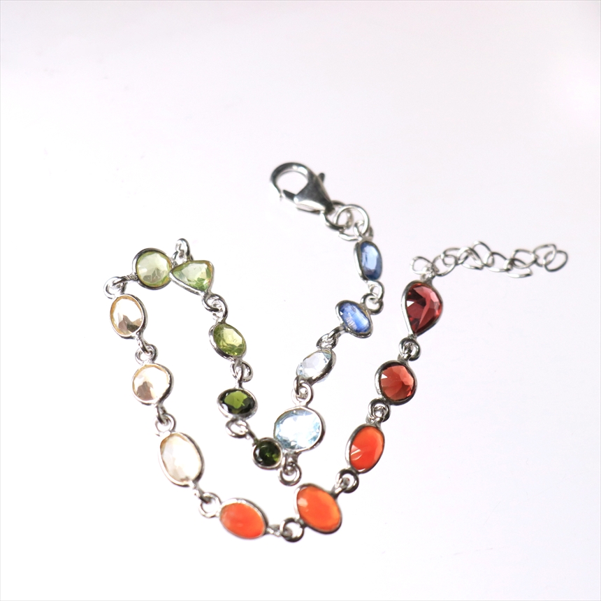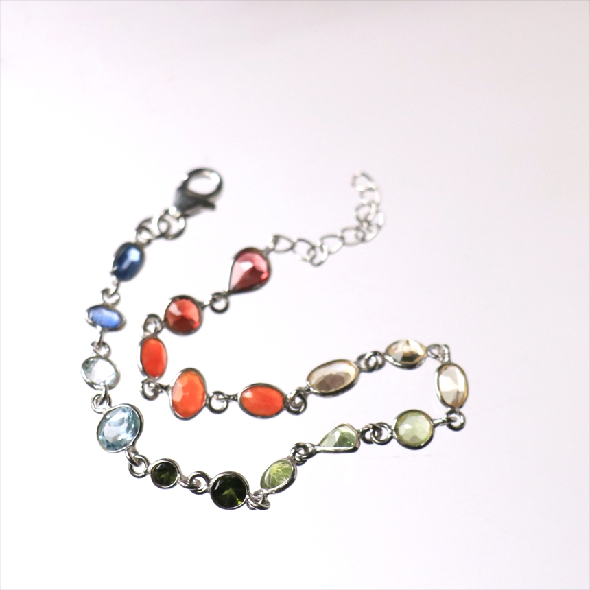 ガーネット2粒(赤)、カーネリアン3粒(オレンジ)、シトリン3粒(薄黄色)、ペリドット3粒(ライムグリーン)、グリーントルマリン2粒(モスグリーン)、ブルートパーズ2粒(クリアブルー)、カイヤナイト2粒(ブルー)の7種類のストーンが贅沢につながれたブレスレット。一粒一粒の石の色彩が艶やかで大変美しく、光があたるたびにきらめき華やかで気品を感じます。※石一粒縦横0.5~0.8cm