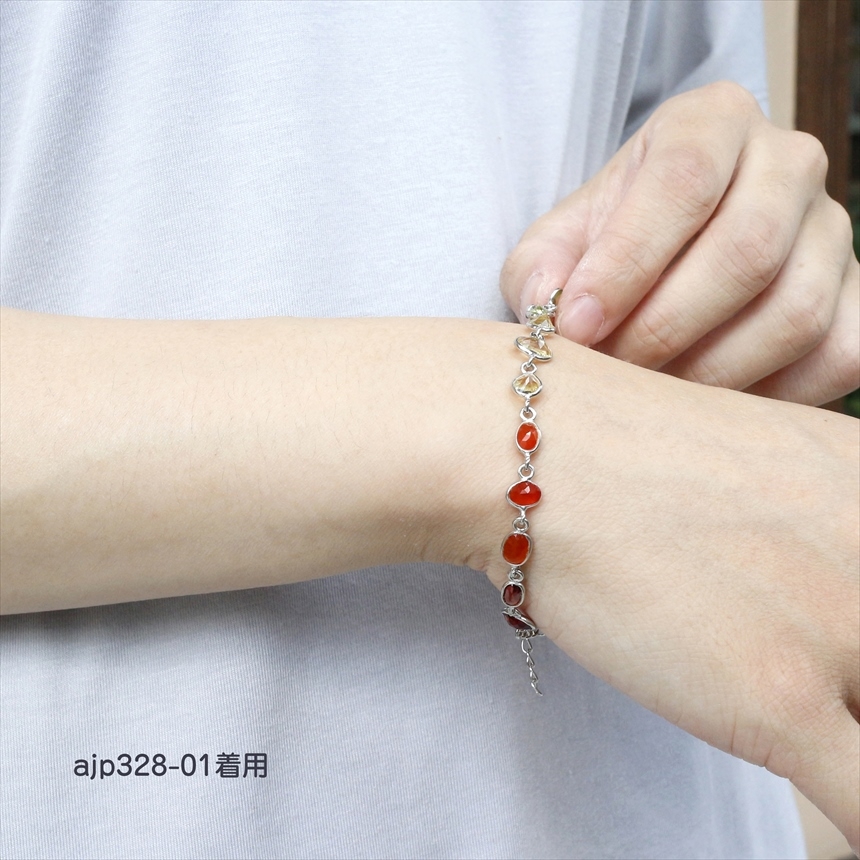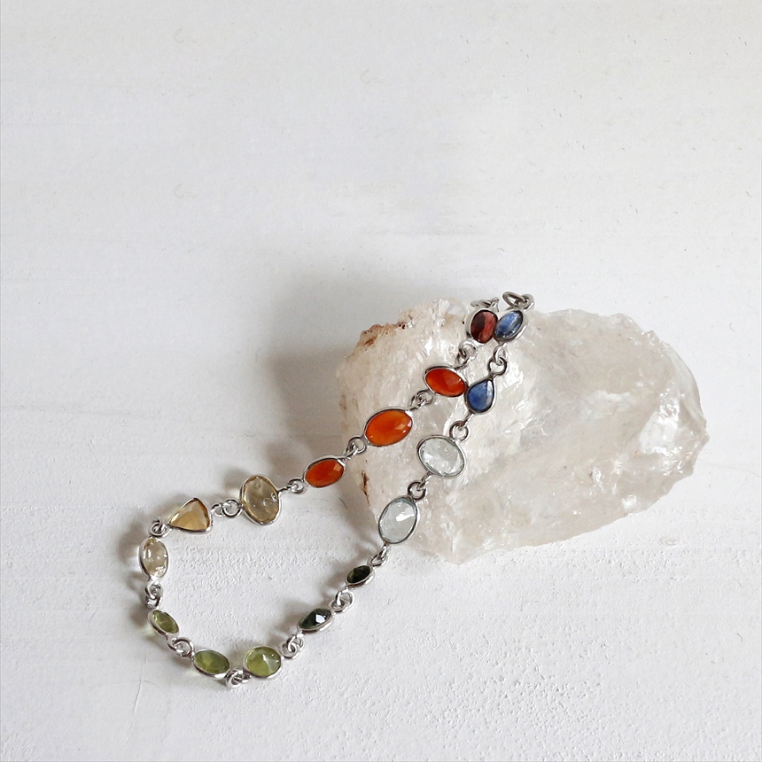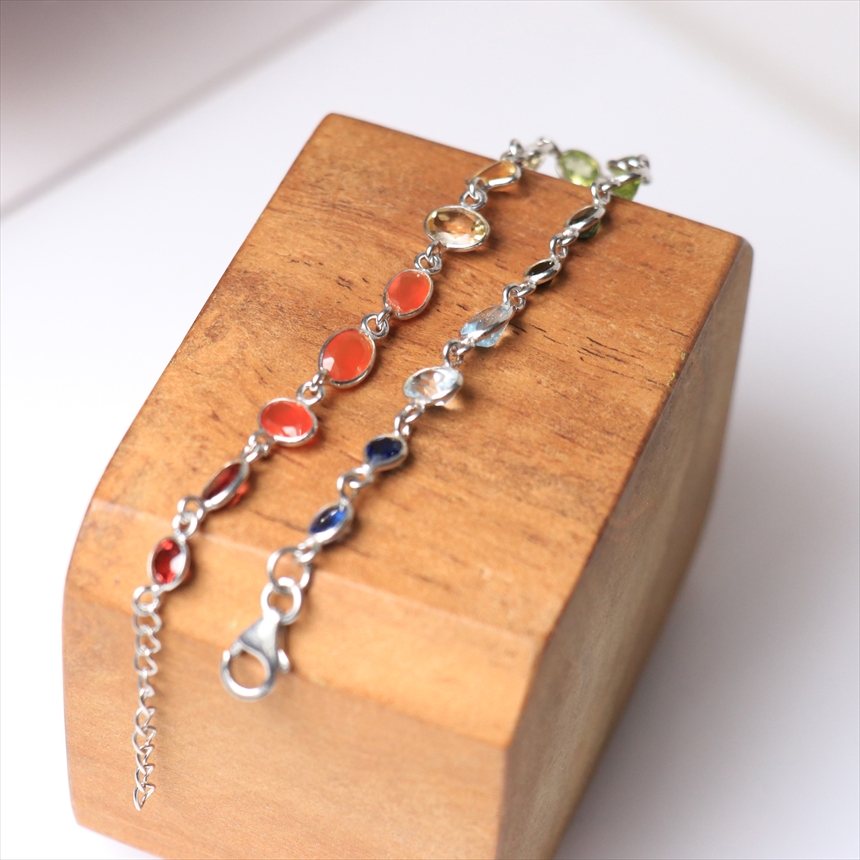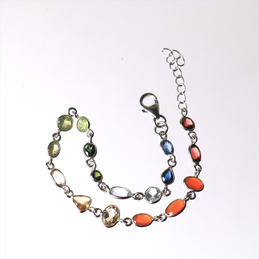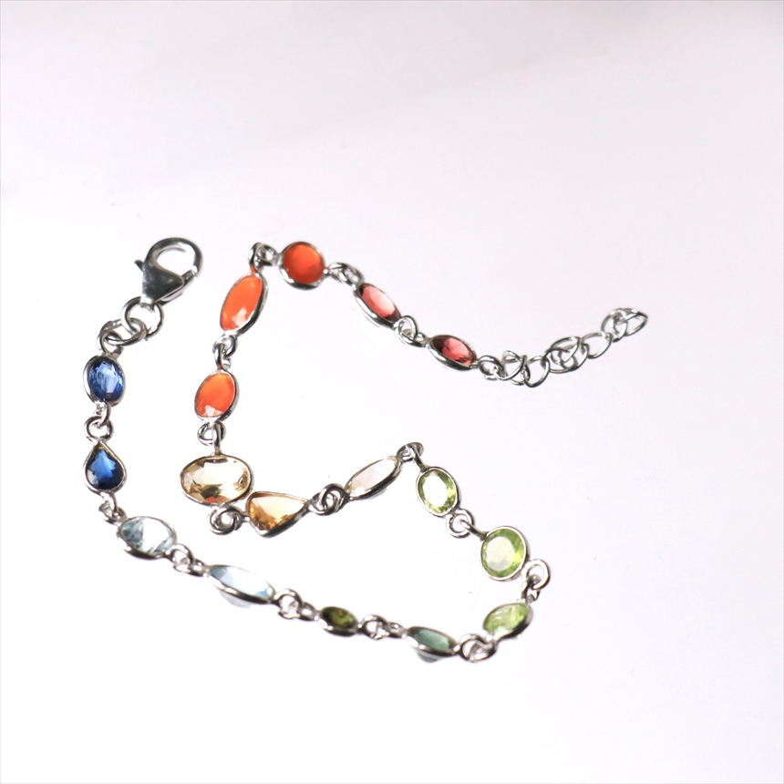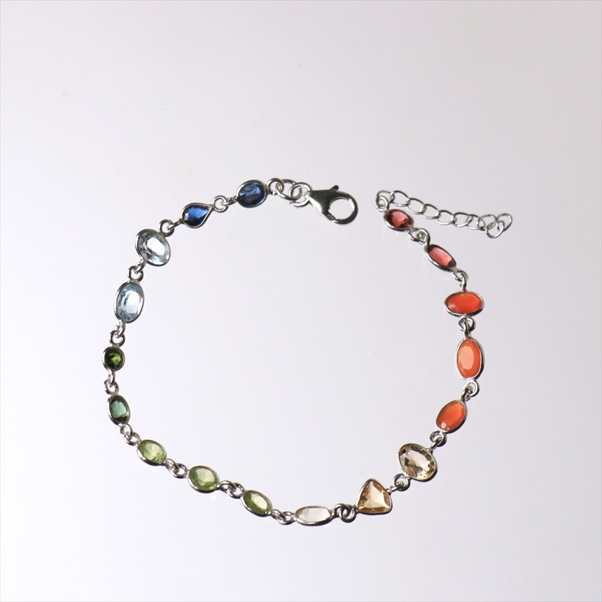 ガーネット2粒(赤)、カーネリアン3粒(オレンジ)、シトリン3粒(薄黄色)、ペリドット3粒(ライムグリーン)、グリーントルマリン2粒(モスグリーン)、ブルートパーズ2粒(クリアブルー)、カイヤナイト2粒(ブルー)の7種類のストーンが贅沢につながれたブレスレット。一粒一粒の石の色彩が艶やかで大変美しく、光があたるたびにきらめき華やかで気品を感じます。※石一粒縦横0.5~0.8cm