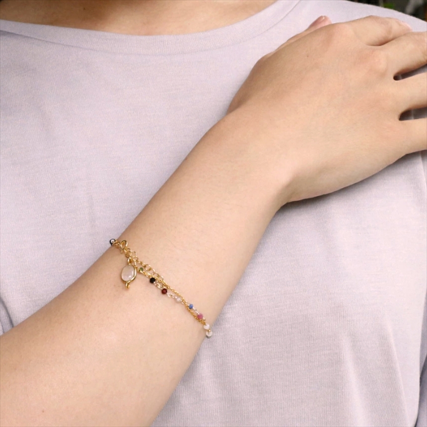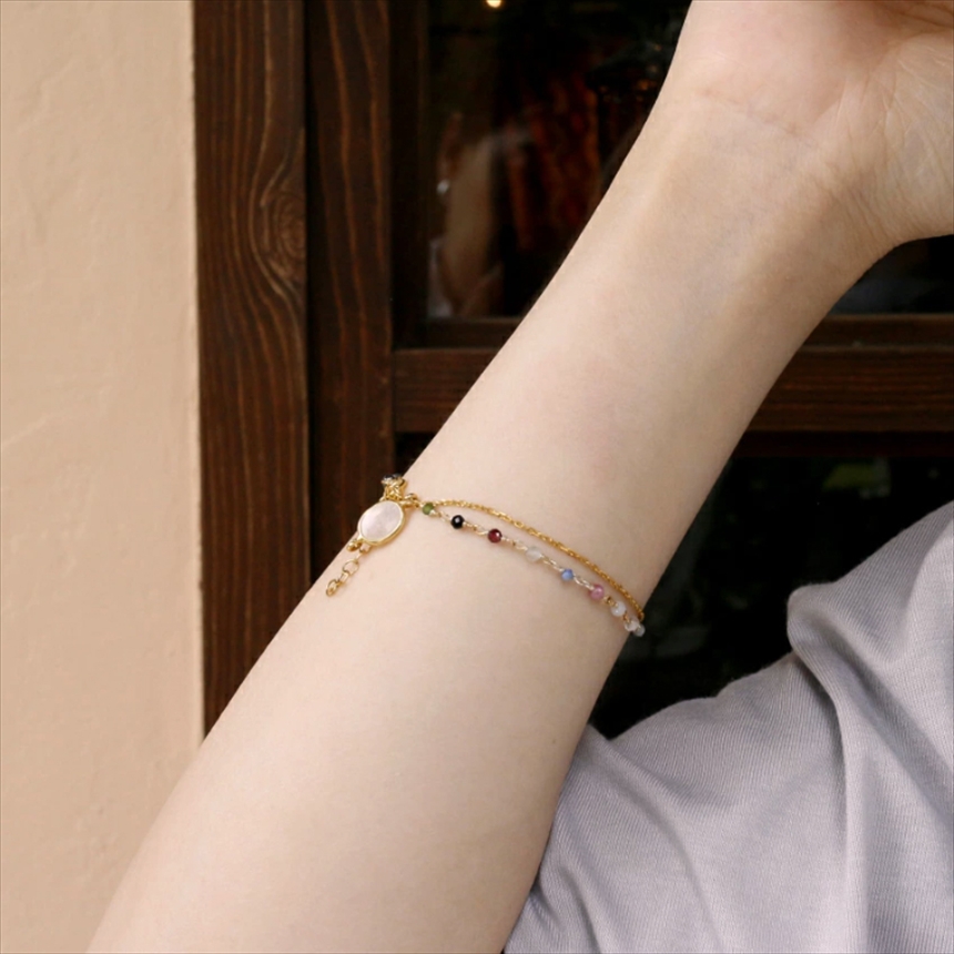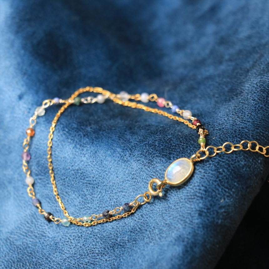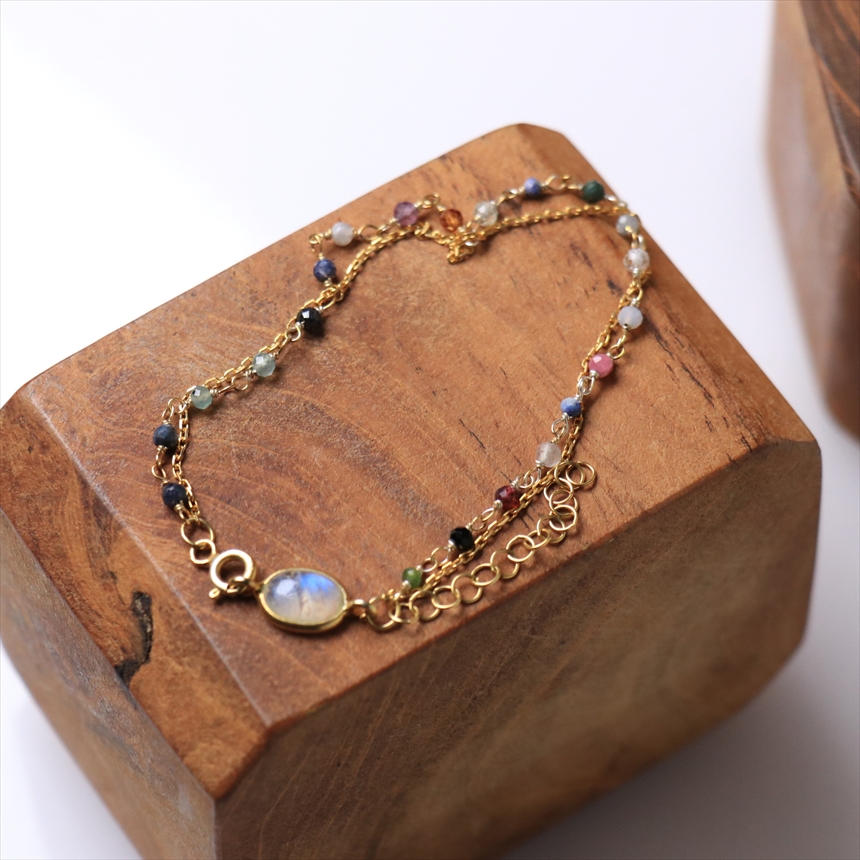 ミックスカラーの小粒のトルマリンビーズとシルバーチェーンの2連ブレスレット。きれいなシラーのはいったムーンストーンがアクセントです。優し気な色合いのストーンと華奢なゴールドチェーンが手元をきれいにみせてくれます。