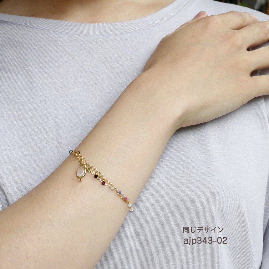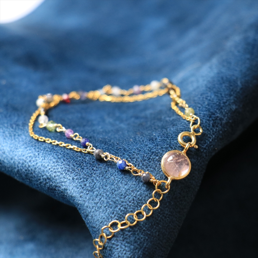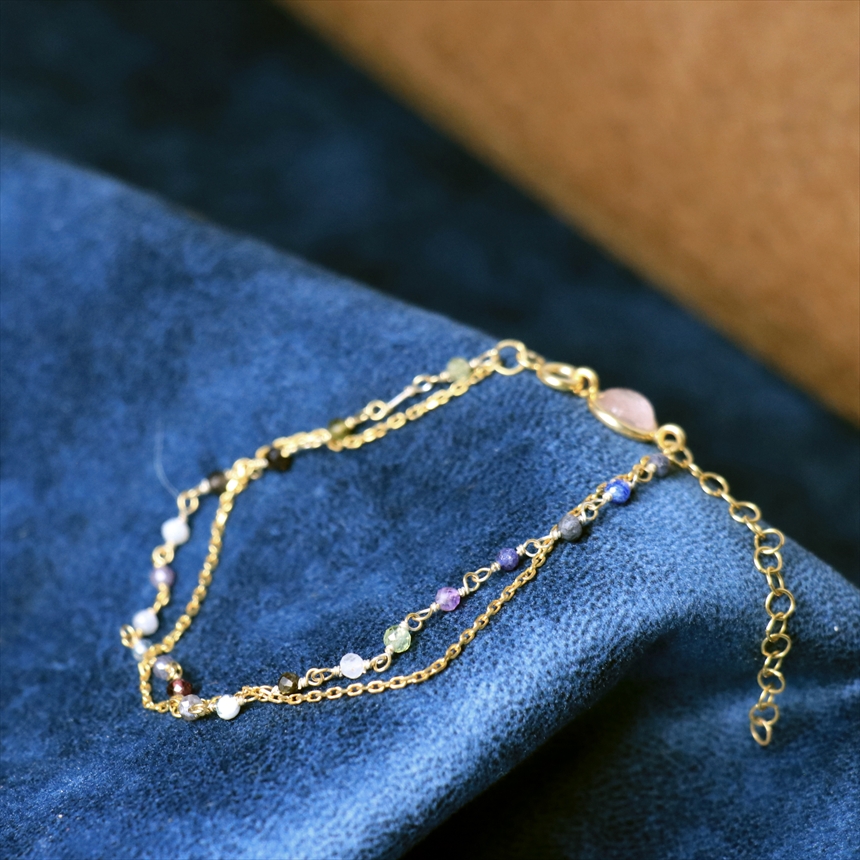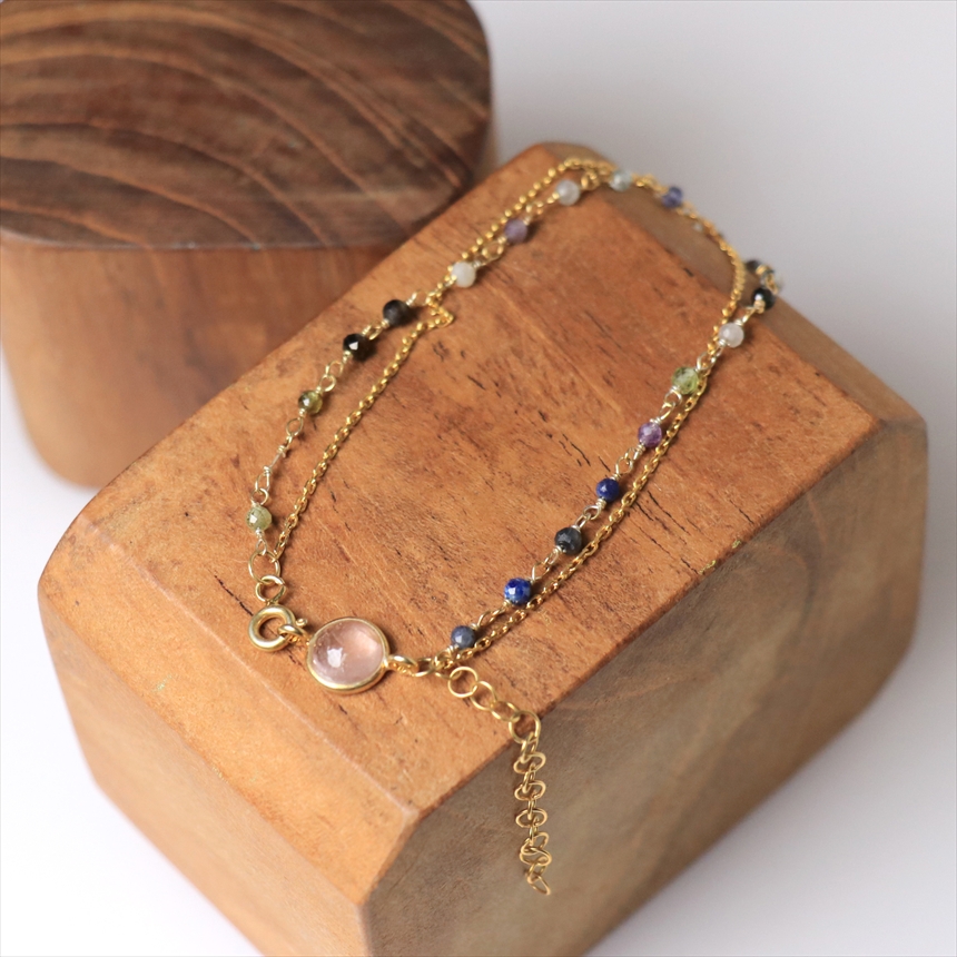 ミックスカラーの小粒のトルマリンビーズとシルバーチェーンの2連ブレスレット。透明感のあるローズクォーツがアクセントです。優し気な色合いのストーンと華奢なゴールドチェーンが手元をきれいにみせてくれます。