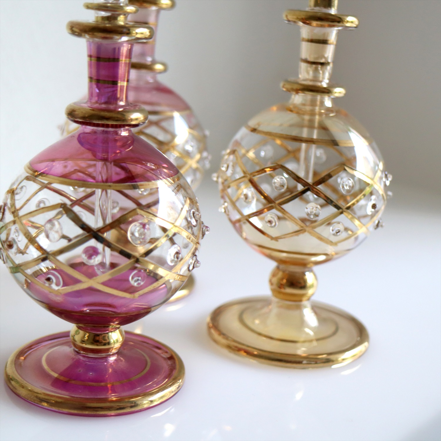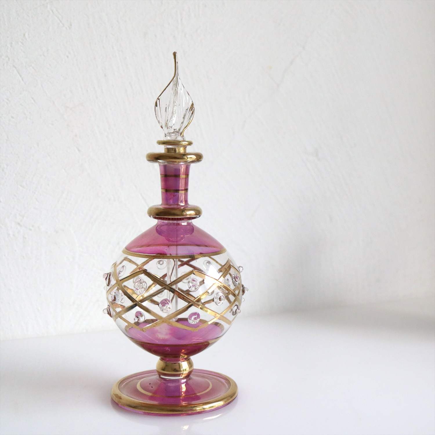 丸く膨らんだガラスの中央に、斜めに交差したゴールドの線でデコレーションされた香水瓶。エジプトのカイロにて、一つ一つ手作りされています。