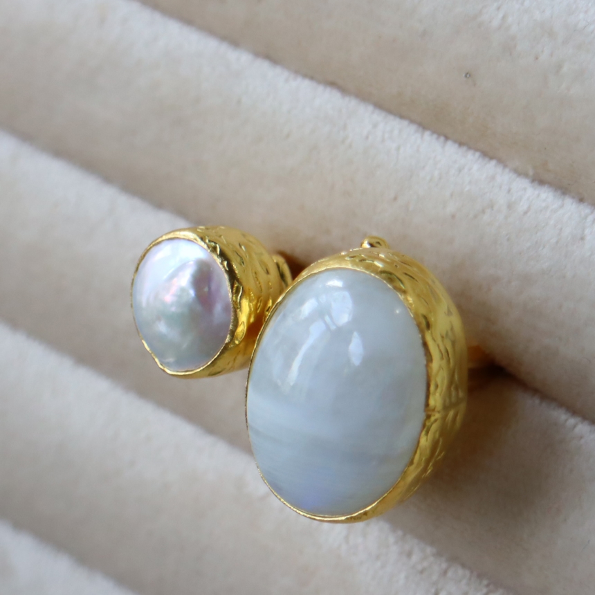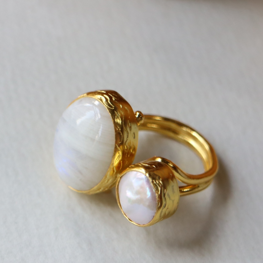 ムーンストーンの幻想的な輝きと、パールの優雅な光沢が上品で華やかな印象のリングです。大粒のムーンストーンは見る角度によって虹のような青いシラーを放ちます。ボリュームがありますが、つけてみると二本の指の上におさまりがよく、それぞれつけているように見えるので違和感なくおすすめです。