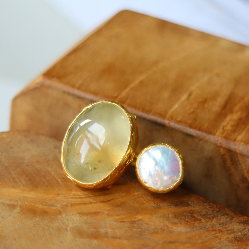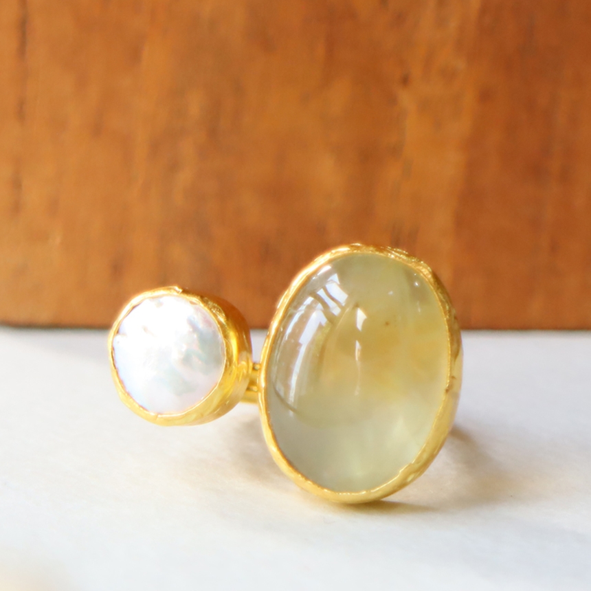 大粒のオーバル型のぷっくりとしたプレナイトとパールが並んだリングです。淡いくすみグリーンのプレナイトの中には線状のインクルージョンが自然のままに見られます。ボリュウムがありますが、つけてみると二本の指の上におさまりがよく、それぞれつけているように見えるので違和感なくおすすめです。