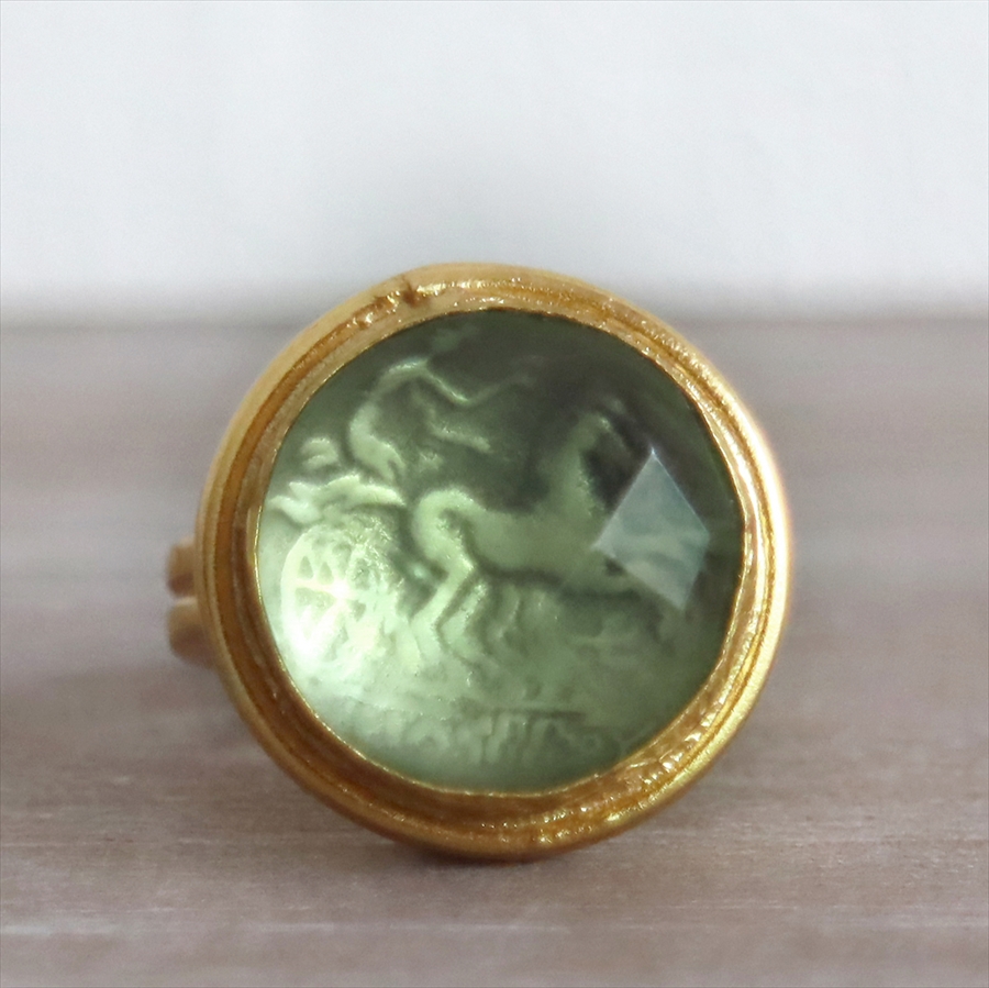 コインの上にハイドログリーンアメシスト、そしてその上にガラスがかぶせられたユニークなデザインのコインリング。、つや消しのイエローゴールドカラーに縁取られた、透き通るようなグリーンカラーの下には、馬車に乗る人が彫られたコインが透けて見えます。ドーム型にローズカットが施されているので、光を反射しきらきらと優し気に輝きます。※ハイドログリーンアメシストとは、人工的に熱処理を施し合成させたもので、天然のアメシストと同じ組成です。