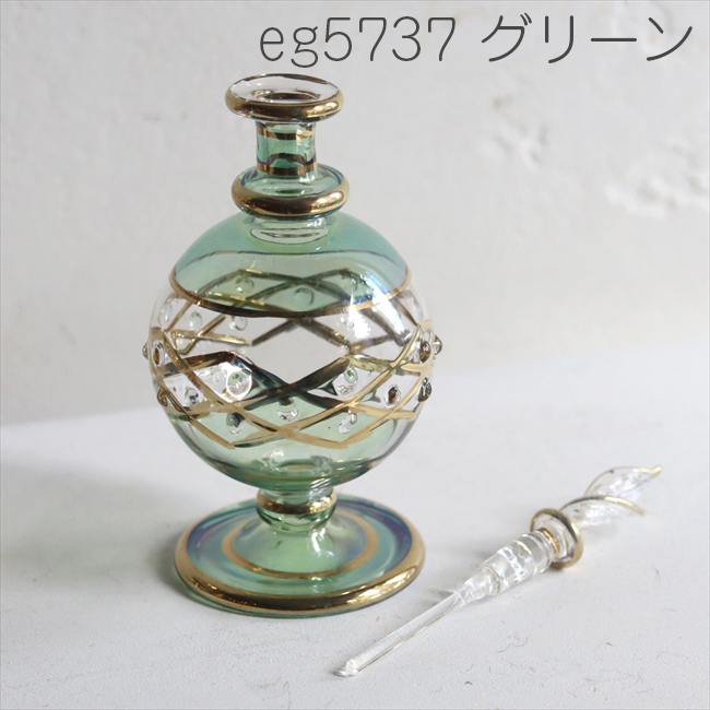丸く膨らんだガラスの中央に、斜めに交差したゴールドの線でデコレーションされた香水瓶。エジプトのカイロにて、一つ一つ手作りされています。