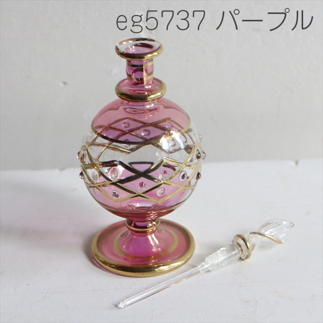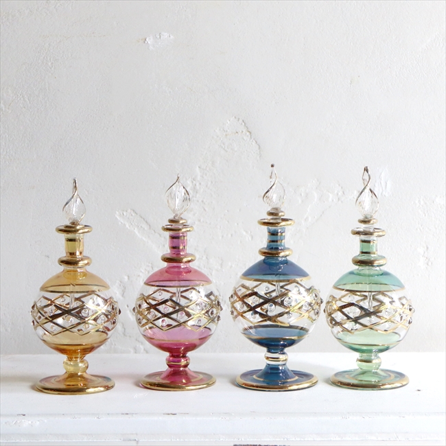 丸く膨らんだガラスの中央に、斜めに交差したゴールドの線でデコレーションされた香水瓶。エジプトのカイロにて、一つ一つ手作りされています。