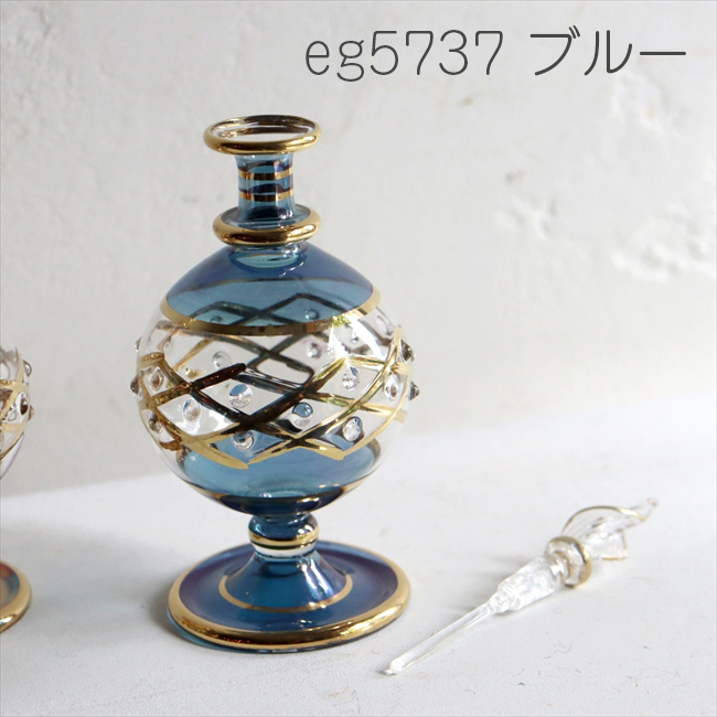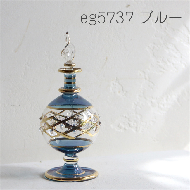 丸く膨らんだガラスの中央に、斜めに交差したゴールドの線でデコレーションされた香水瓶。エジプトのカイロにて、一つ一つ手作りされています。