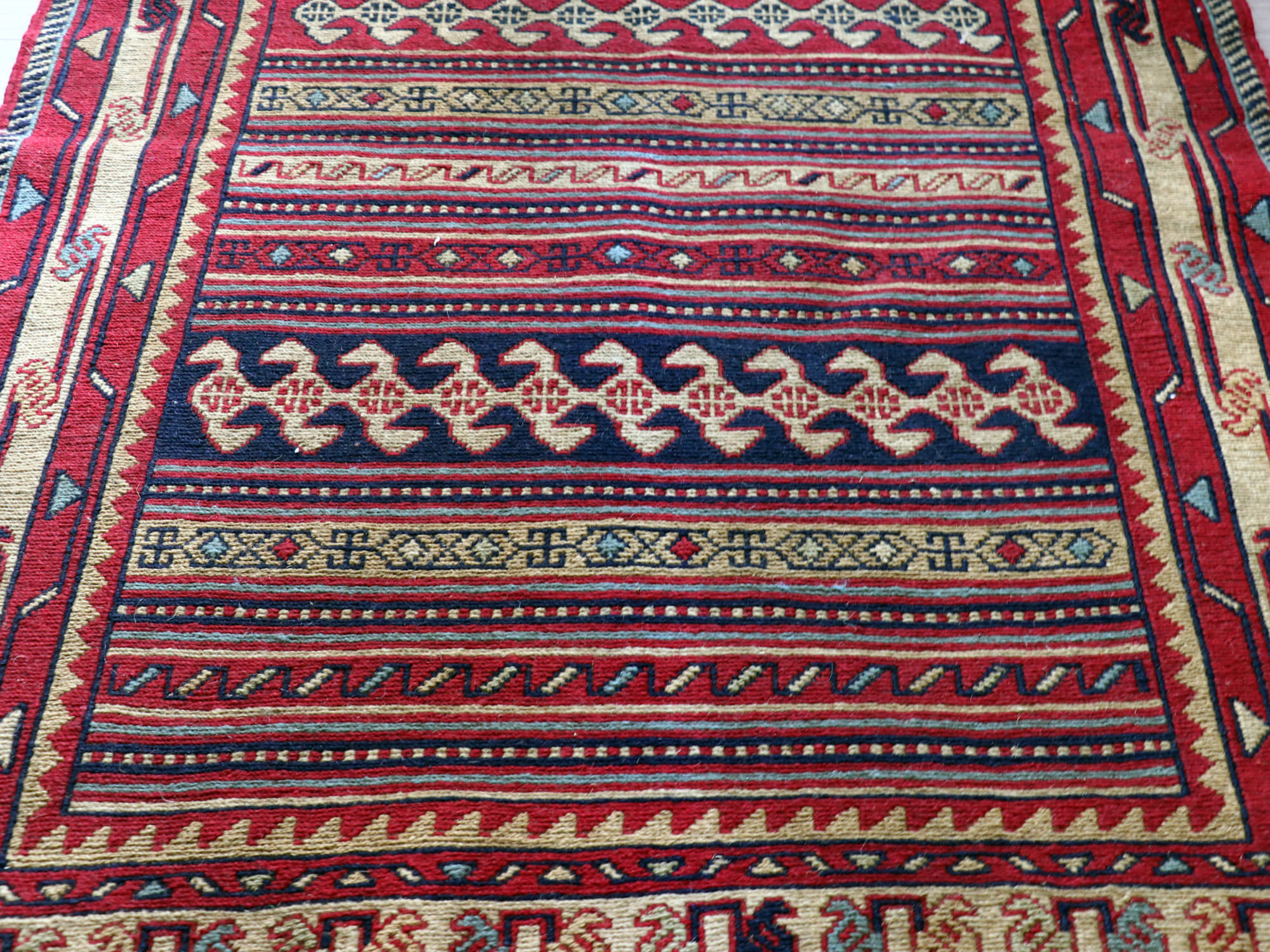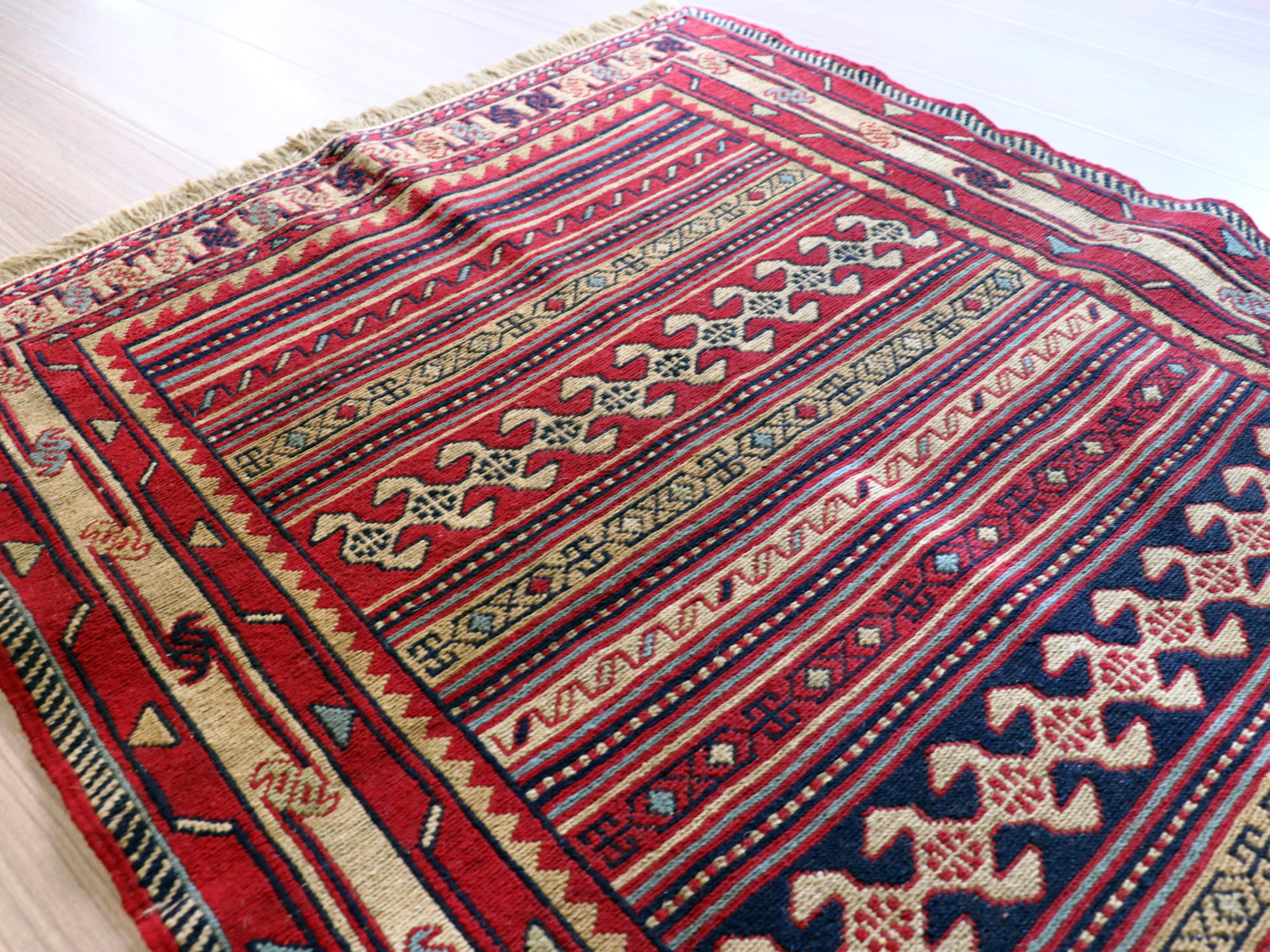 表面は刺繍のように見えますが、これは後から刺したものではなく、キリムを織るときに、縦糸と横糸のほかにもう一本飾り糸を前後しながら絡めて織ってゆくスマックという技法です。