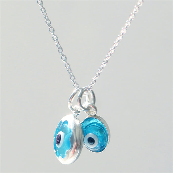 同系色の小さなチャームをふたつ組み合わせ、控えめながらも視線の集まるユニークなペンダント。フェニキア時代の古代より地中海に伝わる青い目玉のお守り“ナザルボンジュウ”。魔よけのお守り~と説明されることが多いのですが、悪魔祓いというよりは、他人からのやっかみやジェラシーの目から、自分を守ってくれるためのお守りなのです。ガラスの目玉が割れてしまったときは、自分の代わりにナザルボンジュウが、他人の視線を受け止めてくれた…ということなのだとか。